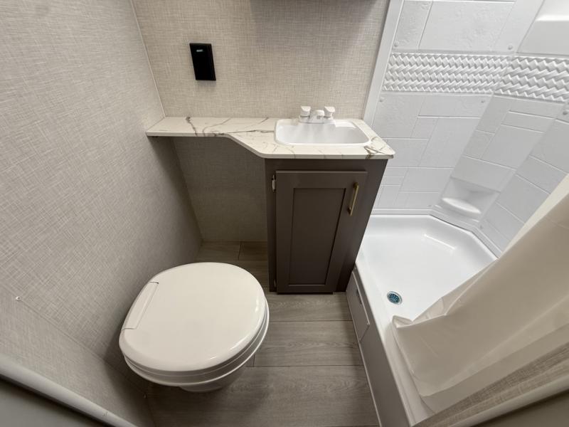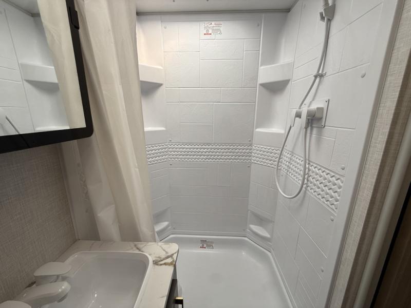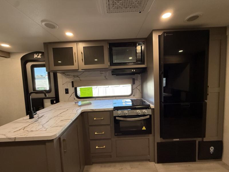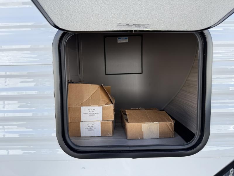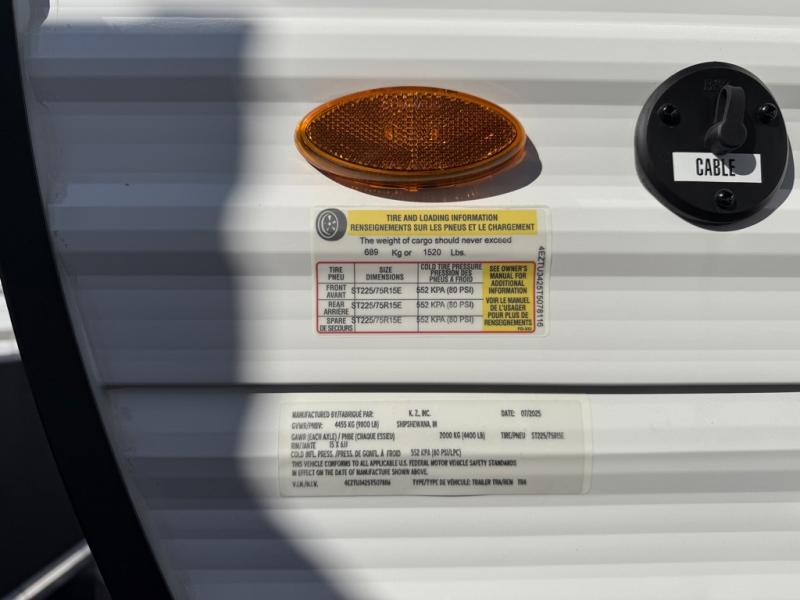 Each Sportsmen SE travel trailer and toy hauler by KZ is constructed with KZ exclusive tough shield exterior metal, a one-piece seamless walk-on Tufflex roofing material, and diamond plate rock guard to protect your unit from road debris. You will appreciate the extra large baggage doors for stowing away your gear when not in use, and tinted windows to help keep the harmful sun rays out plus keeping it cooler inside. Some of the exterior conveniences found in the mandatory Advantage Package are the solid folding steps with a large folding grab handle for easy entry and exit, a full glass friction hinged entry door, plus an exterior shower for your pets or to rinse off before you head inside. You'll also appreciate the nitrogen-filled tires, solar and backup camera prep, plus a Leash Latch with a bonus beverage opener. You'll feel right at home inside with linoleum flooring throughout, a 13,500 BTU air conditioner, large overhead cabinets, a shower surround, and much more!