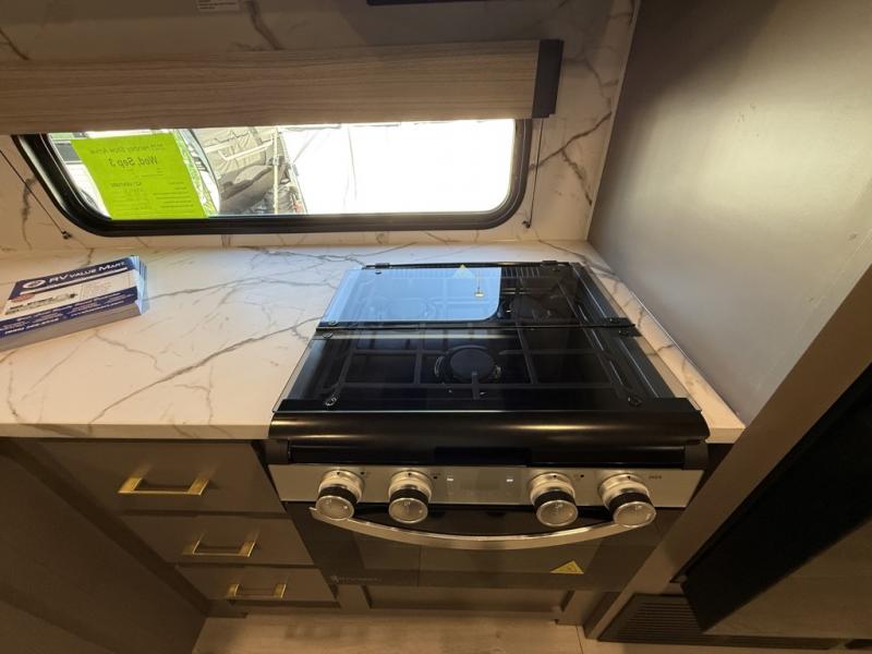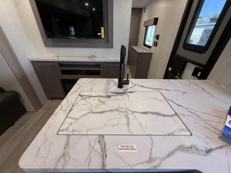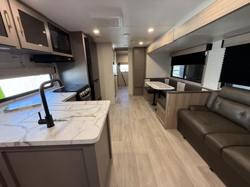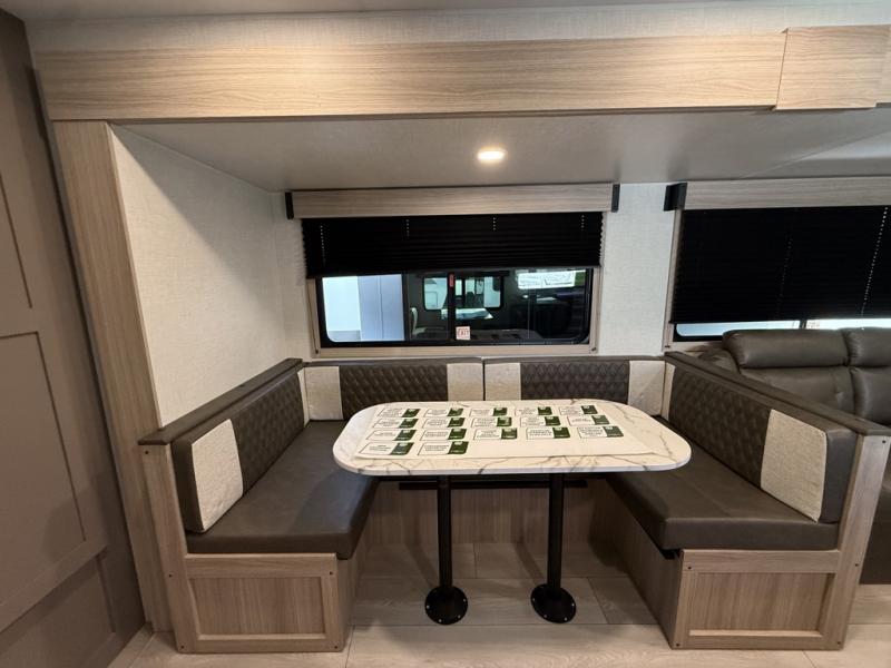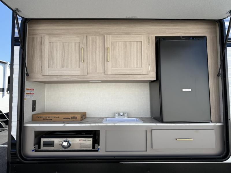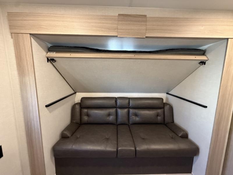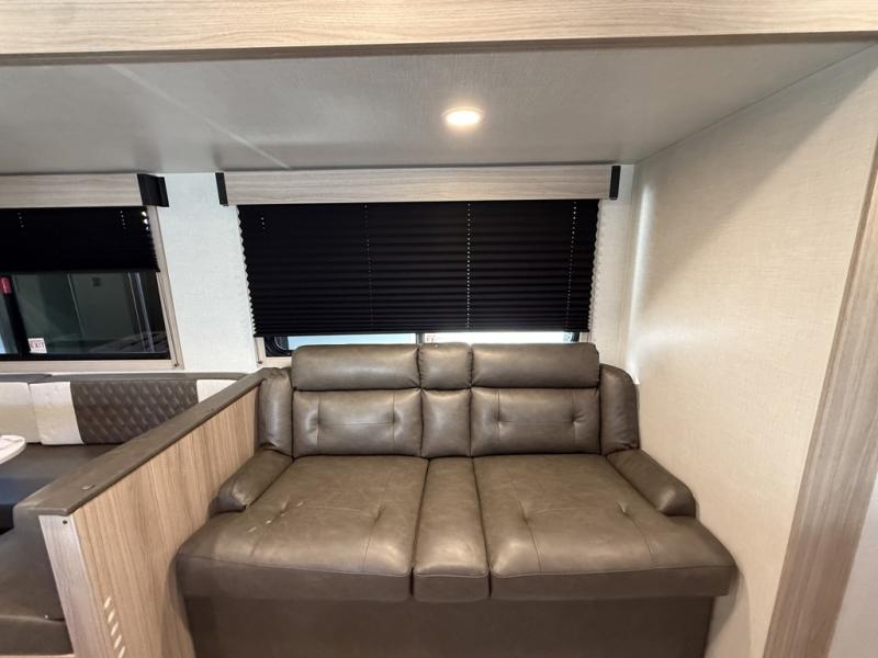 If you've been looking for a travel trailer with plenty of space for your family or group of friends, look no further than this one! The private bunkhouse includes a bunk/closet plus a jackknife sofa with a hinge bunk above. And the full bath is close by for convenience. Everyone can gather in the main living area at the U-shaped dinette, and there is a sofa here for more seating space. If the weather is nice, head outdoors to relax under the 20' power awning with LED lights as the cook prepares dinner on the outside griddle!