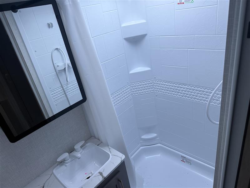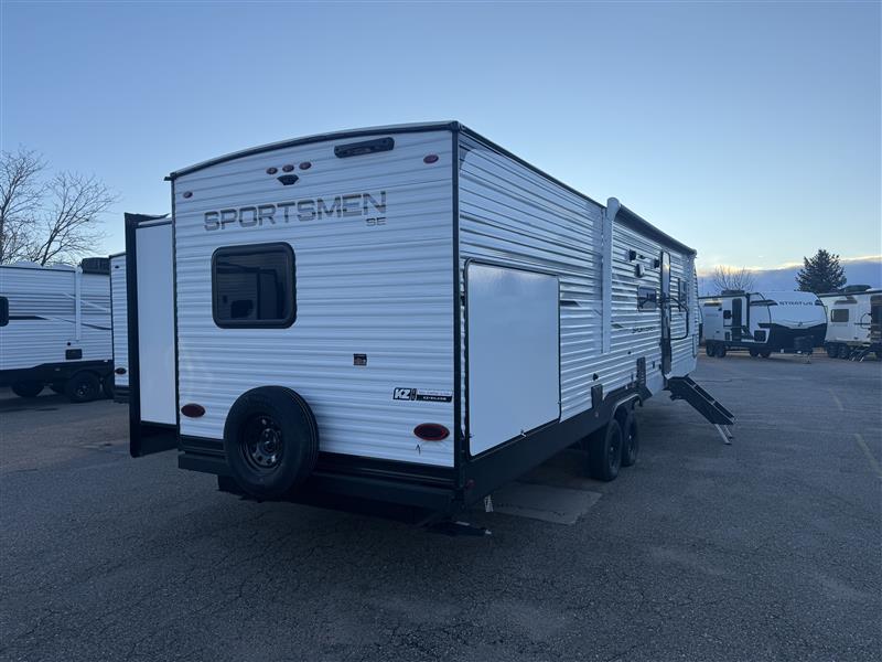 Each Sportsmen SE travel trailer and toy hauler by KZ is constructed with KZ exclusive tough shield exterior metal, a one-piece seamless walk-on Tufflex roofing material, and diamond plate rock guard to protect your unit from road debris. You will appreciate the extra large baggage doors for stowing away your gear when not in use, and tinted windows to help keep the harmful sun rays out plus keeping it cooler inside. Some of the exterior conveniences found in the mandatory Advantage Package are the solid folding steps with a large folding grab handle for easy entry and exit, a full glass friction hinged entry door, plus an exterior shower for your pets or to rinse off before you head inside. You'll also appreciate the nitrogen-filled tires, solar and backup camera prep, plus a Leash Latch with a bonus beverage opener. You'll feel right at home inside with linoleum flooring throughout, a 13,500 BTU air conditioner, large overhead cabinets, a shower surround, and much more!