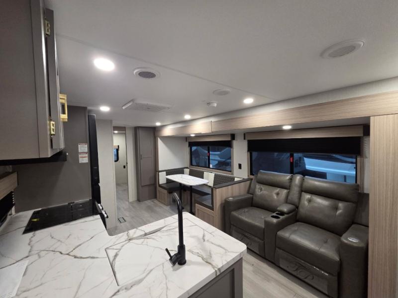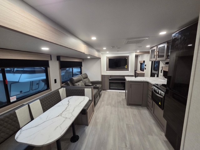 If you've been looking for a travel trailer with plenty of space for your family or group of friends, look no further than this one! The private bunkhouse includes a bunk/closet plus a jackknife sofa with a hinge bunk above. And the full bath is close by for convenience. Everyone can gather in the main living area at the U-shaped dinette, and there is a sofa here for more seating space. If the weather is nice, head outdoors to relax under the 20' power awning with LED lights as the cook prepares dinner on the outside griddle!