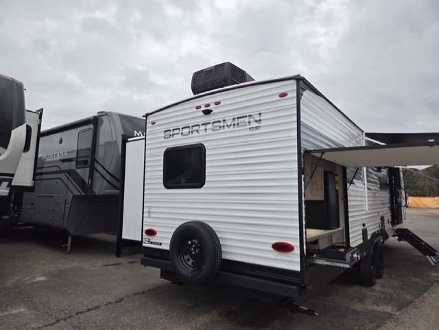 Each Sportsmen SE travel trailer and toy hauler by KZ is constructed with KZ exclusive tough shield exterior metal, a one-piece seamless walk-on Tufflex roofing material, and diamond plate rock guard to protect your unit from road debris. You will appreciate the extra large baggage doors for stowing away your gear when not in use, and tinted windows to help keep the harmful sun rays out plus keeping it cooler inside. Some of the exterior conveniences found in the mandatory Advantage Package are the solid folding steps with a large folding grab handle for easy entry and exit, a full glass friction hinged entry door, plus an exterior shower for your pets or to rinse off before you head inside. You'll also appreciate the nitrogen-filled tires, solar and backup camera prep, plus a Leash Latch with a bonus beverage opener. You'll feel right at home inside with linoleum flooring throughout, a 13,500 BTU air conditioner, large overhead cabinets, a shower surround, and much more!