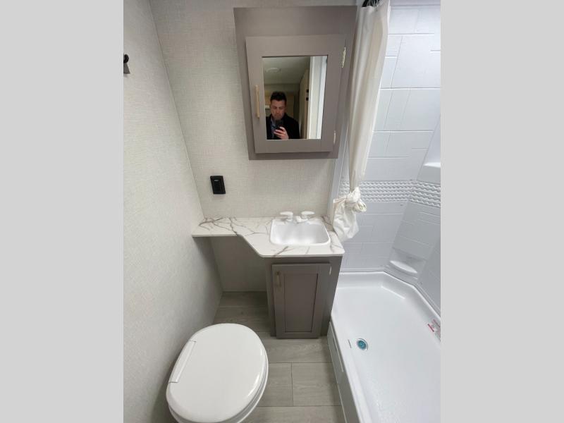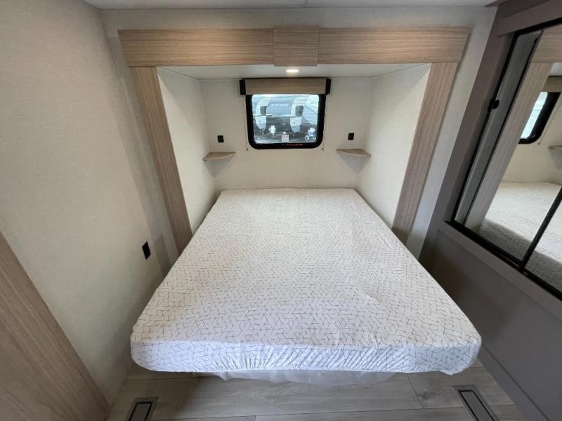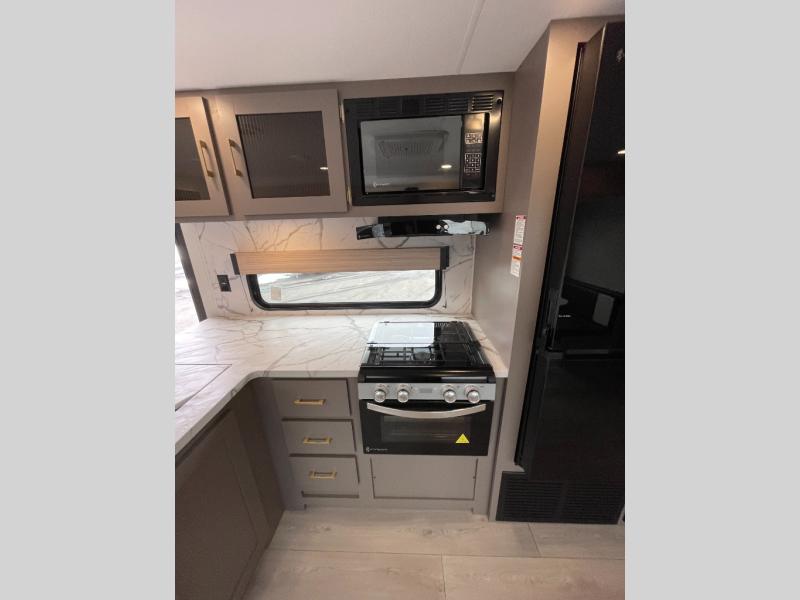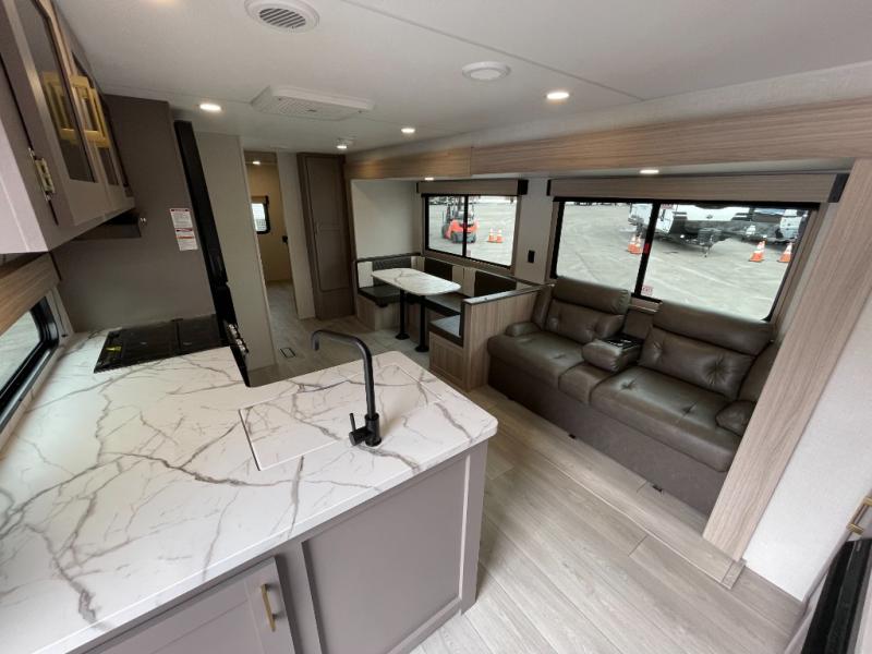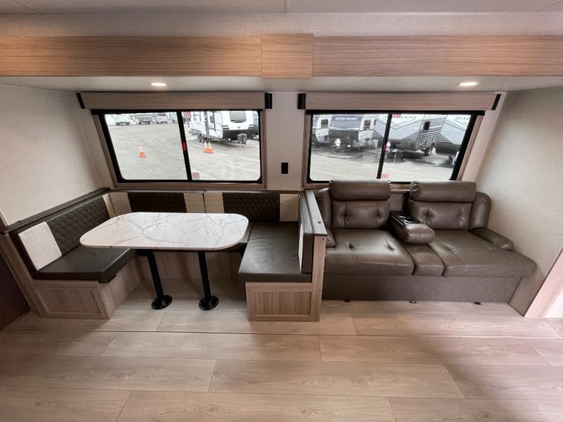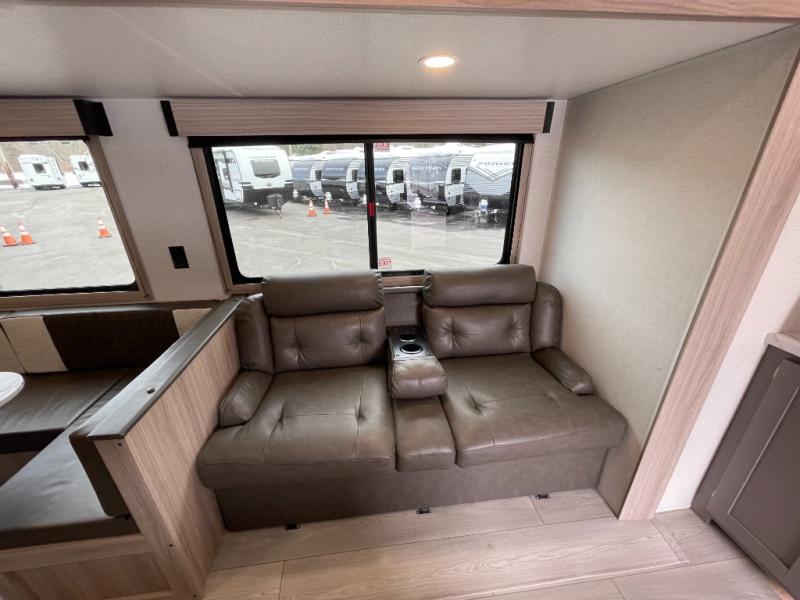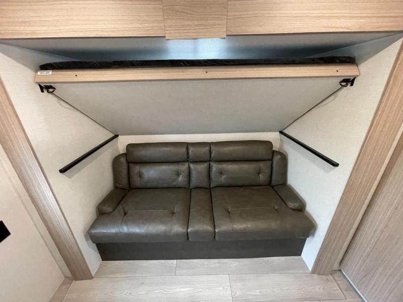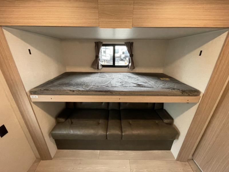If you've been looking for a travel trailer with plenty of space for your family or group of friends, look no further than this one! The private bunkhouse includes a bunk/closet plus a jackknife sofa with a hinge bunk above. And the full bath is close by for convenience. Everyone can gather in the main living area at the U-shaped dinette, and there is a sofa here for more seating space. If the weather is nice, head outdoors to relax under the 20' power awning with LED lights as the cook prepares dinner on the outside griddle!