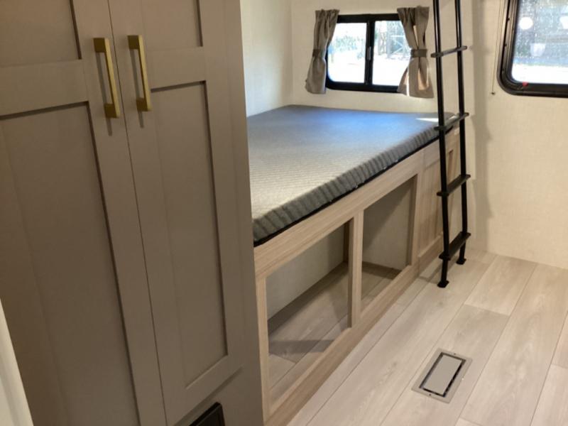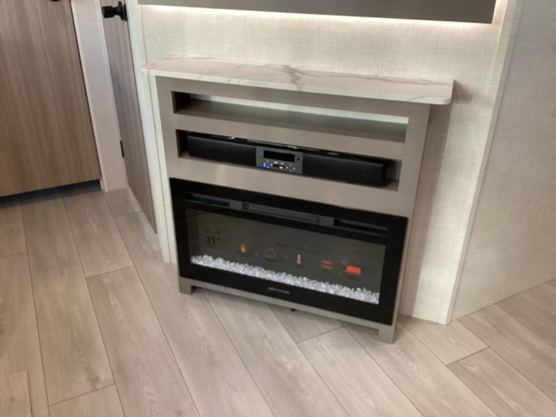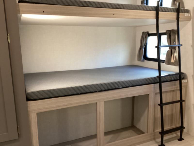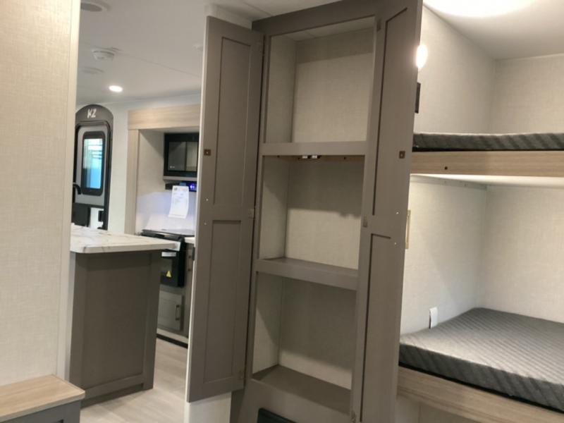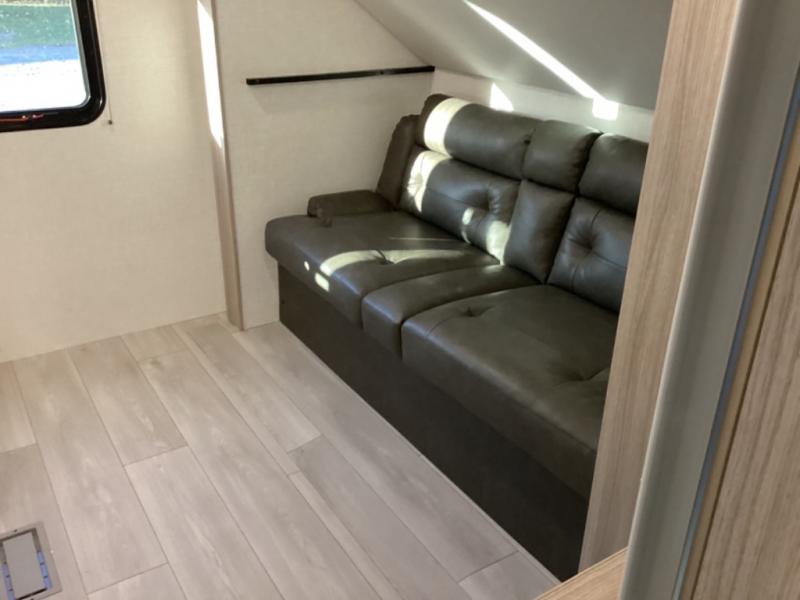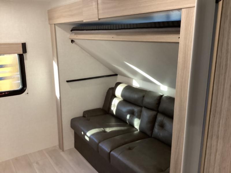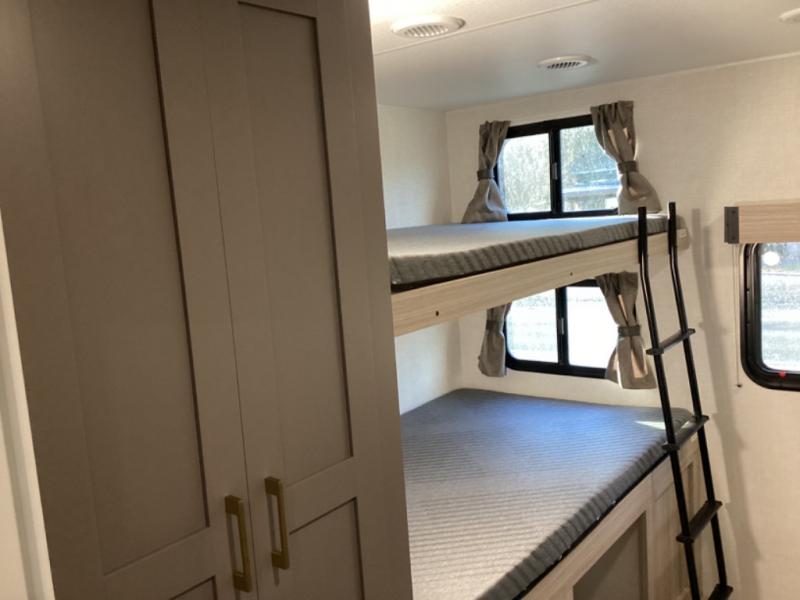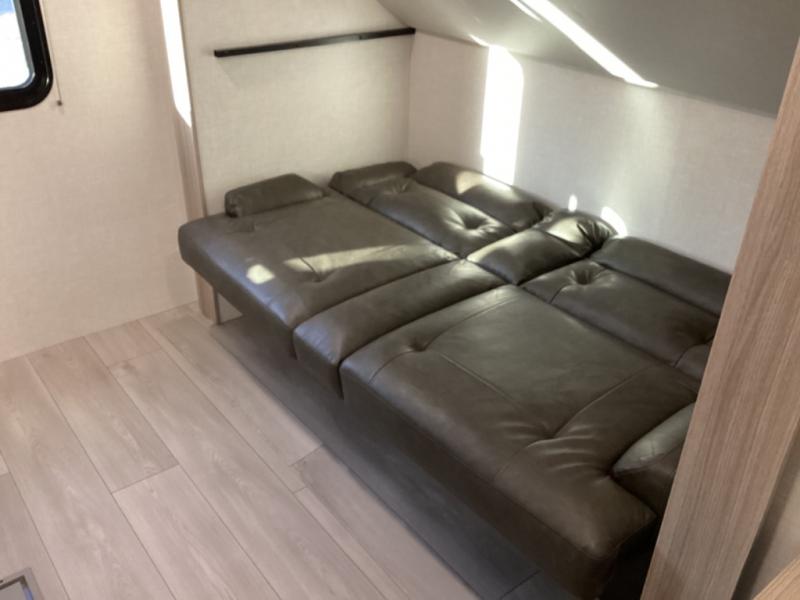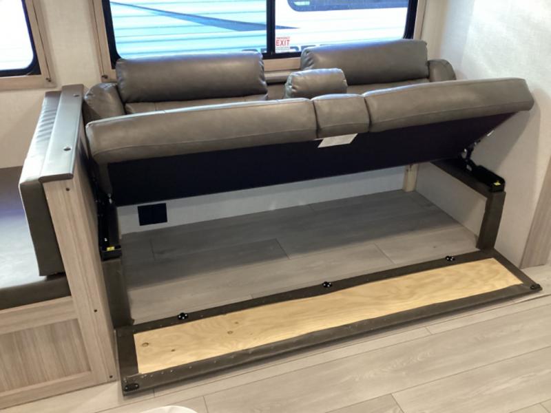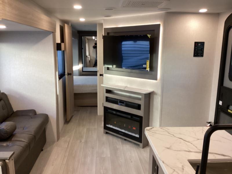 If you've been looking for a travel trailer with plenty of space for your family or group of friends, look no further! The private bunkhouse includes a set of bunks plus a jackknife sofa with a hinge bunk above. Everyone can gather in the main living area at the booth dinette, and there is a second jackknife sofa here for more seating while you watch a movie cozied up by the fireplace.You will love how spacious is the front bedroom that includes tons of storage options featuring a large wardrobe, a dresser and even storage with washer and dryer prep! If the weather is nice, head outdoors to relax under the 16' power awning as the cook prepares dinner on the outside griddle!