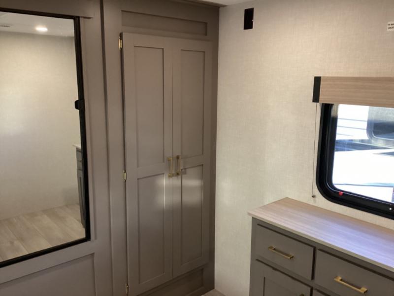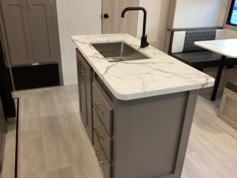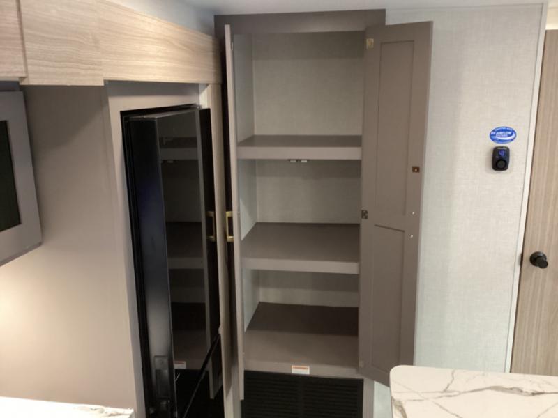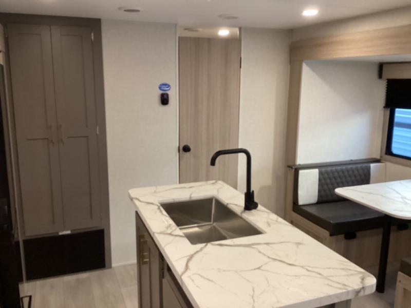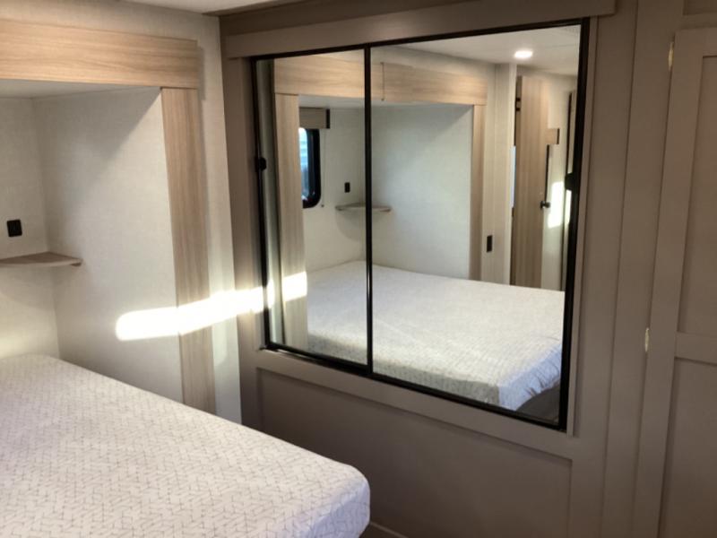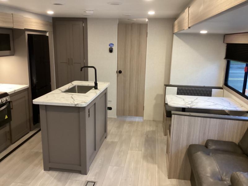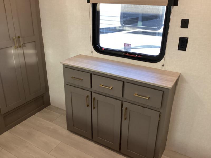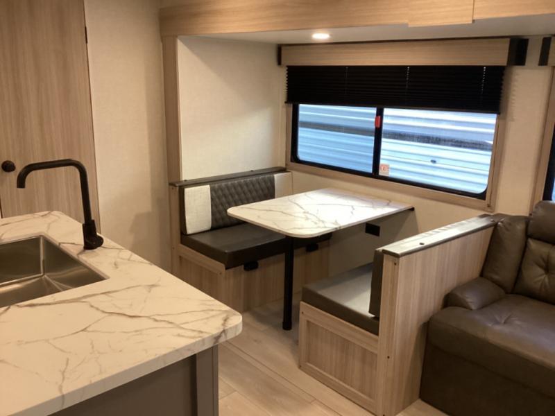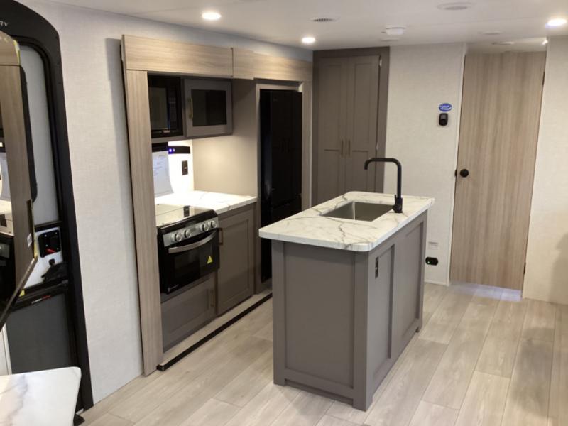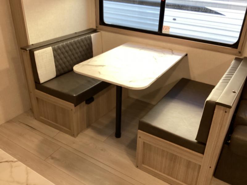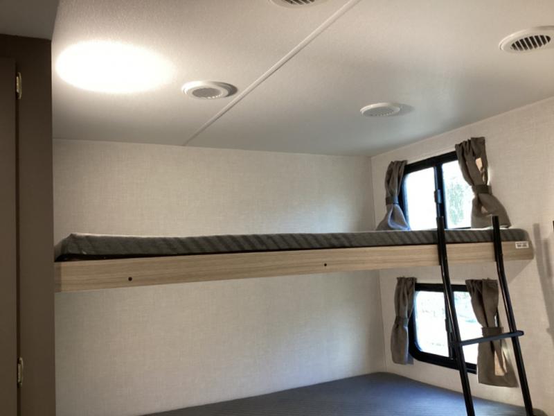 If you've been looking for a travel trailer with plenty of space for your family or group of friends, look no further! The private bunkhouse includes a set of bunks plus a jackknife sofa with a hinge bunk above. Everyone can gather in the main living area at the booth dinette, and there is a second jackknife sofa here for more seating while you watch a movie cozied up by the fireplace.You will love how spacious is the front bedroom that includes tons of storage options featuring a large wardrobe, a dresser and even storage with washer and dryer prep! If the weather is nice, head outdoors to relax under the 16' power awning as the cook prepares dinner on the outside griddle!