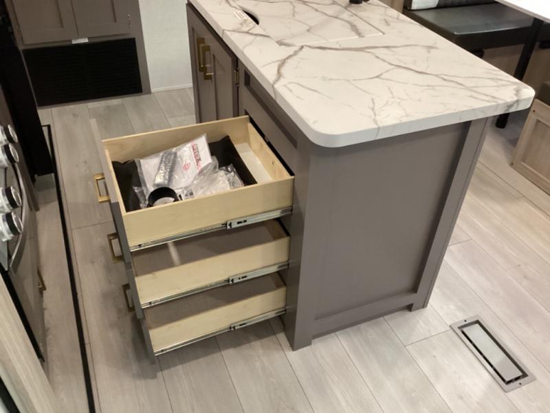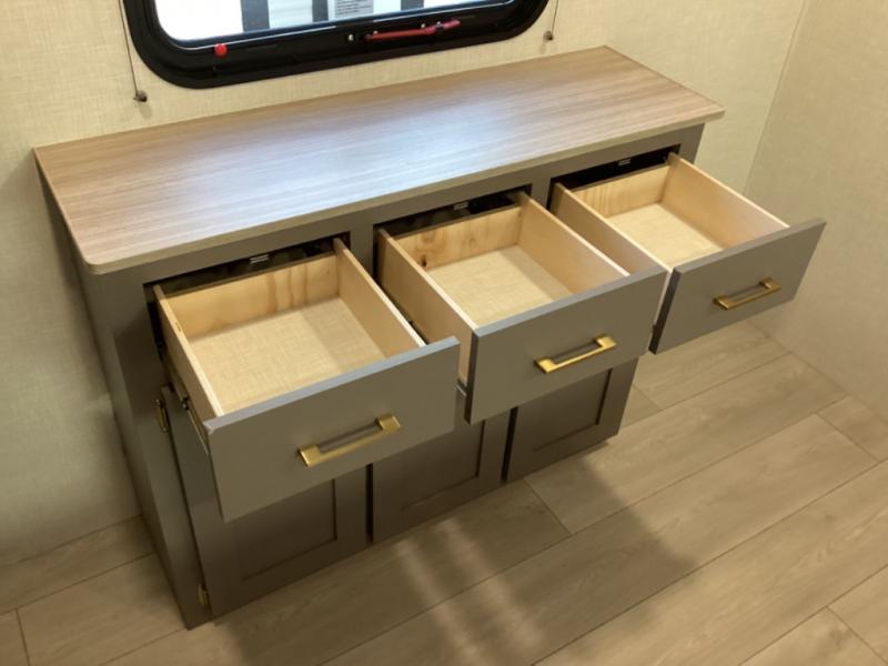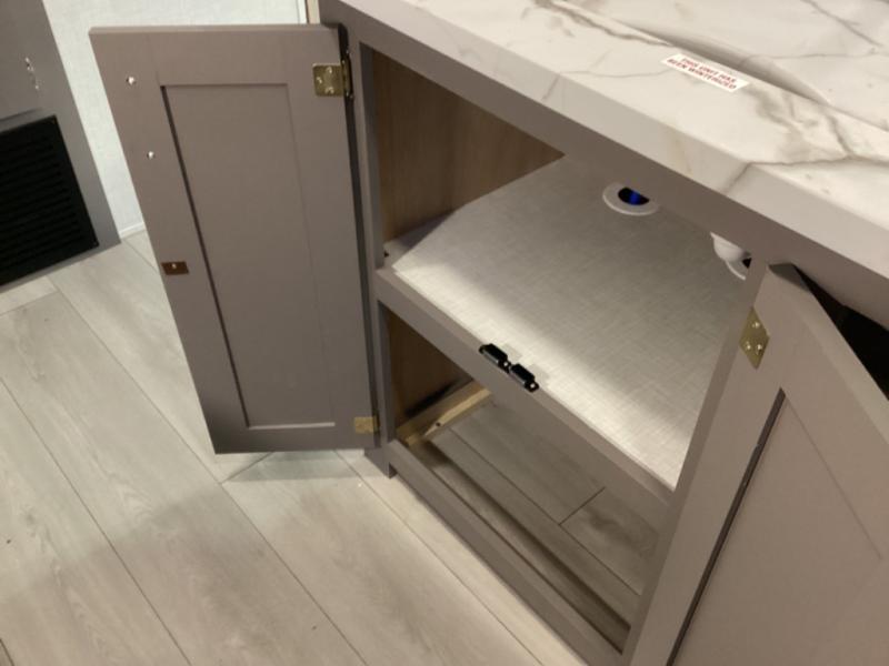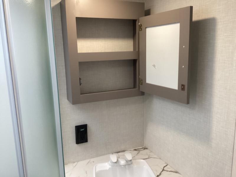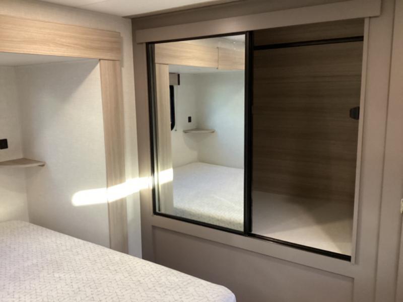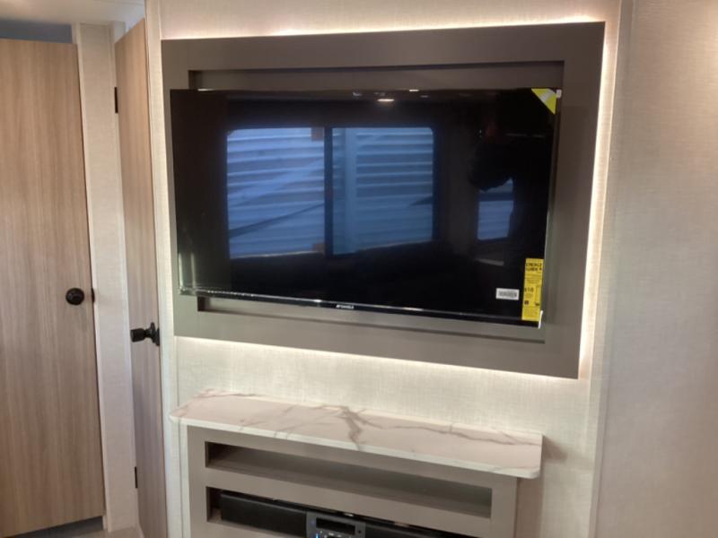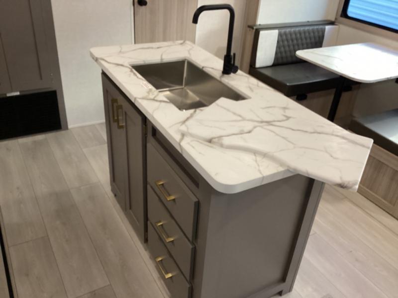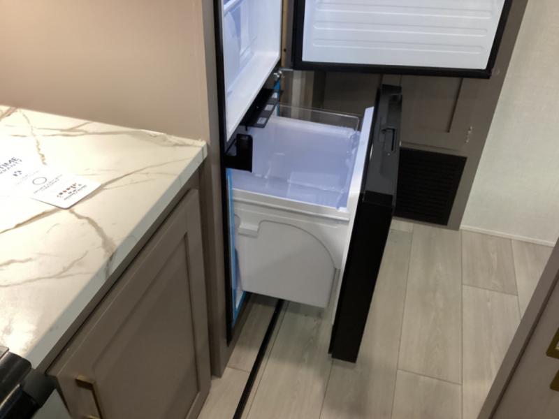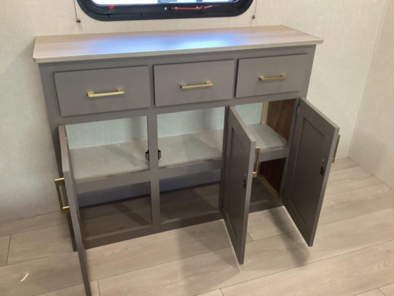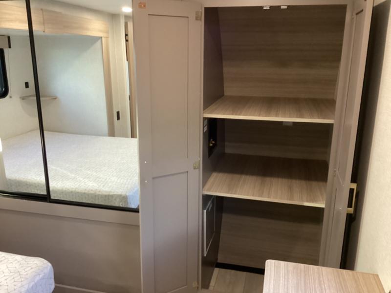 If you've been looking for a travel trailer with plenty of space for your family or group of friends, look no further! The private bunkhouse includes a set of bunks plus a jackknife sofa with a hinge bunk above. Everyone can gather in the main living area at the booth dinette, and there is a second jackknife sofa here for more seating while you watch a movie cozied up by the fireplace.You will love how spacious is the front bedroom that includes tons of storage options featuring a large wardrobe, a dresser and even storage with washer and dryer prep! If the weather is nice, head outdoors to relax under the 16' power awning as the cook prepares dinner on the outside griddle!