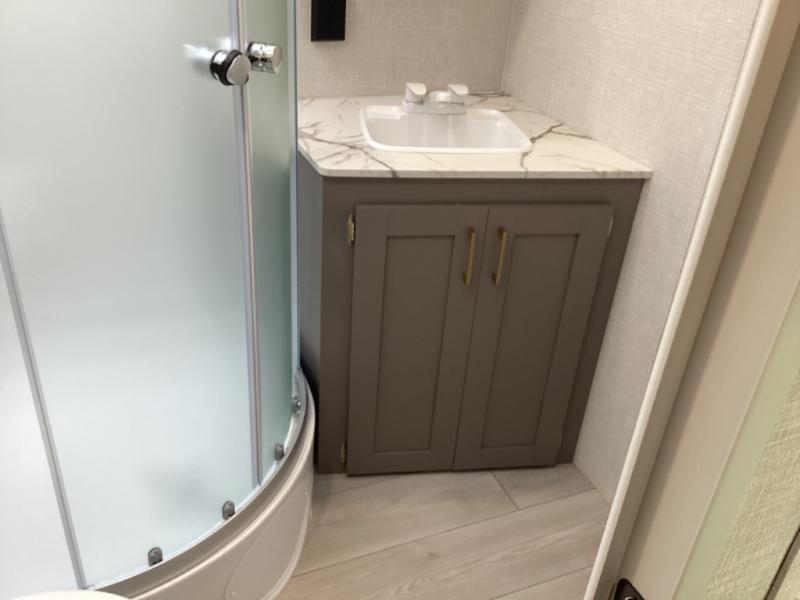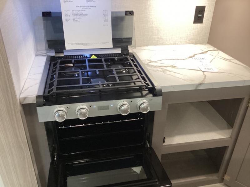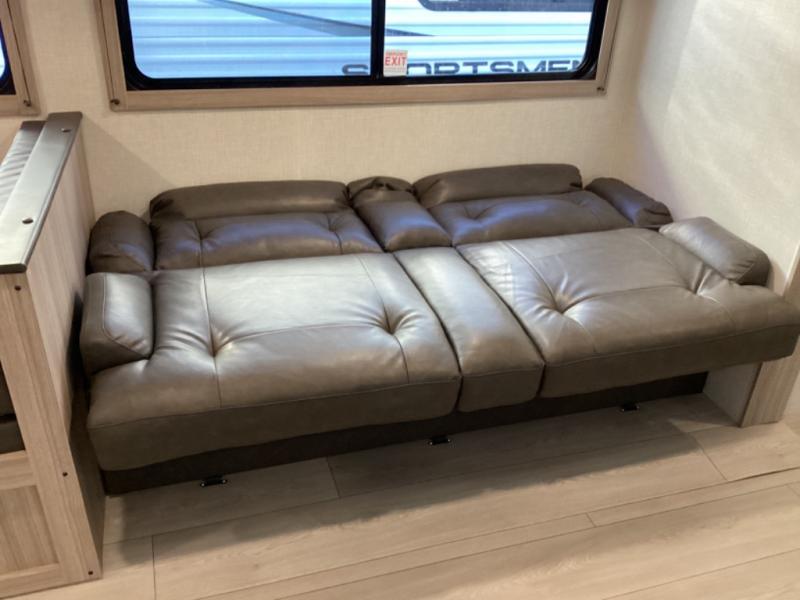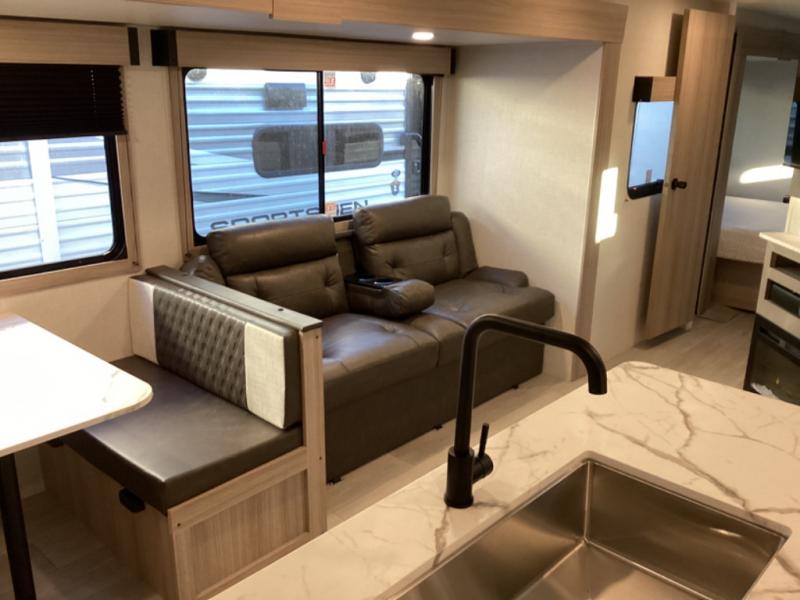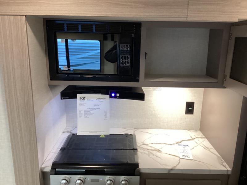 Each Sportsmen SE travel trailer and toy hauler by KZ is constructed with KZ exclusive tough shield exterior metal, a one-piece seamless walk-on Tufflex roofing material, and diamond plate rock guard to protect your unit from road debris. You will appreciate the extra large baggage doors for stowing away your gear when not in use, and tinted windows to help keep the harmful sun rays out plus keeping it cooler inside. Some of the exterior conveniences found in the mandatory Advantage Package are the solid folding steps with a large folding grab handle for easy entry and exit, a full glass friction hinged entry door, plus an exterior shower for your pets or to rinse off before you head inside. You'll also appreciate the nitrogen-filled tires, solar and backup camera prep, plus a Leash Latch with a bonus beverage opener. You'll feel right at home inside with linoleum flooring throughout, a 13,500 BTU air conditioner, large overhead cabinets, a shower surround, and much more!