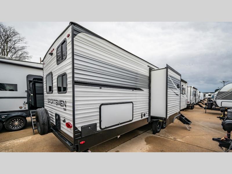 Each Sportsmen SE travel trailer and toy hauler by KZ is constructed with KZ exclusive tough shield exterior metal, a one-piece seamless walk-on Tufflex roofing material, and diamond plate rock guard to protect your unit from road debris. You will appreciate the extra large baggage doors for stowing away your gear when not in use, and tinted windows to help keep the harmful sun rays out plus keeping it cooler inside. Some of the exterior conveniences found in the mandatory Advantage Package are the solid folding steps with a large folding grab handle for easy entry and exit, a full glass friction hinged entry door, plus an exterior shower for your pets or to rinse off before you head inside. You'll also appreciate the nitrogen-filled tires, solar and backup camera prep, plus a Leash Latch with a bonus beverage opener. You'll feel right at home inside with linoleum flooring throughout, a 13,500 BTU air conditioner, large overhead cabinets, a shower surround, and much more!