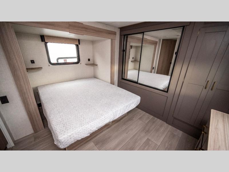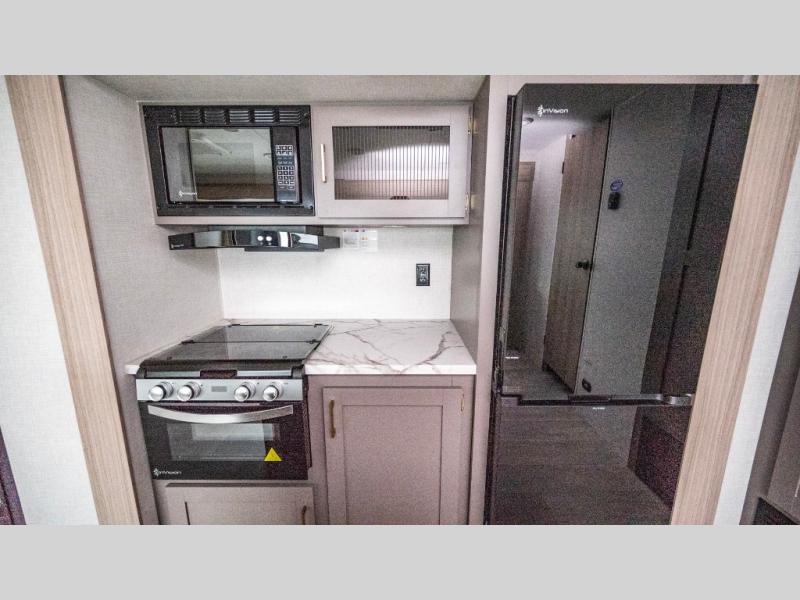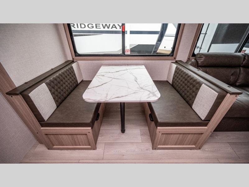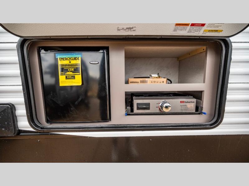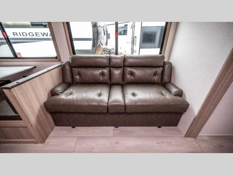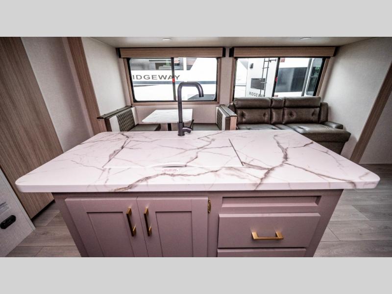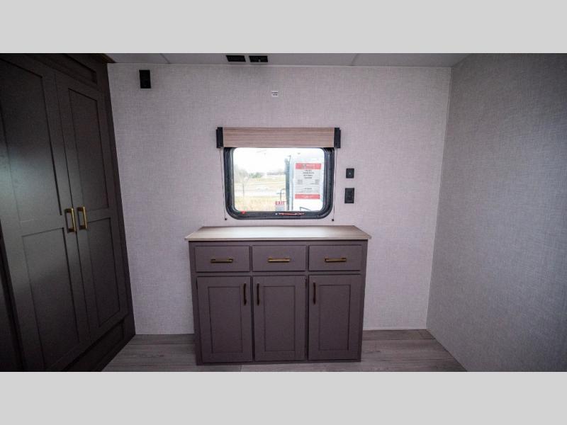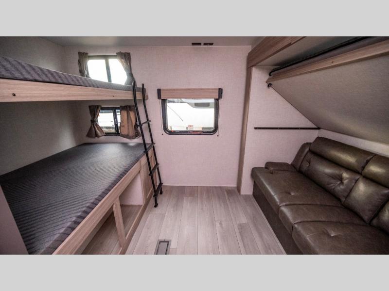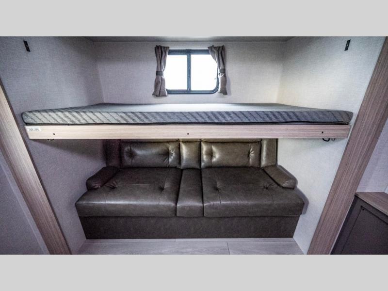 If you've been looking for a travel trailer with plenty of space for your family or group of friends, look no further! The private bunkhouse includes a set of bunks plus a jackknife sofa with a hinge bunk above. Everyone can gather in the main living area at the booth dinette, and there is a second jackknife sofa here for more seating while you watch a movie cozied up by the fireplace.You will love how spacious is the front bedroom that includes tons of storage options featuring a large wardrobe, a dresser and even storage with washer and dryer prep! If the weather is nice, head outdoors to relax under the 16' power awning as the cook prepares dinner on the outside griddle!