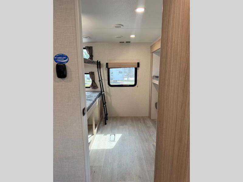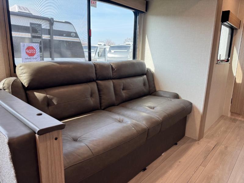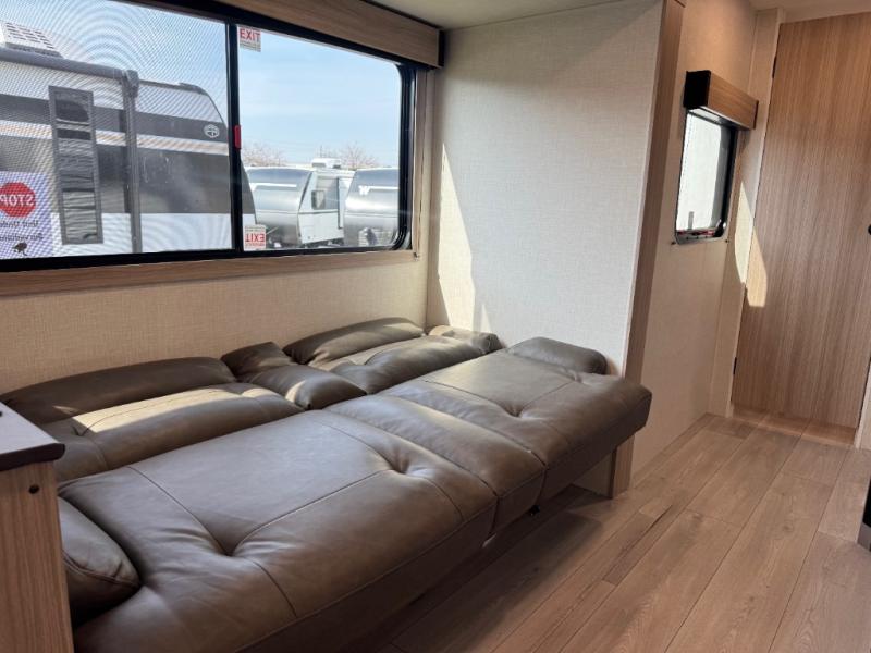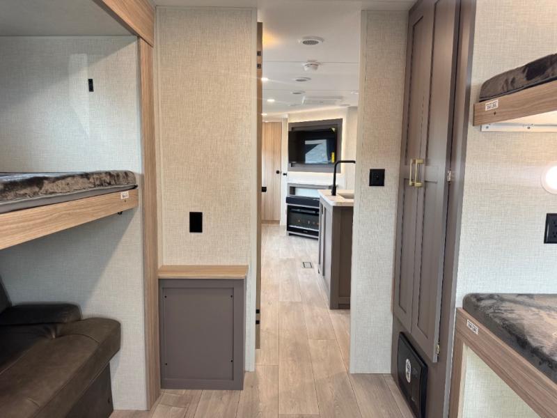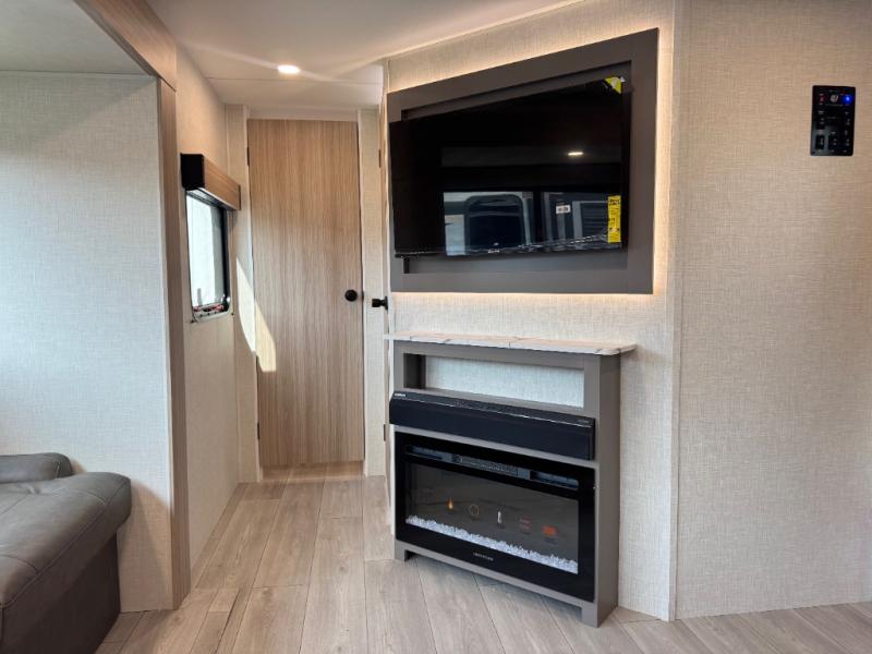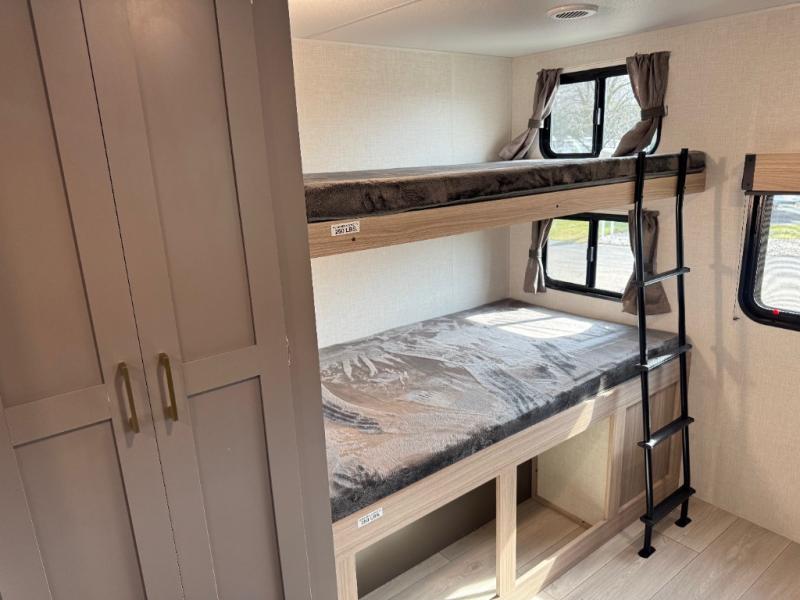 If you've been looking for a travel trailer with plenty of space for your family or group of friends, look no further! The private bunkhouse includes a set of bunks plus a jackknife sofa with a hinge bunk above. Everyone can gather in the main living area at the booth dinette, and there is a second jackknife sofa here for more seating while you watch a movie cozied up by the fireplace.You will love how spacious is the front bedroom that includes tons of storage options featuring a large wardrobe, a dresser and even storage with washer and dryer prep! If the weather is nice, head outdoors to relax under the 16' power awning as the cook prepares dinner on the outside griddle!