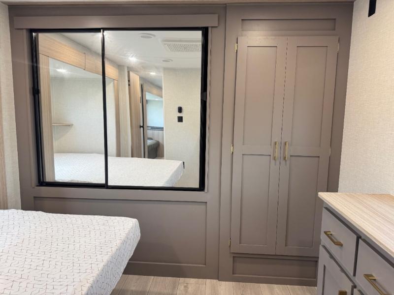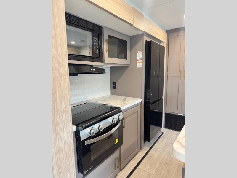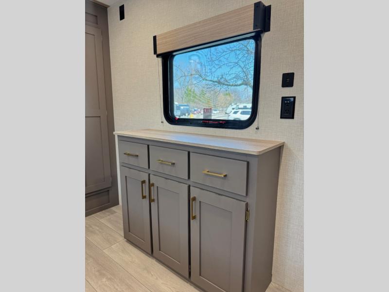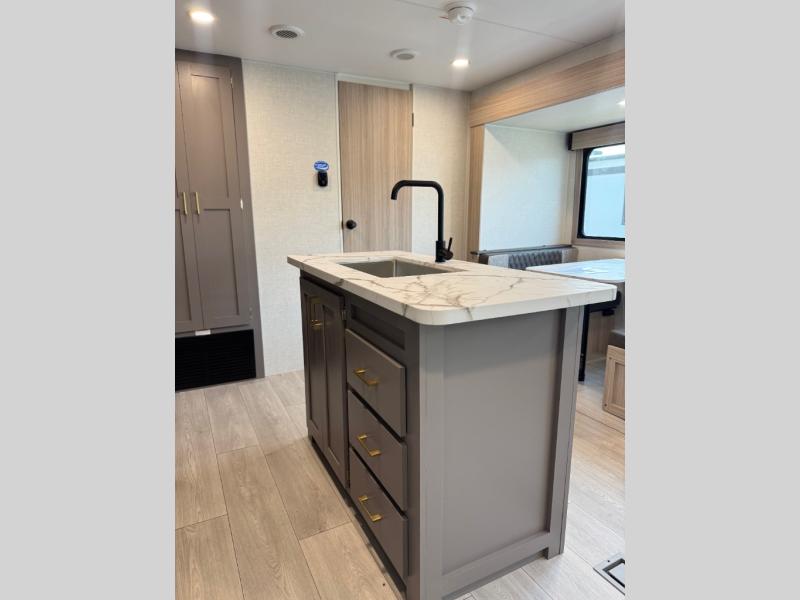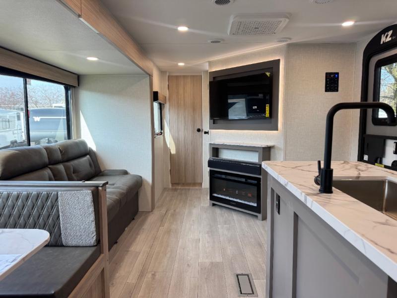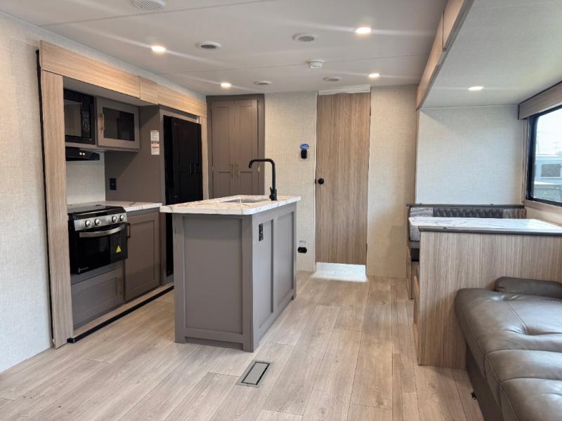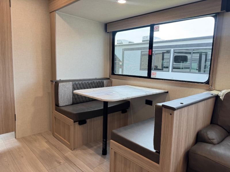 If you've been looking for a travel trailer with plenty of space for your family or group of friends, look no further! The private bunkhouse includes a set of bunks plus a jackknife sofa with a hinge bunk above. Everyone can gather in the main living area at the booth dinette, and there is a second jackknife sofa here for more seating while you watch a movie cozied up by the fireplace.You will love how spacious is the front bedroom that includes tons of storage options featuring a large wardrobe, a dresser and even storage with washer and dryer prep! If the weather is nice, head outdoors to relax under the 16' power awning as the cook prepares dinner on the outside griddle!