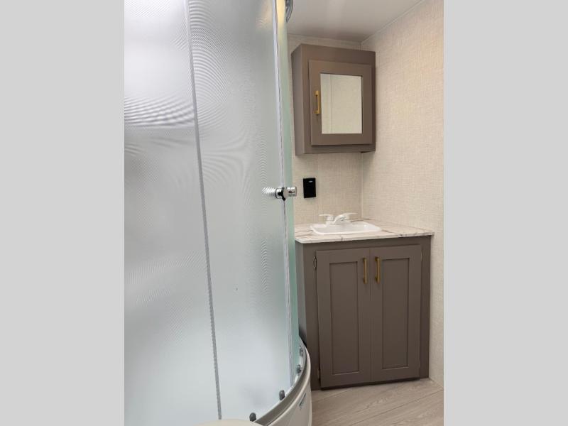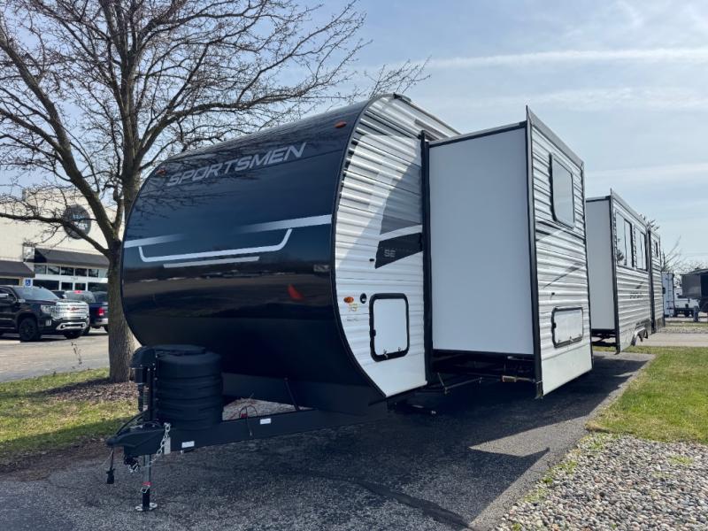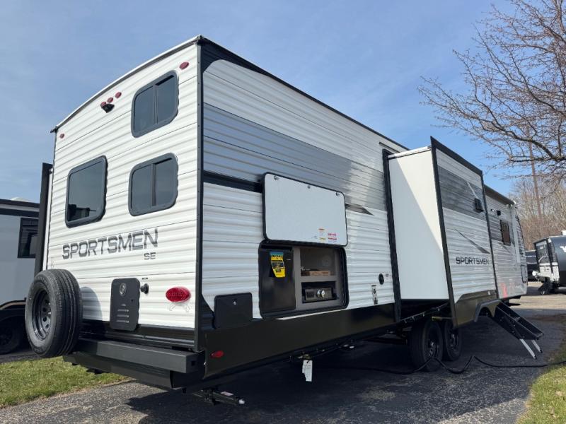 Each Sportsmen SE travel trailer and toy hauler by KZ is constructed with KZ exclusive tough shield exterior metal, a one-piece seamless walk-on Tufflex roofing material, and diamond plate rock guard to protect your unit from road debris. You will appreciate the extra large baggage doors for stowing away your gear when not in use, and tinted windows to help keep the harmful sun rays out plus keeping it cooler inside. Some of the exterior conveniences found in the mandatory Advantage Package are the solid folding steps with a large folding grab handle for easy entry and exit, a full glass friction hinged entry door, plus an exterior shower for your pets or to rinse off before you head inside. You'll also appreciate the nitrogen-filled tires, solar and backup camera prep, plus a Leash Latch with a bonus beverage opener. You'll feel right at home inside with linoleum flooring throughout, a 13,500 BTU air conditioner, large overhead cabinets, a shower surround, and much more!