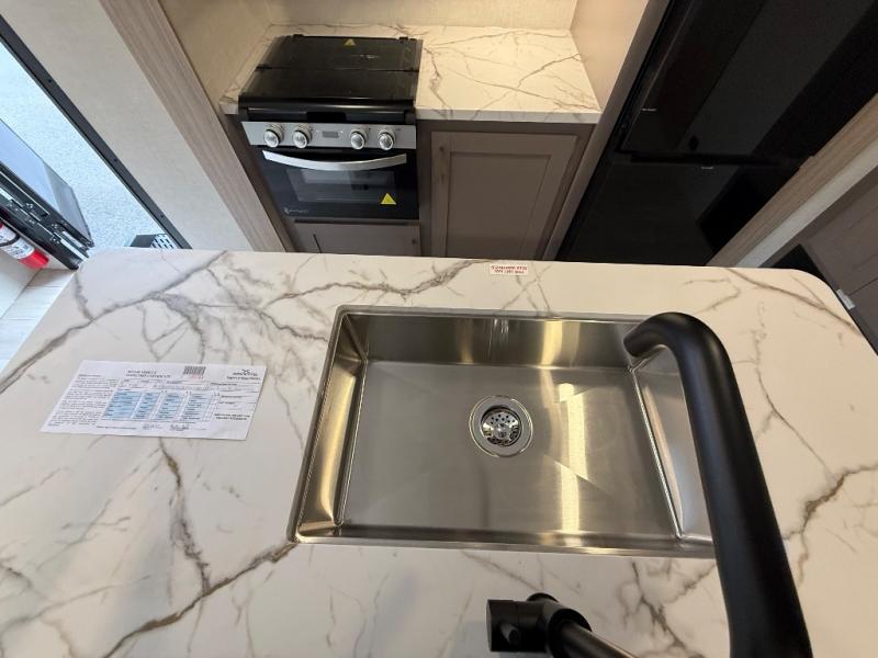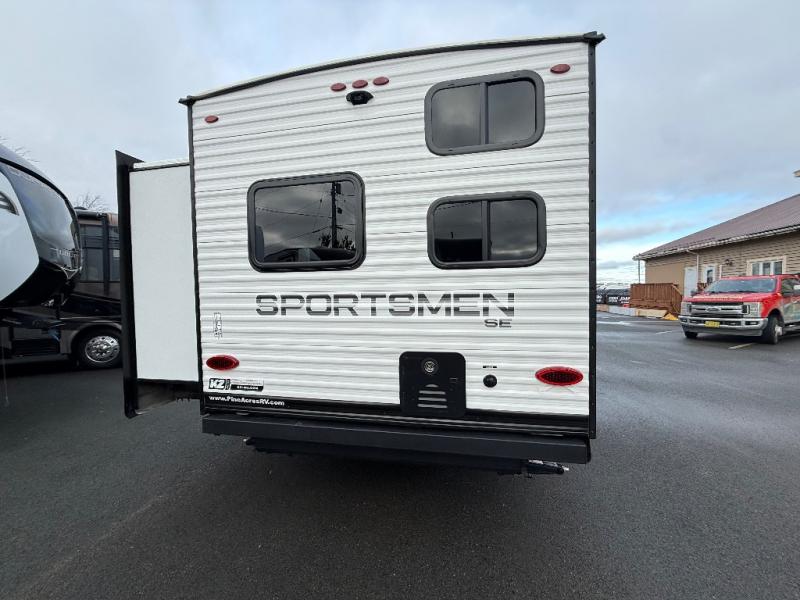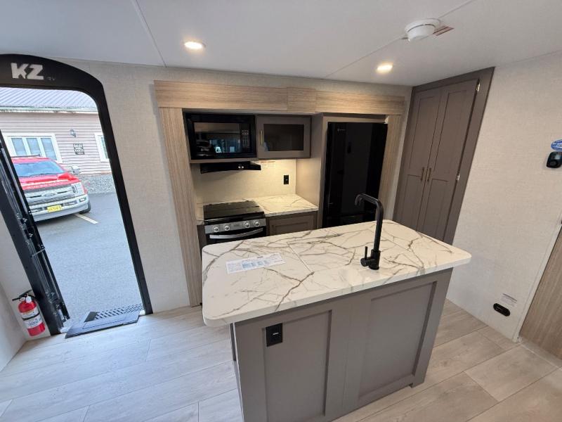 Each Sportsmen SE travel trailer and toy hauler by KZ is constructed with KZ exclusive tough shield exterior metal, a one-piece seamless walk-on Tufflex roofing material, and diamond plate rock guard to protect your unit from road debris. You will appreciate the extra large baggage doors for stowing away your gear when not in use, and tinted windows to help keep the harmful sun rays out plus keeping it cooler inside. Some of the exterior conveniences found in the mandatory Advantage Package are the solid folding steps with a large folding grab handle for easy entry and exit, a full glass friction hinged entry door, plus an exterior shower for your pets or to rinse off before you head inside. You'll also appreciate the nitrogen-filled tires, solar and backup camera prep, plus a Leash Latch with a bonus beverage opener. You'll feel right at home inside with linoleum flooring throughout, a 13,500 BTU air conditioner, large overhead cabinets, a shower surround, and much more!