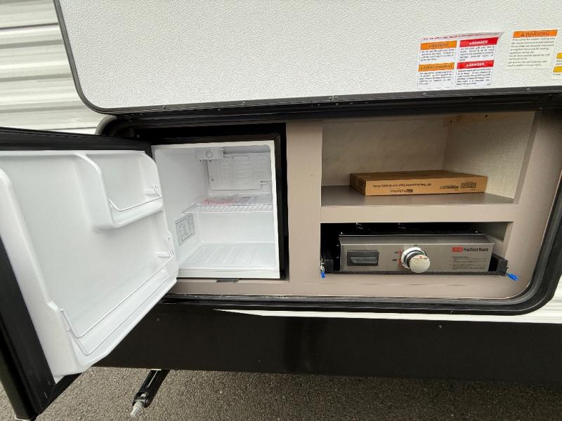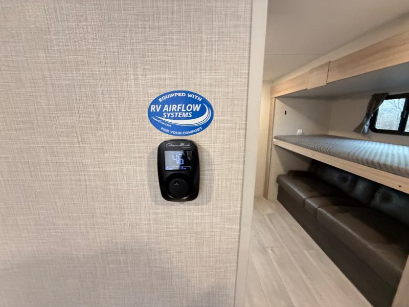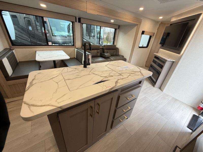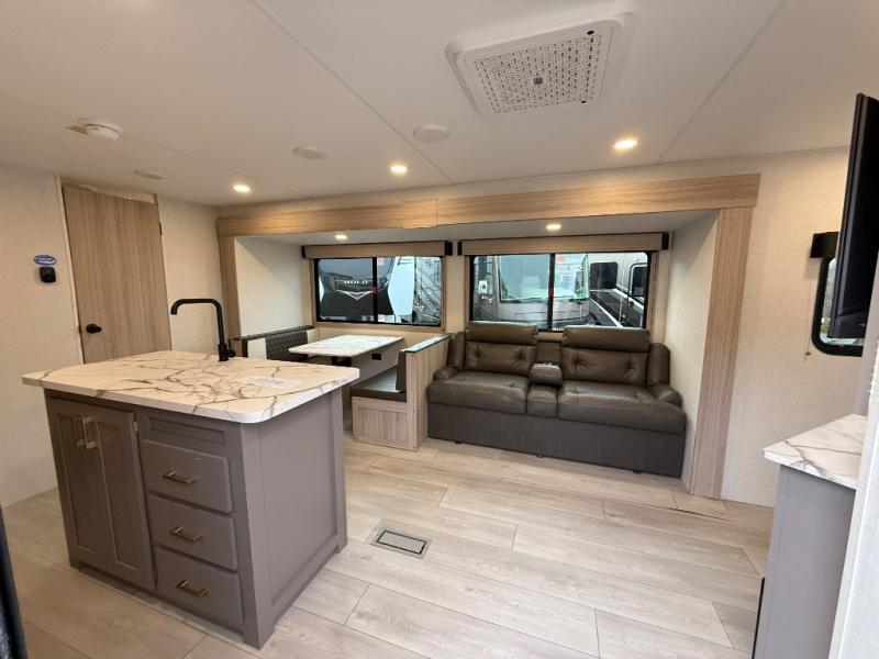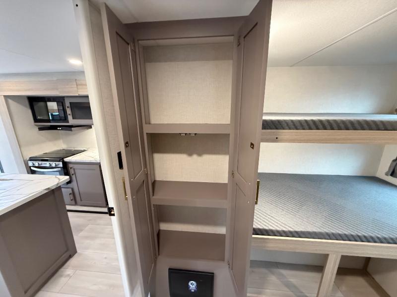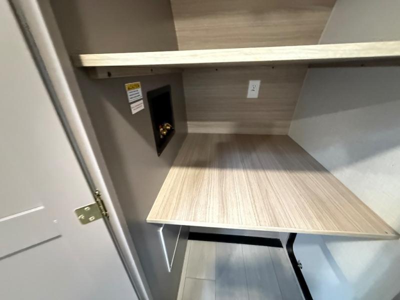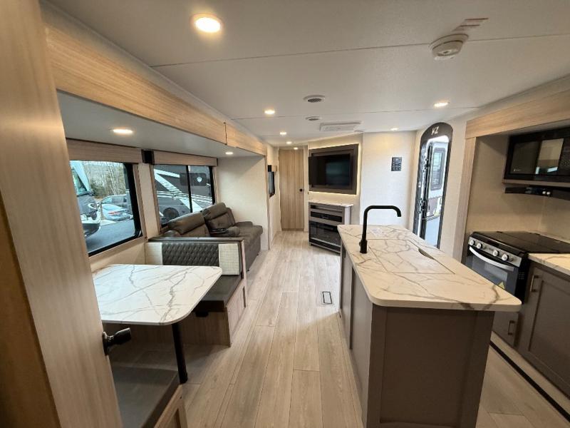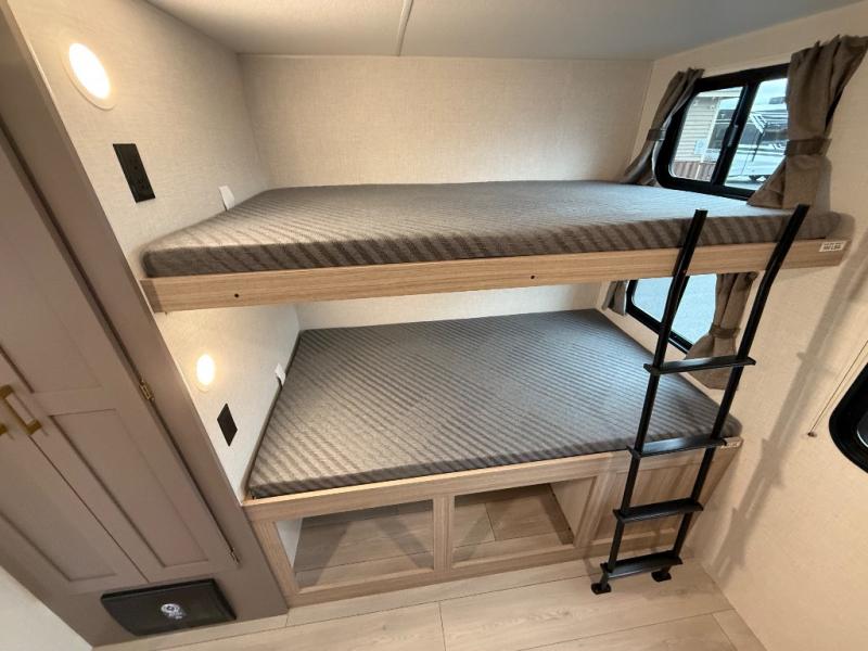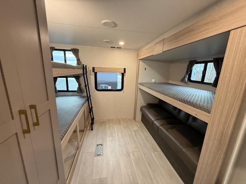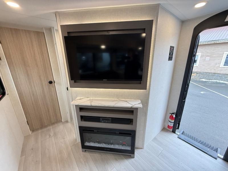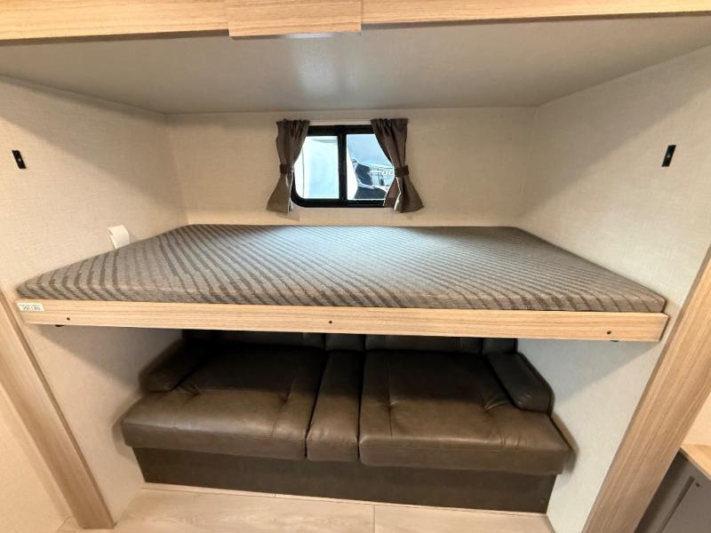 If you've been looking for a travel trailer with plenty of space for your family or group of friends, look no further! The private bunkhouse includes a set of bunks plus a jackknife sofa with a hinge bunk above. Everyone can gather in the main living area at the booth dinette, and there is a second jackknife sofa here for more seating while you watch a movie cozied up by the fireplace.You will love how spacious is the front bedroom that includes tons of storage options featuring a large wardrobe, a dresser and even storage with washer and dryer prep! If the weather is nice, head outdoors to relax under the 16' power awning as the cook prepares dinner on the outside griddle!