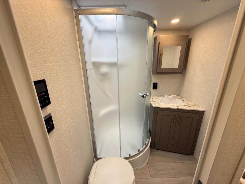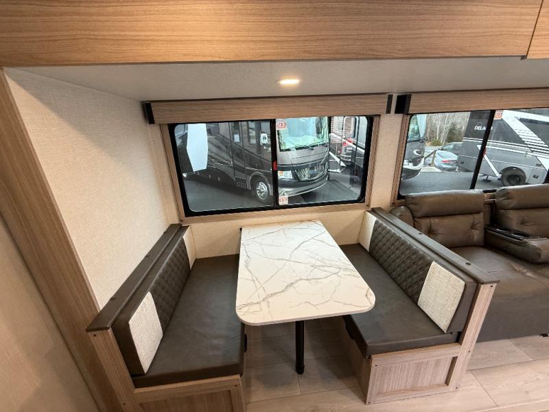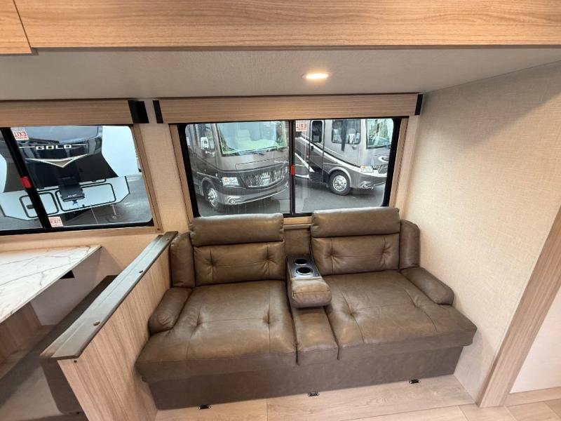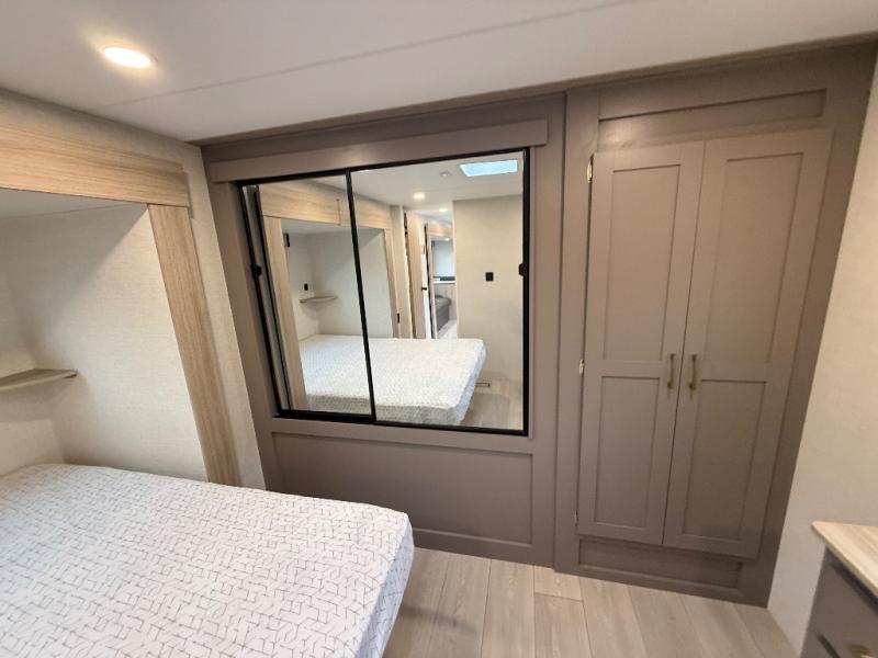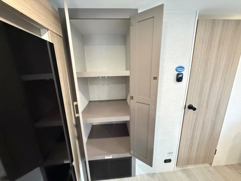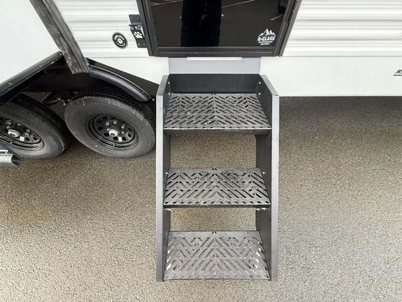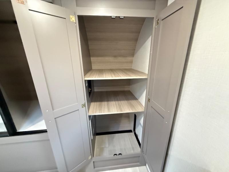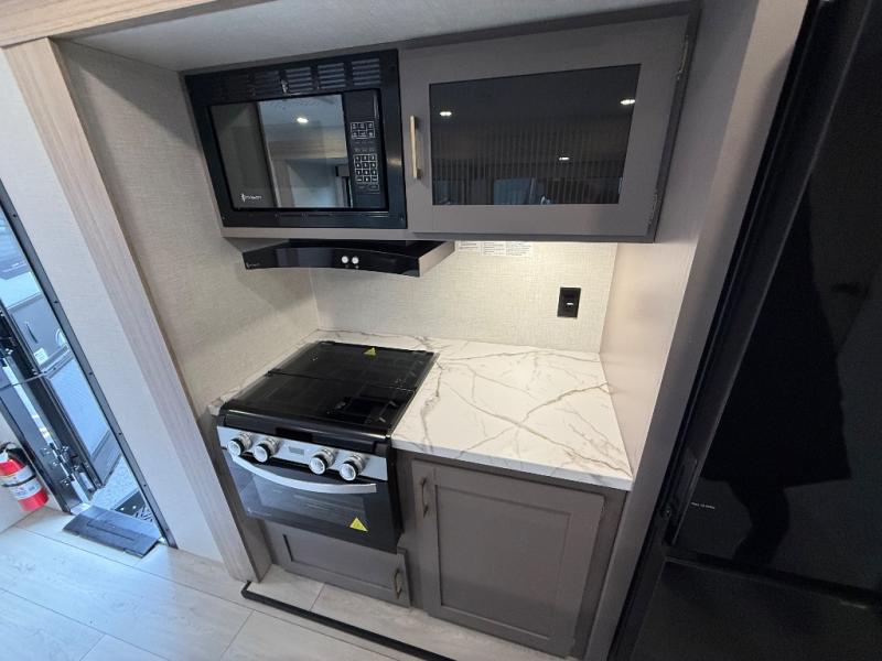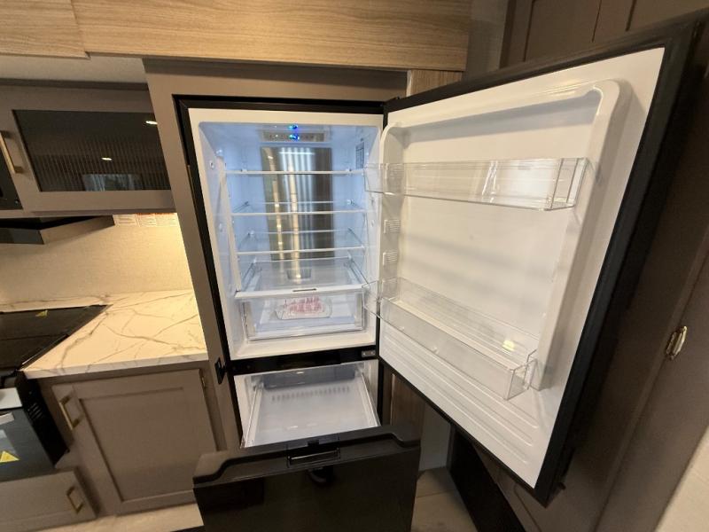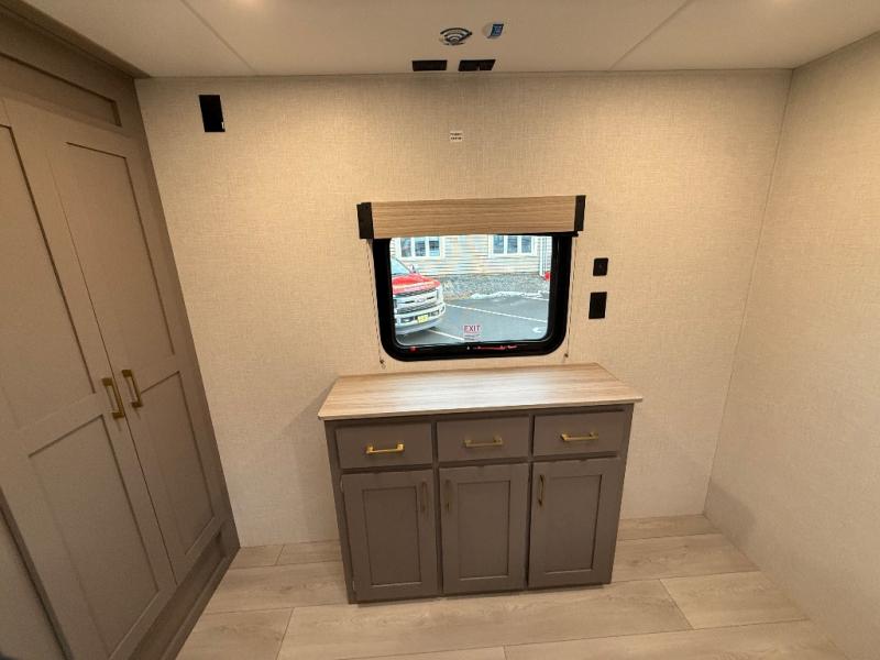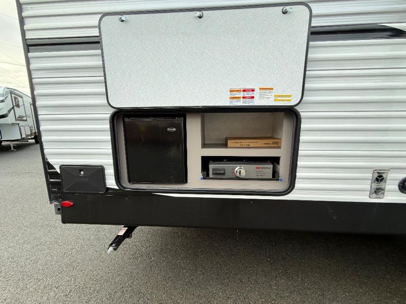 If you've been looking for a travel trailer with plenty of space for your family or group of friends, look no further! The private bunkhouse includes a set of bunks plus a jackknife sofa with a hinge bunk above. Everyone can gather in the main living area at the booth dinette, and there is a second jackknife sofa here for more seating while you watch a movie cozied up by the fireplace.You will love how spacious is the front bedroom that includes tons of storage options featuring a large wardrobe, a dresser and even storage with washer and dryer prep! If the weather is nice, head outdoors to relax under the 16' power awning as the cook prepares dinner on the outside griddle!