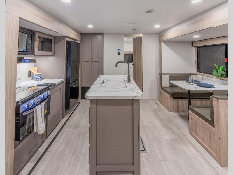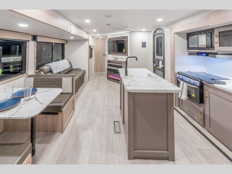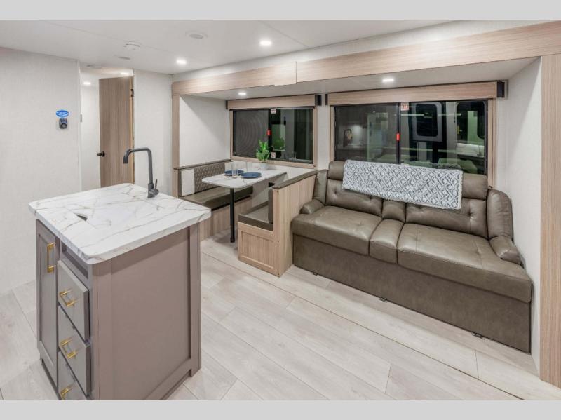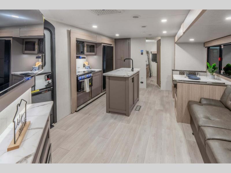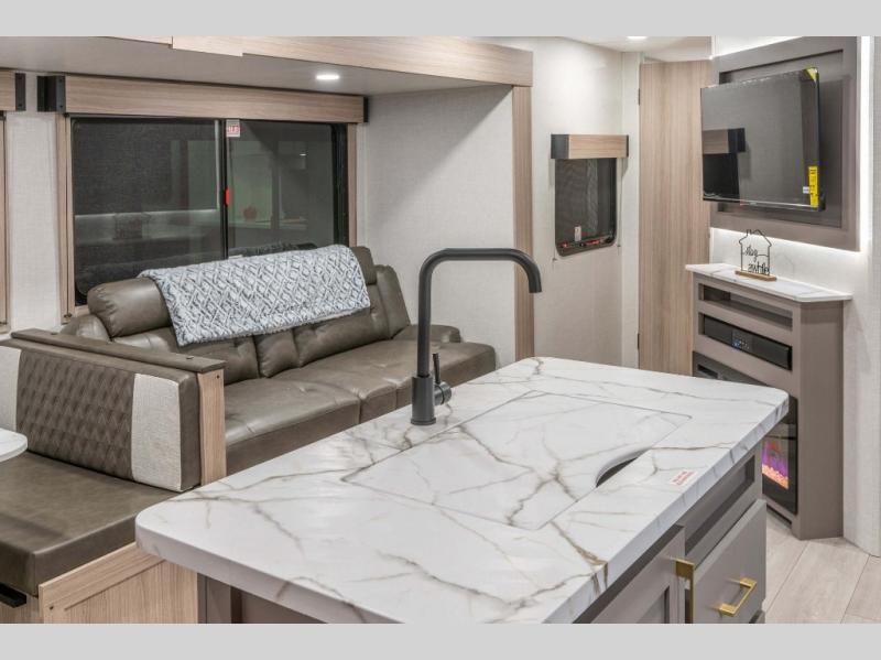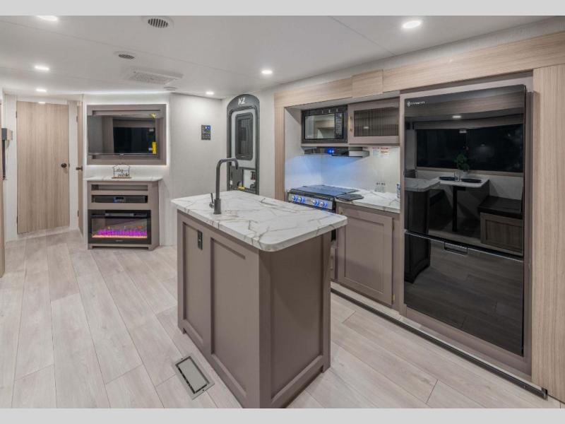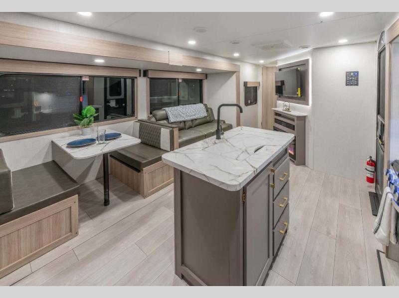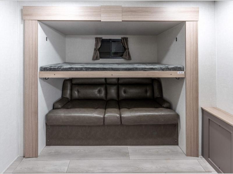 If you've been looking for a travel trailer with plenty of space for your family or group of friends, look no further! The private bunkhouse includes a set of bunks plus a jackknife sofa with a hinge bunk above. Everyone can gather in the main living area at the booth dinette, and there is a second jackknife sofa here for more seating while you watch a movie cozied up by the fireplace.You will love how spacious is the front bedroom that includes tons of storage options featuring a large wardrobe, a dresser and even storage with washer and dryer prep! If the weather is nice, head outdoors to relax under the 16' power awning as the cook prepares dinner on the outside griddle!
