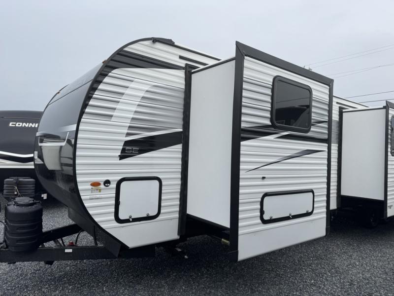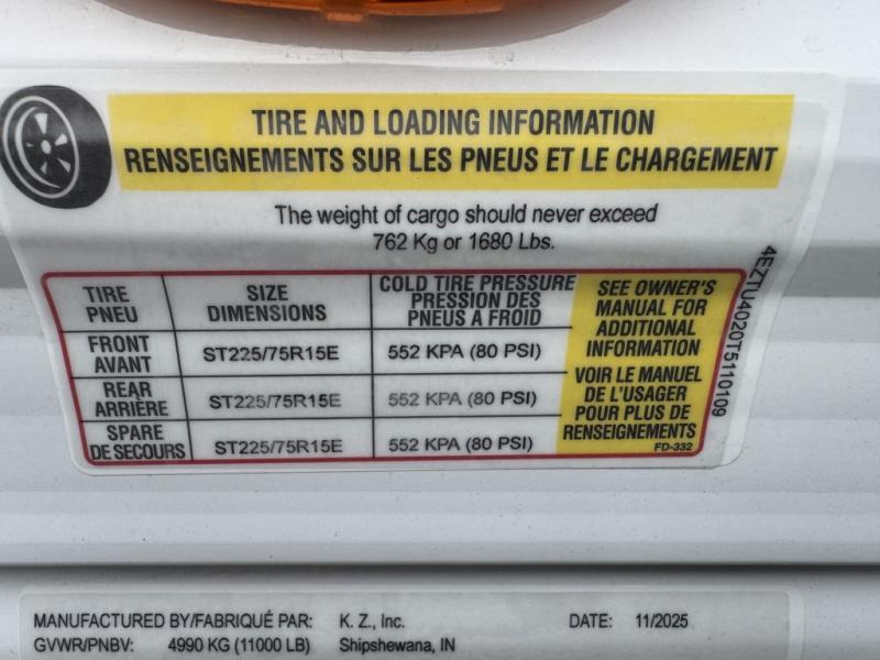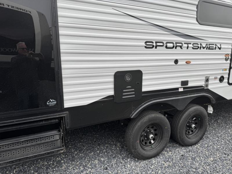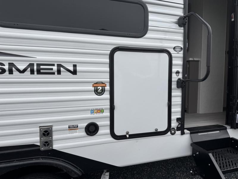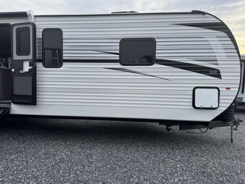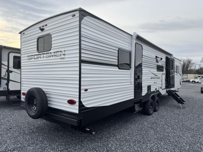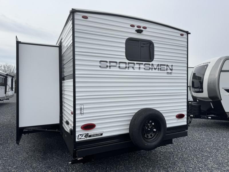 Each Sportsmen SE travel trailer and toy hauler by KZ is constructed with KZ exclusive tough shield exterior metal, a one-piece seamless walk-on Tufflex roofing material, and diamond plate rock guard to protect your unit from road debris. You will appreciate the extra large baggage doors for stowing away your gear when not in use, and tinted windows to help keep the harmful sun rays out plus keeping it cooler inside. Some of the exterior conveniences found in the mandatory Advantage Package are the solid folding steps with a large folding grab handle for easy entry and exit, a full glass friction hinged entry door, plus an exterior shower for your pets or to rinse off before you head inside. You'll also appreciate the nitrogen-filled tires, solar and backup camera prep, plus a Leash Latch with a bonus beverage opener. You'll feel right at home inside with linoleum flooring throughout, a 13,500 BTU air conditioner, large overhead cabinets, a shower surround, and much more!