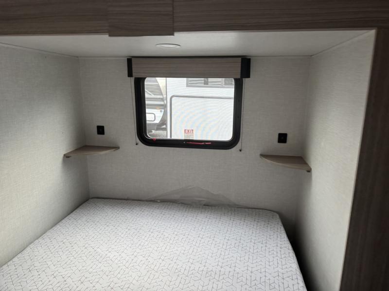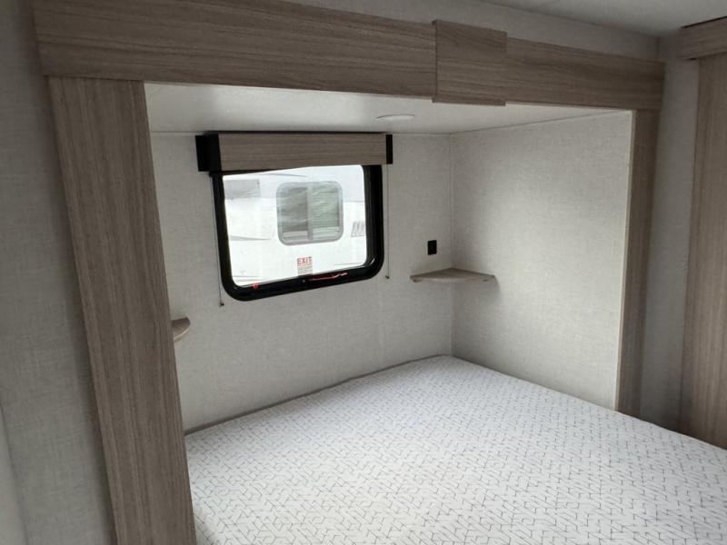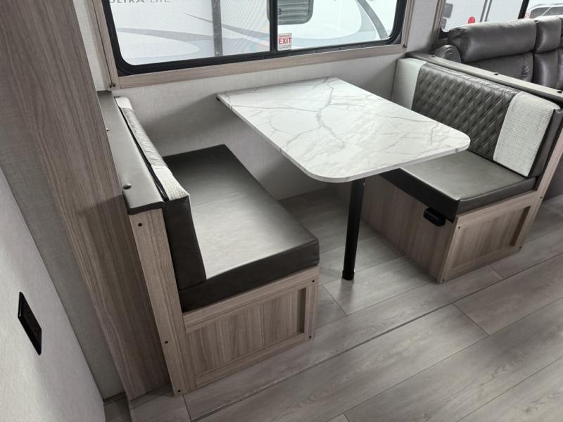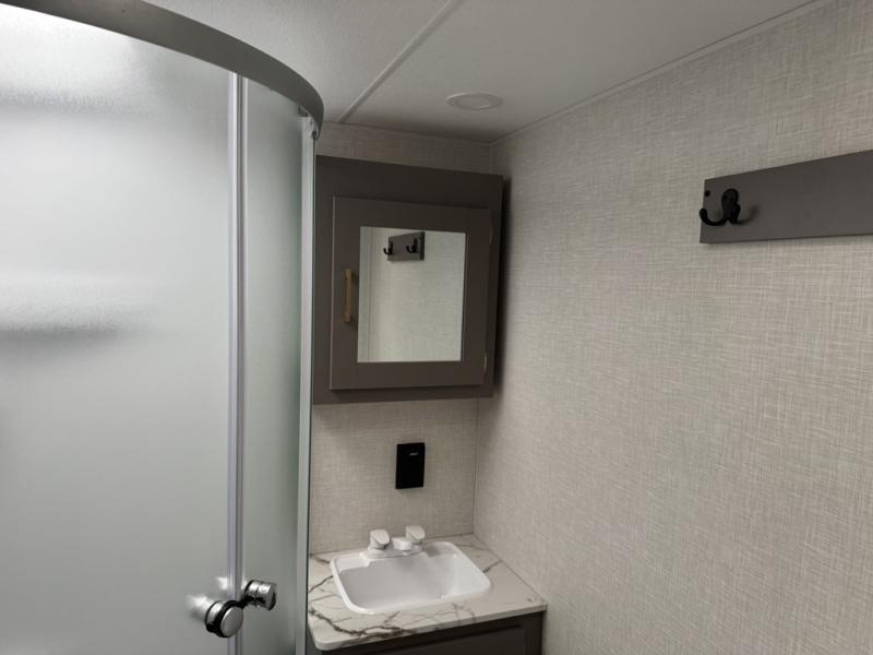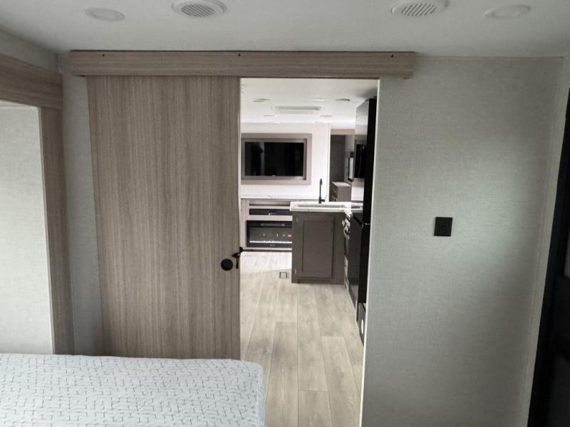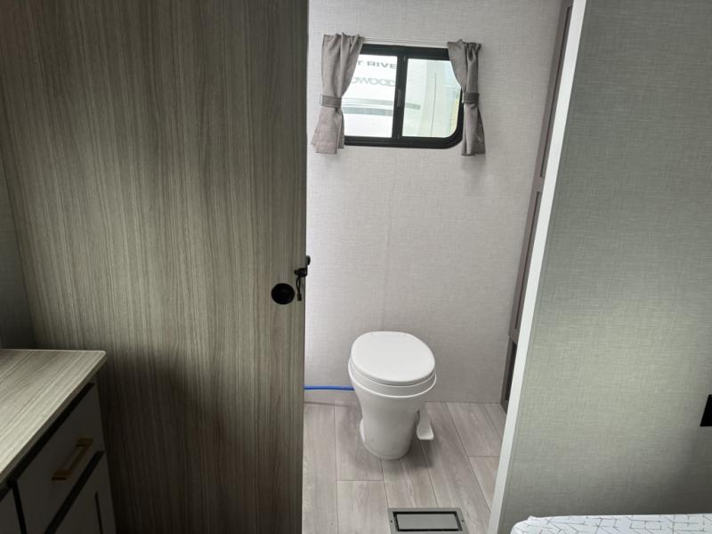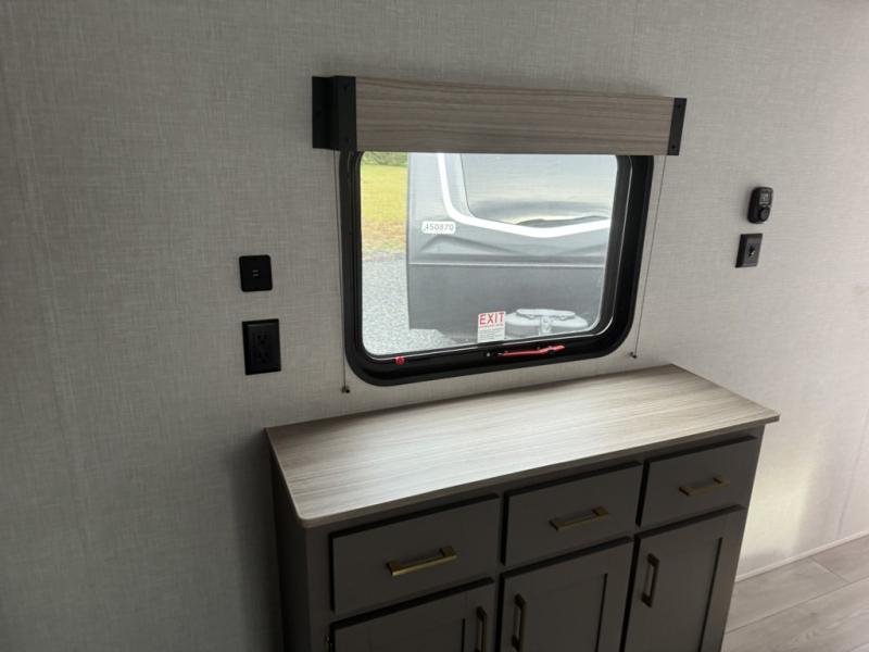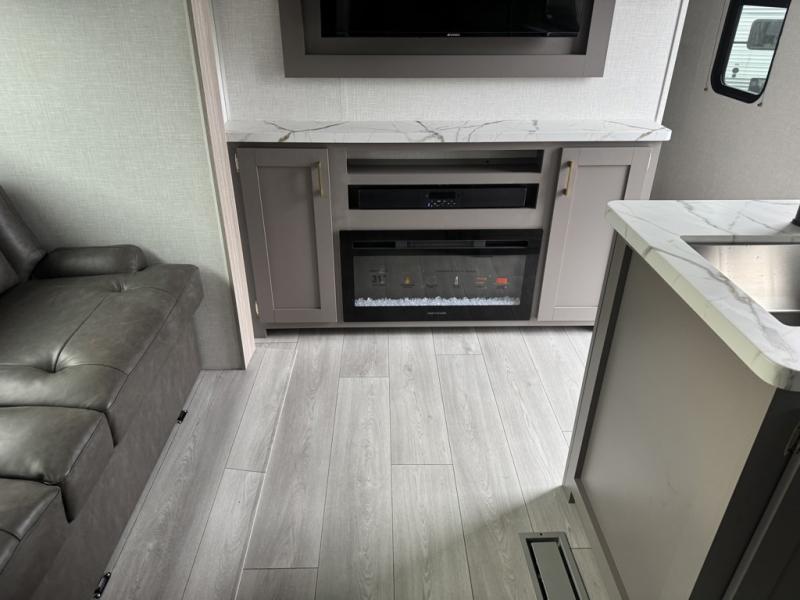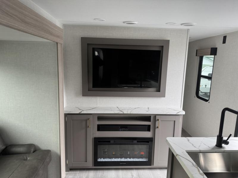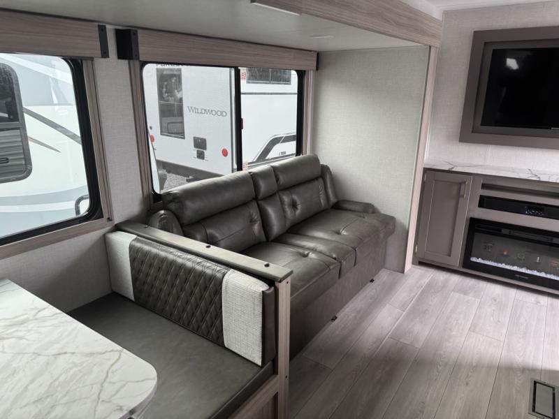 If you've been looking for a travel trailer with plenty of space for your family or group of friends, look no further! There is space for everyone in this model, there are two private bedrooms and each have queen beds to invite even more guests to jump on the adventure. You will admire the amount of storage you will have in each bedroom featuring stunning dressers. Everyone can gather in the main living area at the booth dinette, there is also a jackknife sofa here for more seating while you watch a movie cozied up by the fireplace. When it is time to wind down you will love the two full bathrooms on each side of the RV so no one has to worry about taking turns!