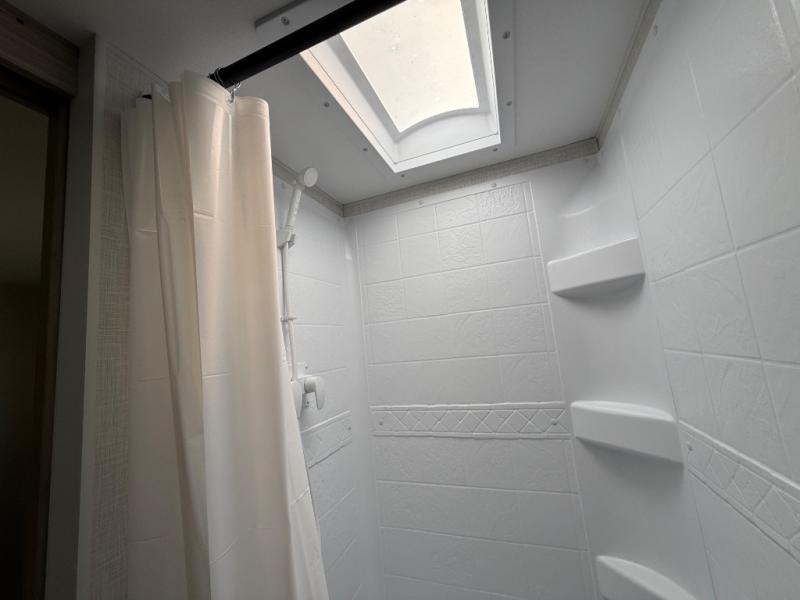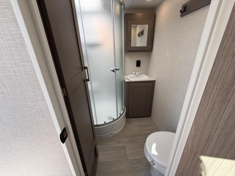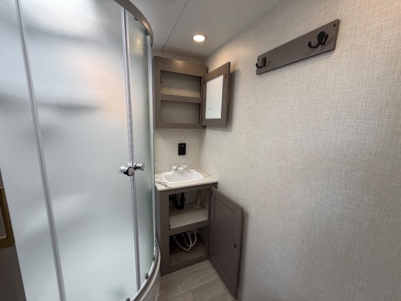 The bathroom is designed for convenience and privacy, featuring a spacious shower, vanity, and toilet, giving you all the comforts of home no matter where your travels take you. Durable flooring, quality finishes, and thoughtful touches throughout enhance the functionality and appeal of this trailer.