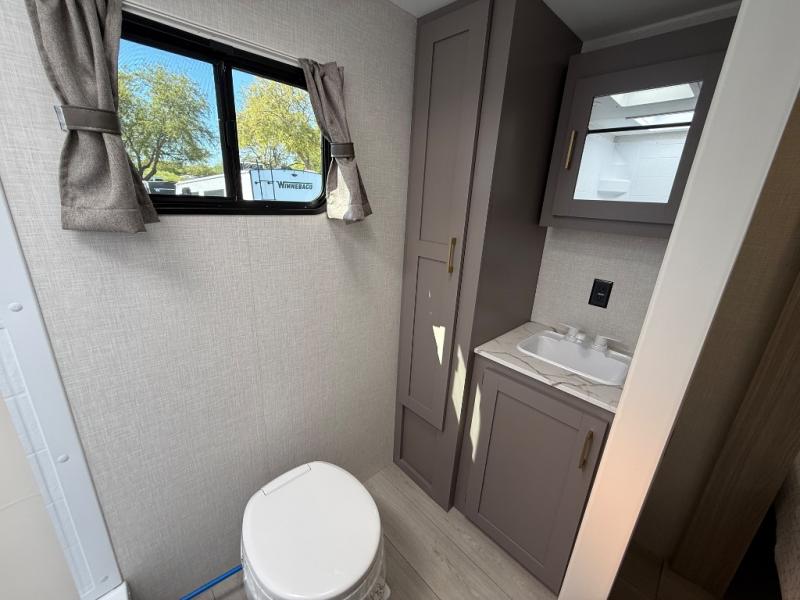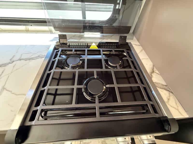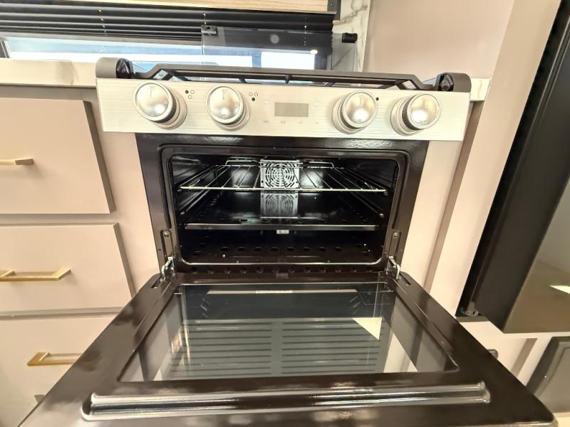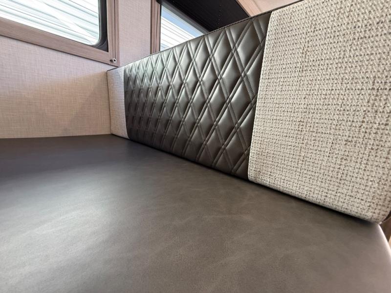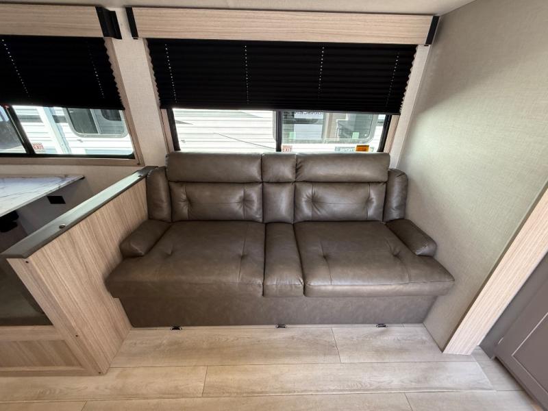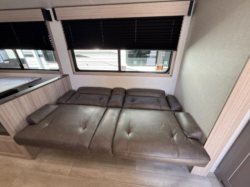 The fully equipped kitchen features a three-burner cooktop, oven, microwave, refrigerator, and solid-surface countertops, along with abundant storage for all your essentials. Cooking and entertaining on the road is effortless, whether you’re preparing a quick breakfast before heading out or a full dinner after a day of exploring. The adjacent dinette and sofa provide additional seating and can convert into extra sleeping areas as needed.