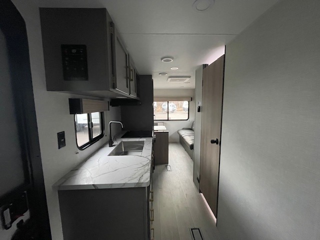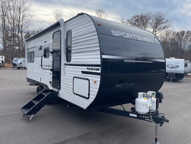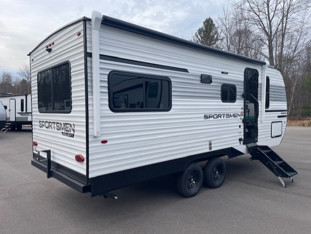 With any Sportsmen Select travel trailer by KZ, you will enjoy premium features at an affordable price, making them perfect for rookie RVers! Each model is constructed with an aerodynamic front profile with a smooth metal front for better fuel efficiency, and the nitrogen filled tires and power tongue jack will make towing easier than ever. There are is also a Key-Alike system for entry and baggage doors to keep your belongings secure, plus backup camera prep and solar roof prep means you can easily add these features to make camping that much smoother. An omnidirectional HDTV antenna with Wi-Fi prep will give you the option to stay connected as you camp, and a multi-media sound bar stereo with Bluetooth, HDMI and USB charge will ensure you'll never go bored on rainy days. The interior of these travel trailers include seamless countertops with a deep undermount stainless steel kitchen sink, a black residential kitchen faucet, wider pocket/passage doors, and residential grade linoleum.