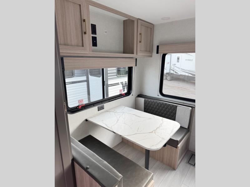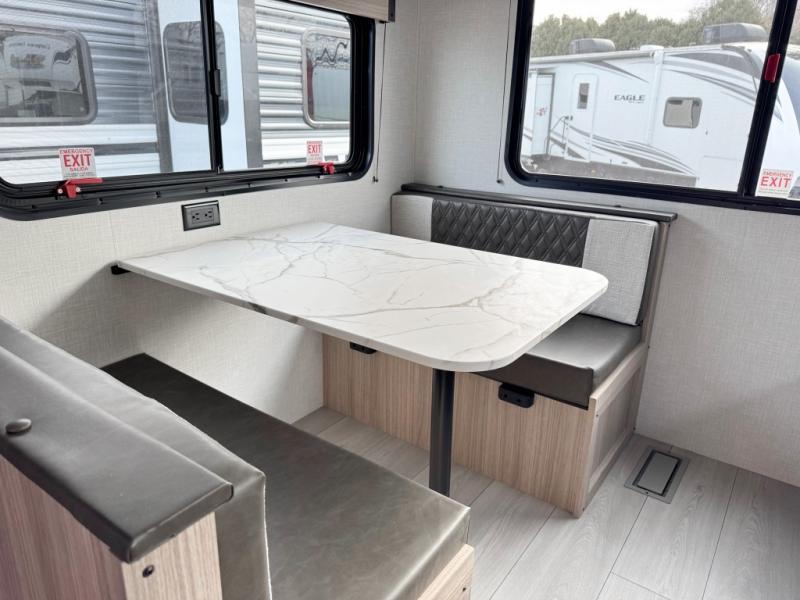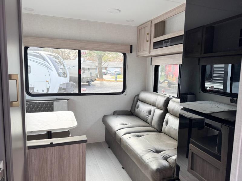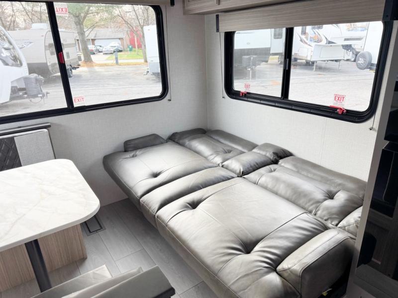 Enjoy your time at the campground in this travel trailer that can sleep four to five each night! Once you arrive at your site, you can unload the pass-thru storage, put out the 18' power awning, then head inside to make lunch on the cooktop. There is a 41" booth dinette to dine at and a 70" jackknife sofa to relax on after dinner. A full bath includes a 30" x 36" shower to freshen up after a long day outdoors, and a queen bed up front will have you feeling right at home. This unit also includes dual wardrobes to keep your clothes organized, a kitchen pantry for snacks, and a pass-thru storage for hiking gear!