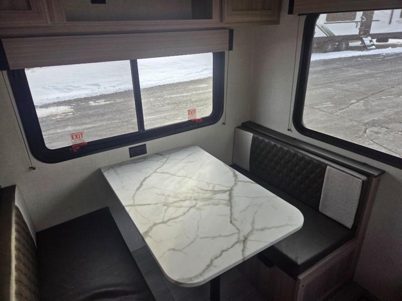 Enjoy your time at the campground in this travel trailer that can sleep four to five each night! Once you arrive at your site, you can unload the pass-thru storage, put out the 18' power awning, then head inside to make lunch on the cooktop. There is a 41" booth dinette to dine at and a 70" jackknife sofa to relax on after dinner. A full bath includes a 30" x 36" shower to freshen up after a long day outdoors, and a queen bed up front will have you feeling right at home. This unit also includes dual wardrobes to keep your clothes organized, a kitchen pantry for snacks, and a pass-thru storage for hiking gear!