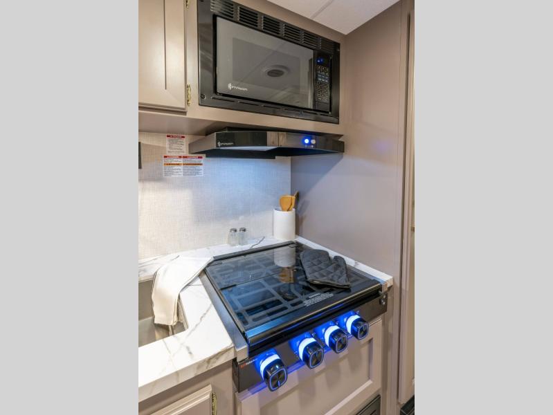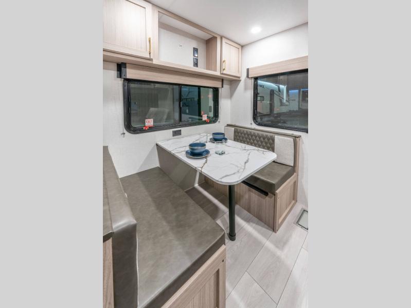 Enjoy your time at the campground in this travel trailer that can sleep four to five each night! Once you arrive at your site, you can unload the pass-thru storage, put out the 18' power awning, then head inside to make lunch on the cooktop. There is a 41" booth dinette to dine at and a 70" jackknife sofa to relax on after dinner. A full bath includes a 30" x 36" shower to freshen up after a long day outdoors, and a queen bed up front will have you feeling right at home. This unit also includes dual wardrobes to keep your clothes organized, a kitchen pantry for snacks, and a pass-thru storage for hiking gear!