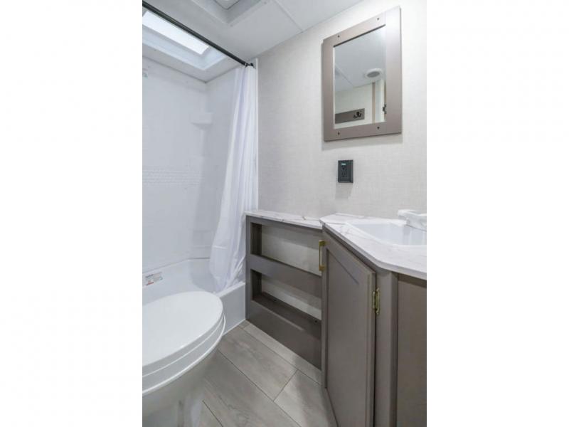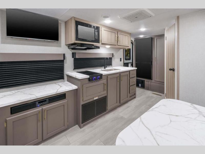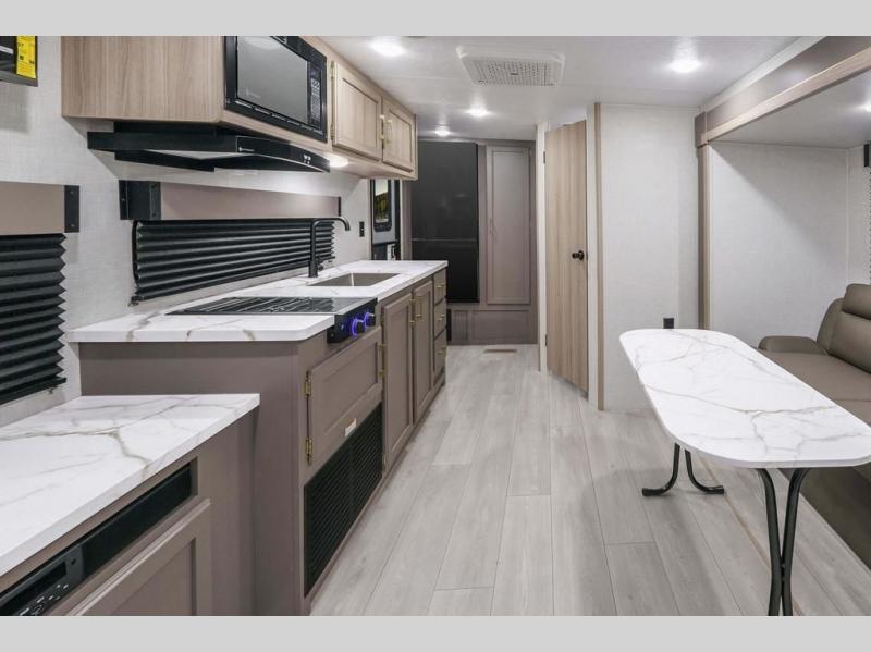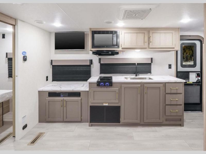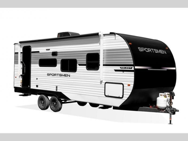 With any Sportsmen Select travel trailer by KZ, you will enjoy premium features at an affordable price, making them perfect for rookie RVers! Each model is constructed with an aerodynamic front profile with a smooth metal front for better fuel efficiency, and the nitrogen filled tires and power tongue jack will make towing easier than ever. There are is also a Key-Alike system for entry and baggage doors to keep your belongings secure, plus backup camera prep and solar roof prep means you can easily add these features to make camping that much smoother. An omnidirectional HDTV antenna with Wi-Fi prep will give you the option to stay connected as you camp, and a multi-media sound bar stereo with Bluetooth, HDMI and USB charge will ensure you'll never go bored on rainy days. The interior of these travel trailers include seamless countertops with a deep undermount stainless steel kitchen sink, a black residential kitchen faucet, wider pocket/passage doors, and residential grade linoleum.