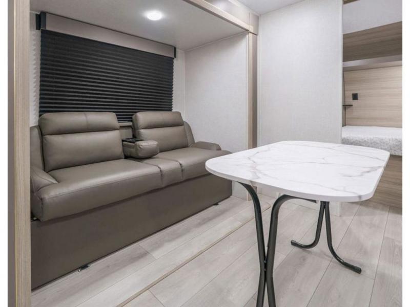 Spend your weekends at the campground in this travel trailer for three happy campers! There is ample space to move around thanks to the jackknife sofa slide out, and you'll love having your own bedroom up front with a queen bed. There are also dual bedside wardrobes and a TV mount if you want to bring along your television. A cooktop and microwave oven will let you make meals each day, and the 10-cu. ft. 12V refrigerator will be perfect for perishables. This unit also includes a full bath onboard, so you won't have to use the camp's facilities!