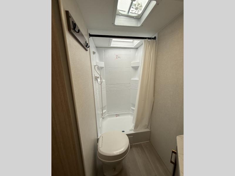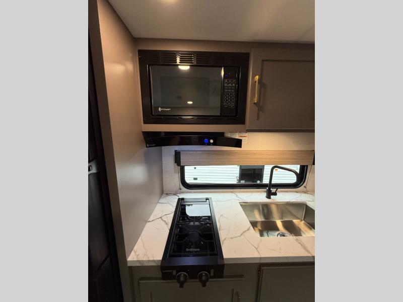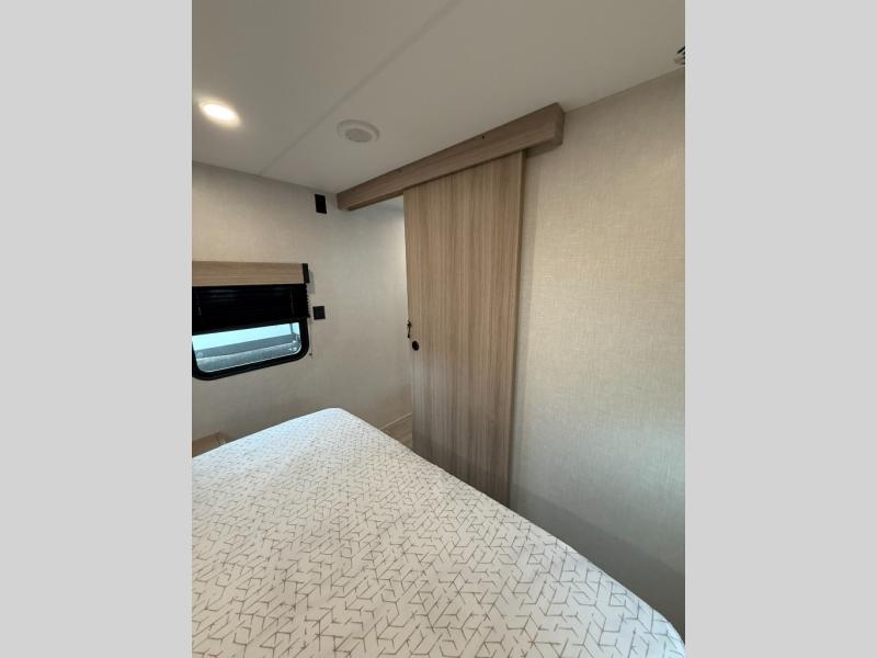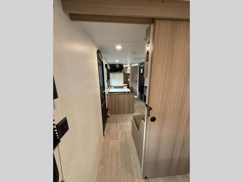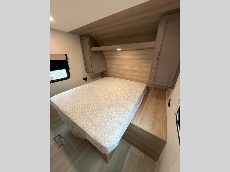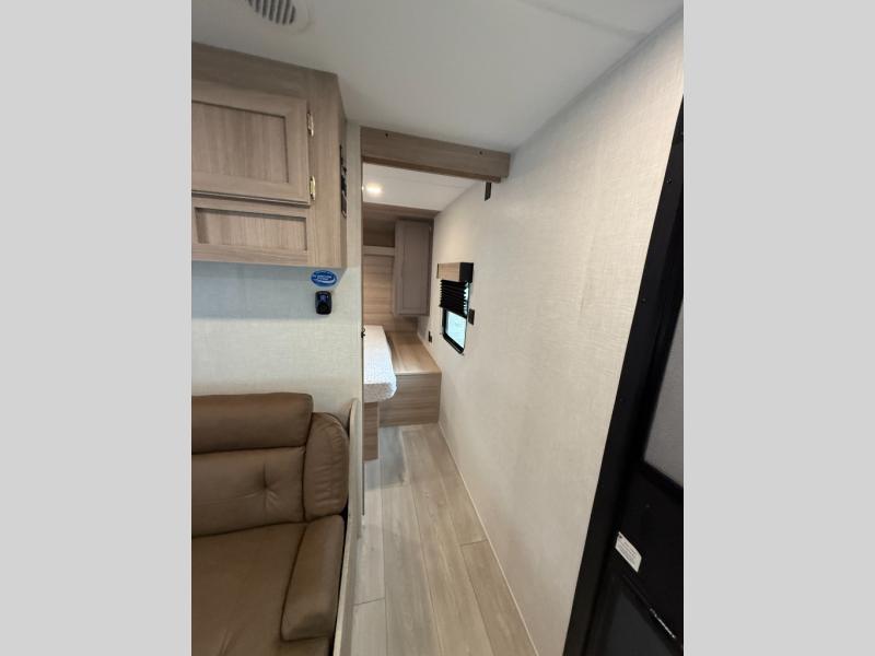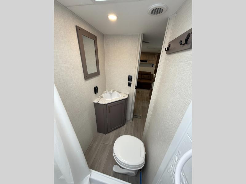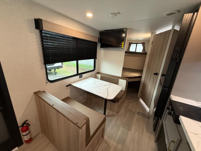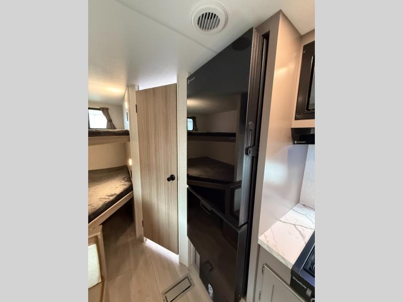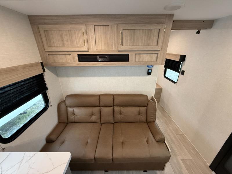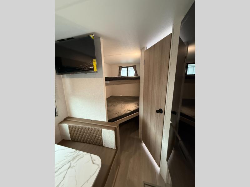 This travel trailer can comfortably sleep eight between the double-size bunks, the queen bed in the front bedroom, plus the booth dinette and jackknife sofa in the main living area. Everyone can freshen up each day in the full bath that includes a shower pan, foot flush toilet, and a sink. The chef of your group can make dinner on the two burner drop-in cooktop or in the microwave oven, and there is a 10 cu. ft. 12V refrigerator for perishables. This model also includes a TV mount if you want to add a television for movie nights, and there is an exterior pas-through storage for fishing poles, camp chairs, and more!