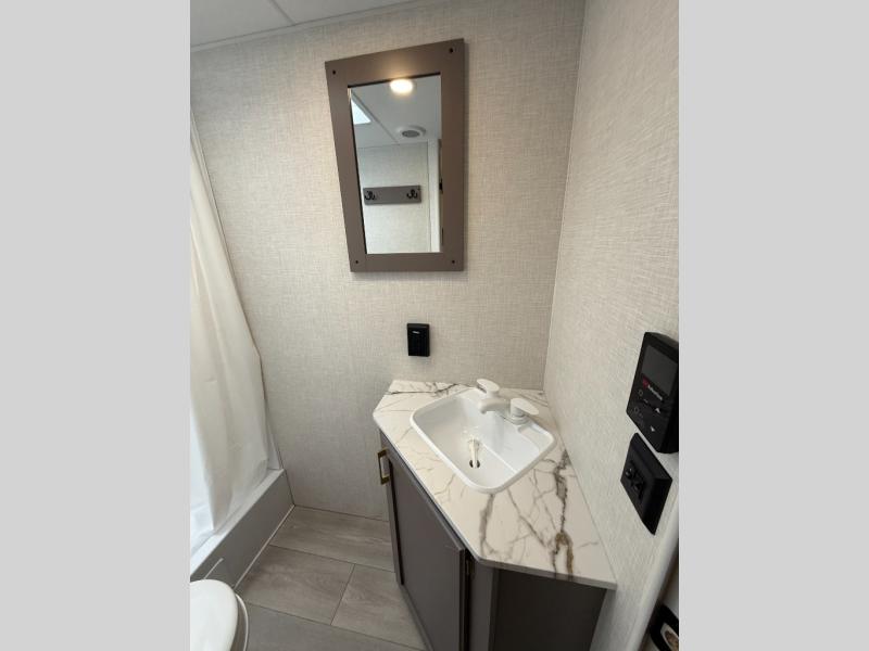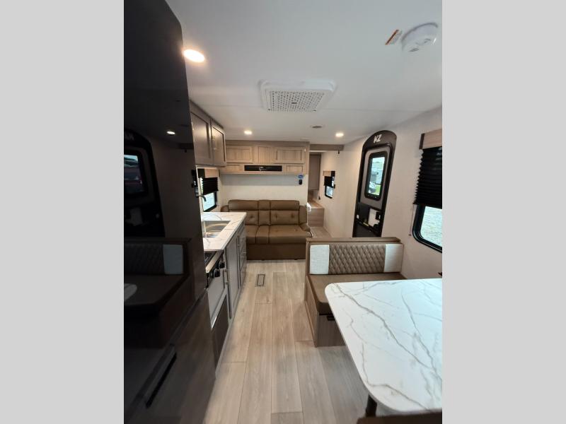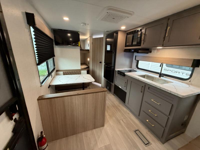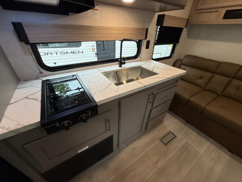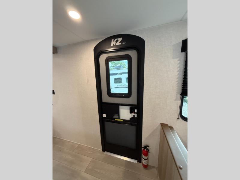 With any Sportsmen Select travel trailer by KZ, you will enjoy premium features at an affordable price, making them perfect for rookie RVers! Each model is constructed with an aerodynamic front profile with a smooth metal front for better fuel efficiency, and the nitrogen filled tires and power tongue jack will make towing easier then ever. There are is also a Key-Alike system for entry and baggage doors to keep your belongings secure, plus backup camera prep and solar roof prep means you can easily add these features to make camping that much smoother. An omnidirectional HDTV antenna with Wi-Fi prep will give you the option to stay connected as you camp, and a multi-media sound bar stereo with Bluetooth, HDMI and USB charge will ensure you'll never go bored on rainy days. The interior of these travel trailers include seamless countertops with a deep undermount stainless steel kitchen sink, a black residential kitchen faucet, wider pocket/passage doors, and residential grade linoleum.