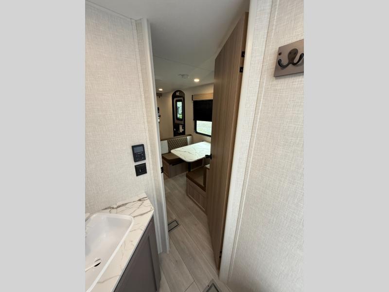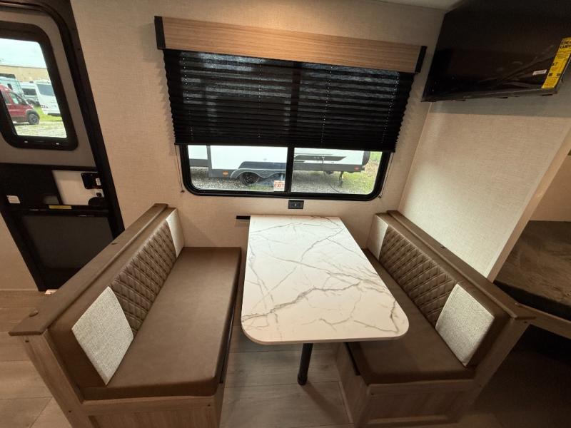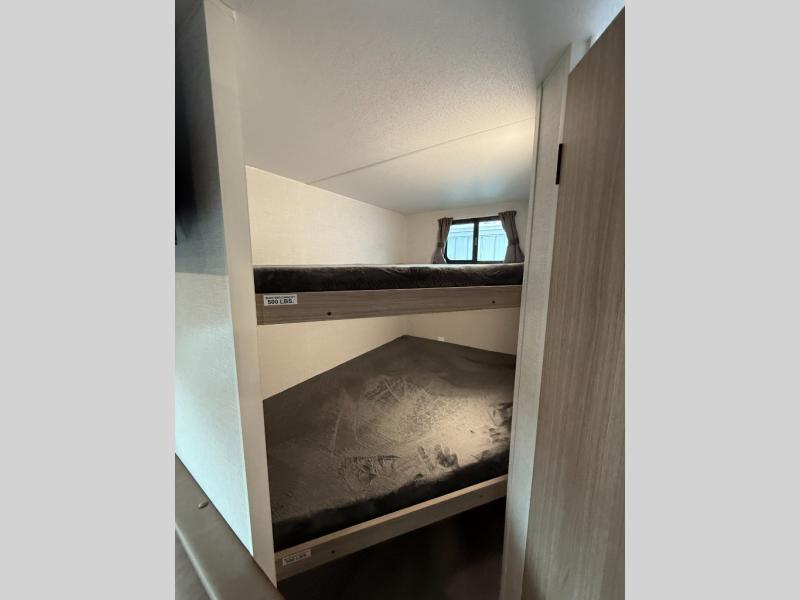 This travel trailer can comfortably sleep eight between the double-size bunks, the queen bed in the front bedroom, plus the booth dinette and jackknife sofa in the main living area. Everyone can freshen up each day in the full bath that includes a shower pan, foot flush toilet, and a sink. The chef of your group can make dinner on the two burner drop-in cooktop or in the microwave oven, and there is a 10 cu. ft. 12V refrigerator for perishables. This model also includes a TV mount if you want to add a television for movie nights, and there is an exterior pas-through storage for fishing poles, camp chairs, and more!