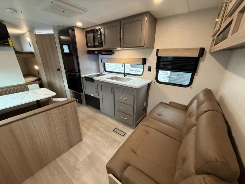 With any Sportsmen Select travel trailer by KZ, you will enjoy premium features at an affordable price, making them perfect for rookie RVers! Each model is constructed with an aerodynamic front profile with a smooth metal front for better fuel efficiency, and the nitrogen filled tires and power tongue jack will make towing easier then ever. There are is also a Key-Alike system for entry and baggage doors to keep your belongings secure, plus backup camera prep and solar roof prep means you can easily add these features to make camping that much smoother. An omnidirectional HDTV antenna with Wi-Fi prep will give you the option to stay connected as you camp, and a multi-media sound bar stereo with Bluetooth, HDMI and USB charge will ensure you'll never go bored on rainy days. The interior of these travel trailers include seamless countertops with a deep undermount stainless steel kitchen sink, a black residential kitchen faucet, wider pocket/passage doors, and residential grade linoleum.