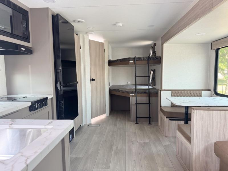 This bunkhouse model is perfect for your whole crew! Your guests or little ones will love the double-size bunk, while you take the queen bed in the front private bedroom. The large slide out will create an open living area, and here you'll find the 70" jackknife sofa and 41" booth dinette, both of which can also convert to extra sleeping space. The full bath has its own exterior entry door for convenience, and the second entry door opens up to the main living area. There is plenty of storage space in this model, including a wardrobe/pantry in the kitchen, dual wardrobes in the bedroom, an exterior pass-through storage, and even an exterior trunk door under the bunks to easily fit in all your gear!