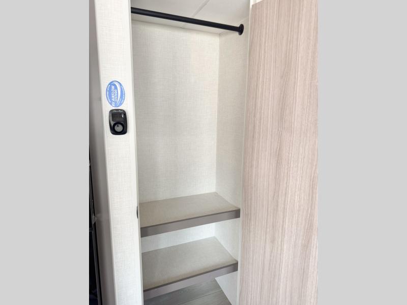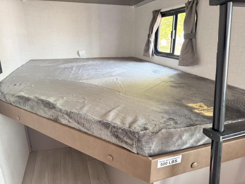This bunkhouse model is perfect for your whole crew! Your guests or little ones will love the double-size bunk, while you take the queen bed in the front private bedroom. The large slide out will create an open living area, and here you'll find the 70" jackknife sofa and 41" booth dinette, both of which can also convert to extra sleeping space. The full bath has its own exterior entry door for convenience, and the second entry door opens up to the main living area. There is plenty of storage space in this model, including a wardrobe/pantry in the kitchen, dual wardrobes in the bedroom, an exterior pass-through storage, and even an exterior trunk door under the bunks to easily fit in all your gear!