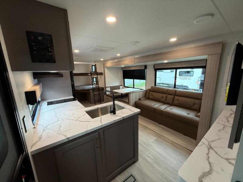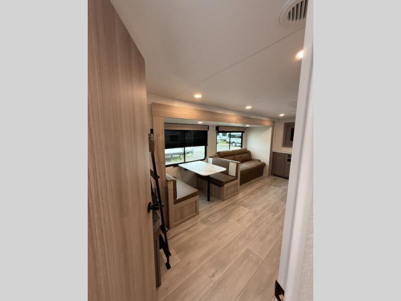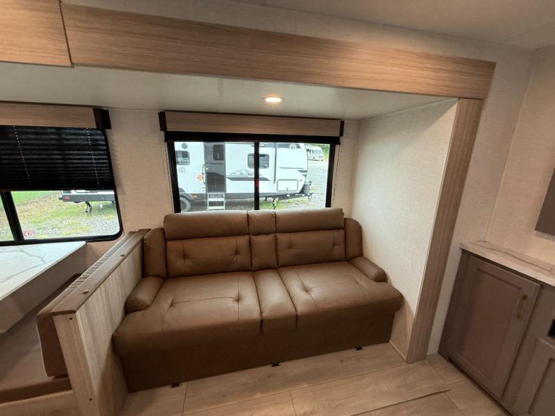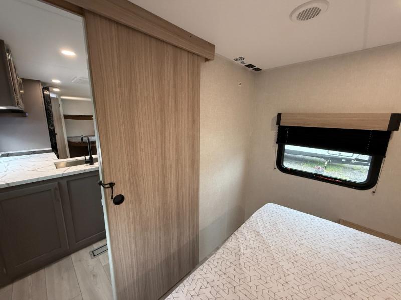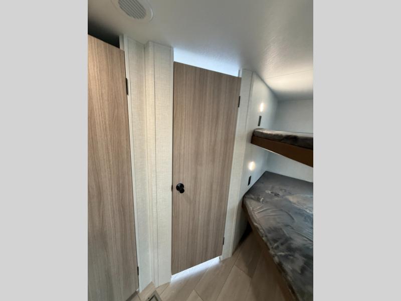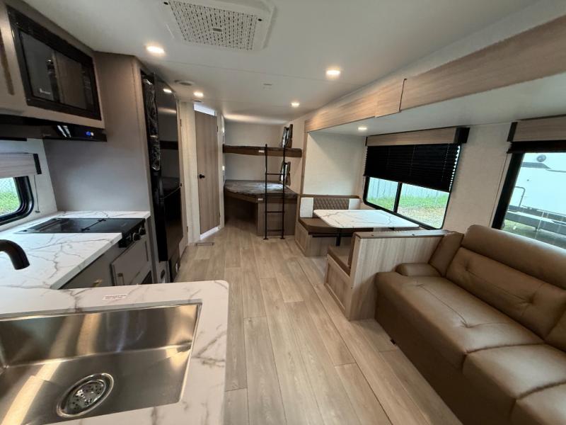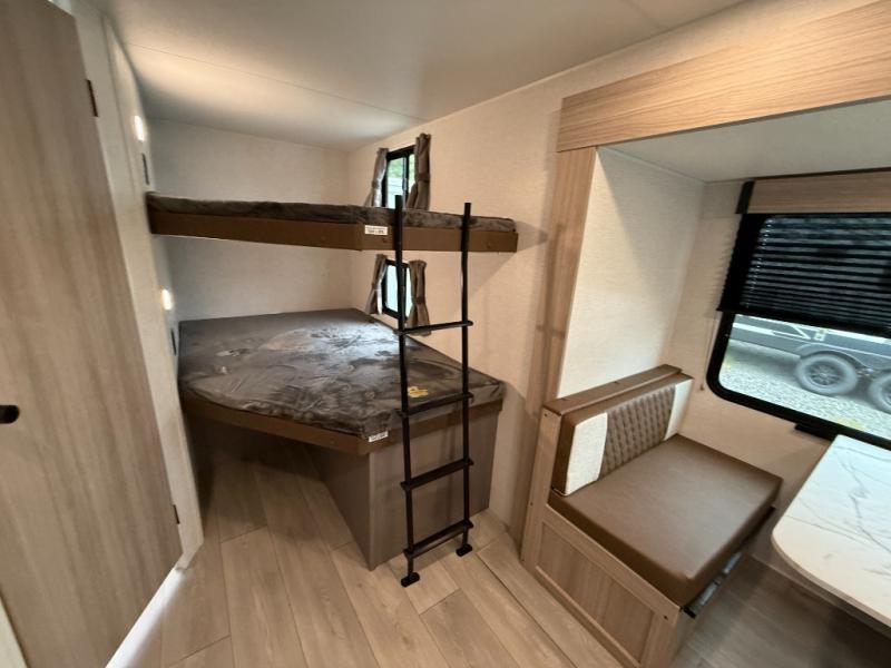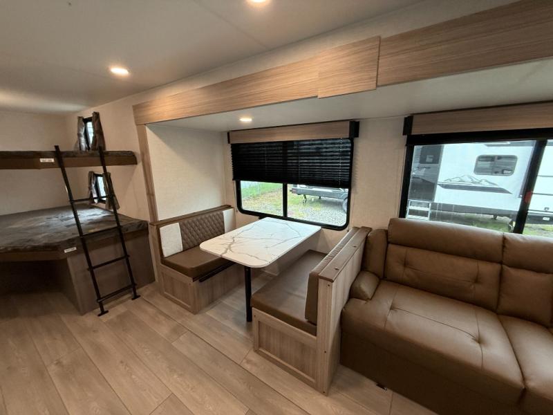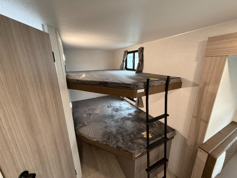 This bunkhouse model is perfect for your whole crew! Your guests or little ones will love the double-size bunk, while you take the queen bed in the front private bedroom. The large slide out will create an open living area, and here you'll find the 70" jackknife sofa and 41" booth dinette, both of which can also convert to extra sleeping space. The full bath has its own exterior entry door for convenience, and the second entry door opens up to the main living area. There is plenty of storage space in this model, including a wardrobe/pantry in the kitchen, dual wardrobes in the bedroom, an exterior pass-through storage, and even an exterior trunk door under the bunks to easily fit in all your gear!