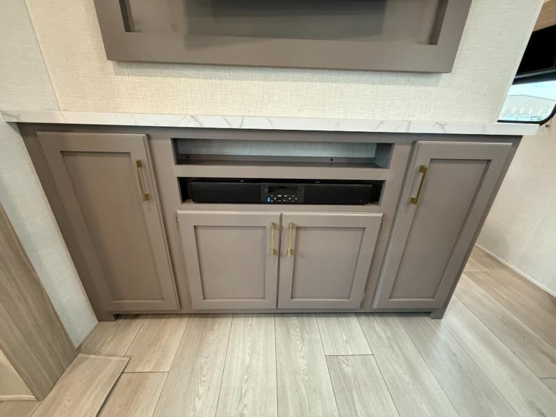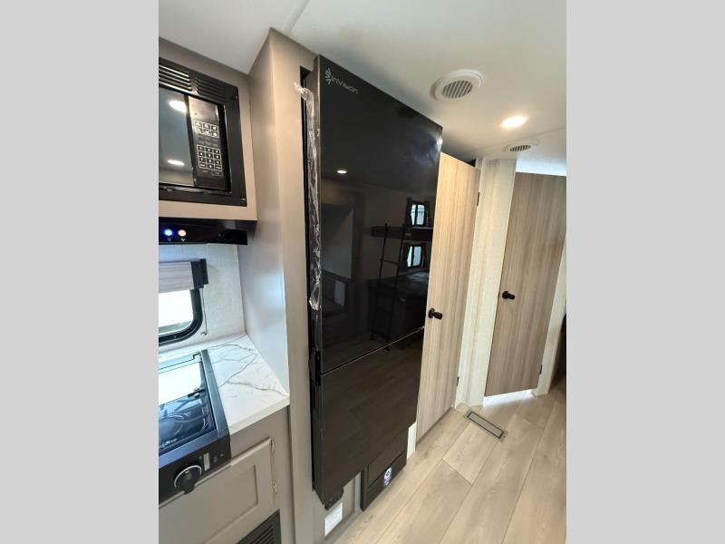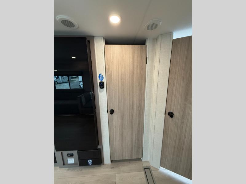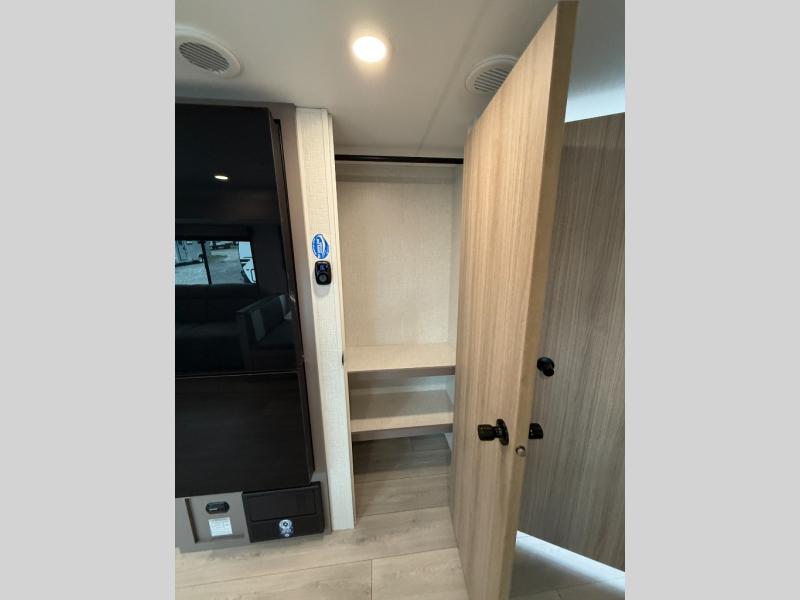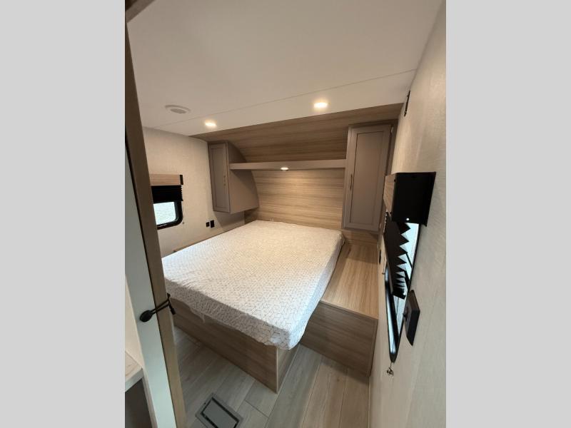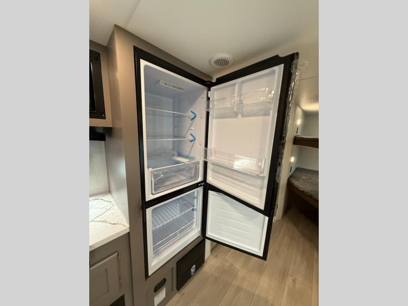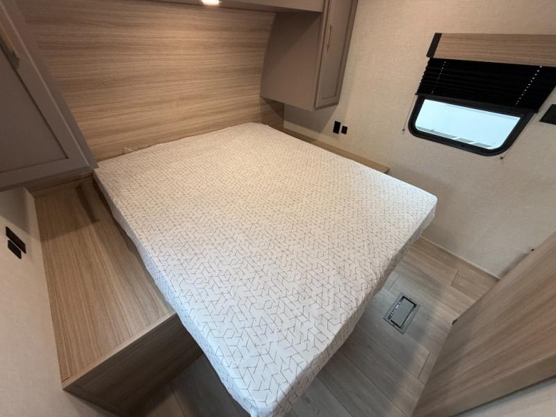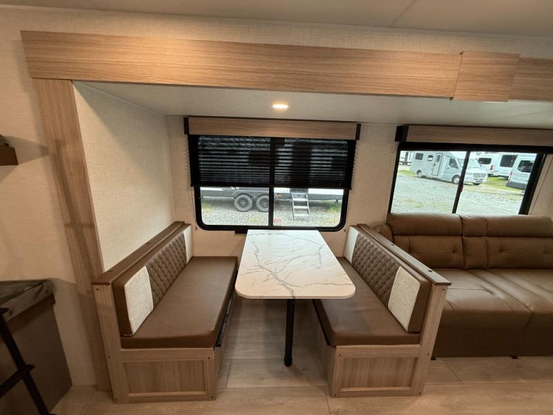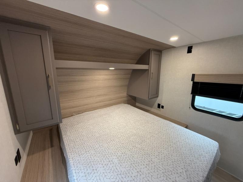 This bunkhouse model is perfect for your whole crew! Your guests or little ones will love the double-size bunk, while you take the queen bed in the front private bedroom. The large slide out will create an open living area, and here you'll find the 70" jackknife sofa and 41" booth dinette, both of which can also convert to extra sleeping space. The full bath has its own exterior entry door for convenience, and the second entry door opens up to the main living area. There is plenty of storage space in this model, including a wardrobe/pantry in the kitchen, dual wardrobes in the bedroom, an exterior pass-through storage, and even an exterior trunk door under the bunks to easily fit in all your gear!