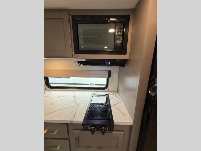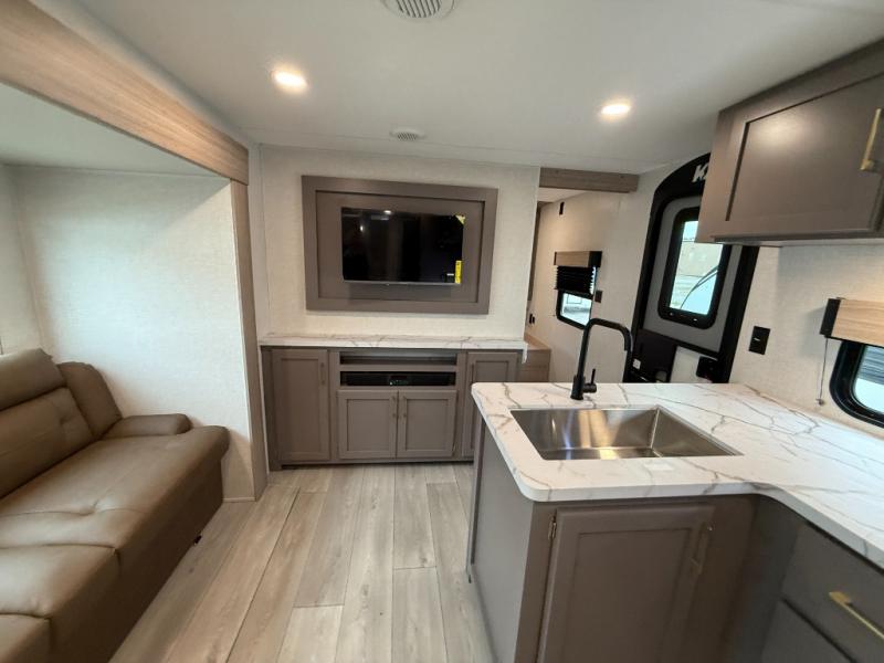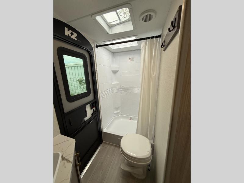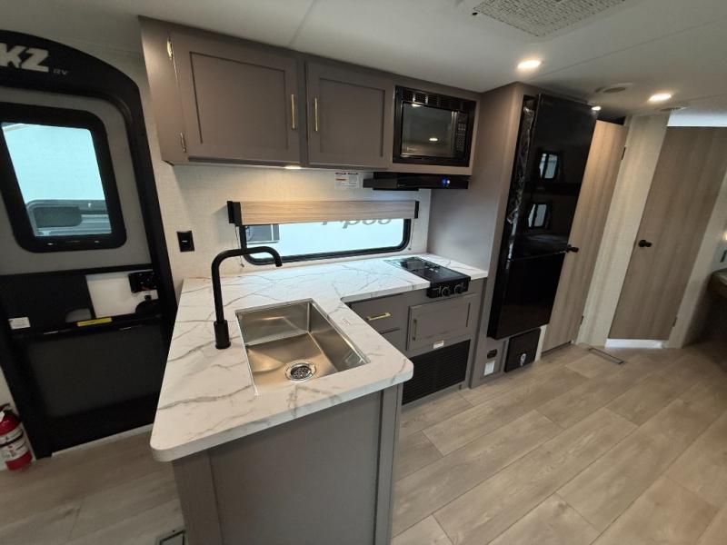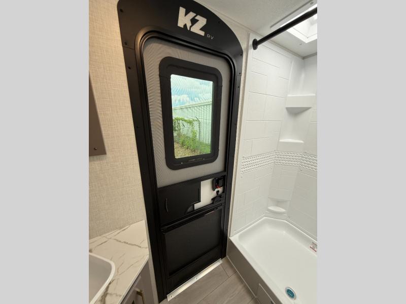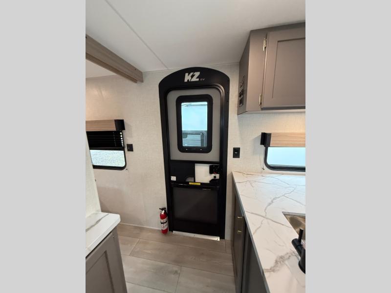 With any Sportsmen Select travel trailer by KZ, you will enjoy premium features at an affordable price, making them perfect for rookie RVers! Each model is constructed with an aerodynamic front profile with a smooth metal front for better fuel efficiency, and the nitrogen filled tires and power tongue jack will make towing easier then ever. There are is also a Key-Alike system for entry and baggage doors to keep your belongings secure, plus backup camera prep and solar roof prep means you can easily add these features to make camping that much smoother. An omnidirectional HDTV antenna with Wi-Fi prep will give you the option to stay connected as you camp, and a multi-media sound bar stereo with Bluetooth, HDMI and USB charge will ensure you'll never go bored on rainy days. The interior of these travel trailers include seamless countertops with a deep undermount stainless steel kitchen sink, a black residential kitchen faucet, wider pocket/passage doors, and residential grade linoleum.