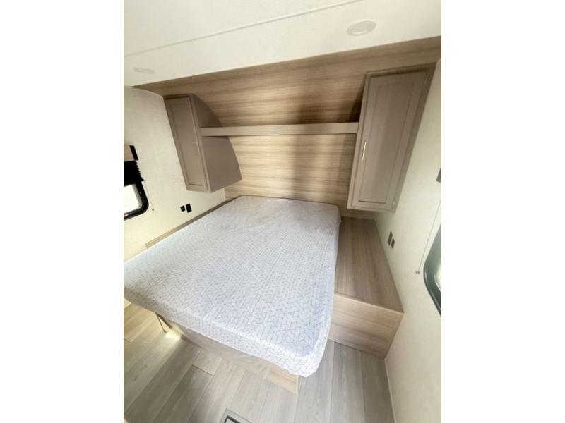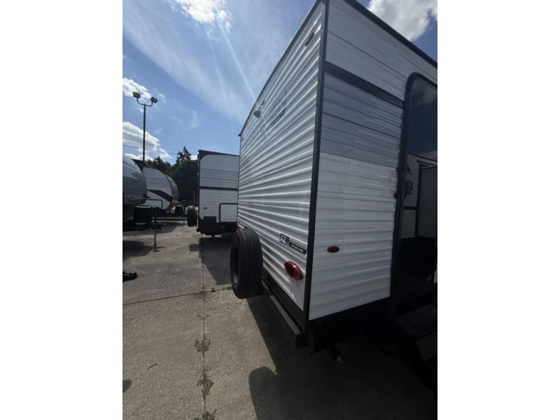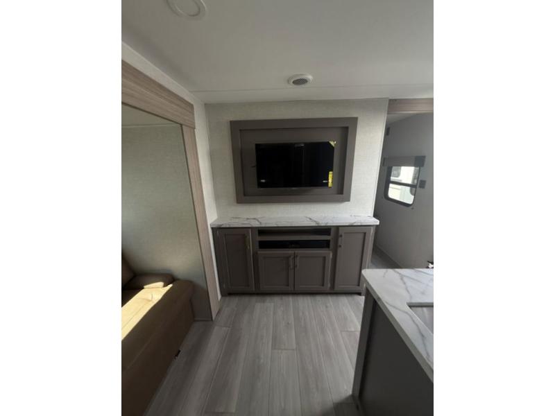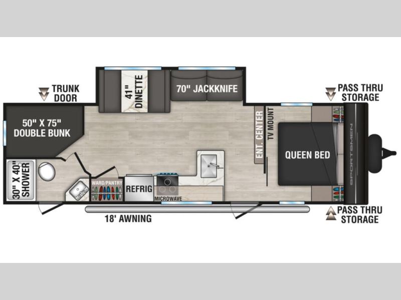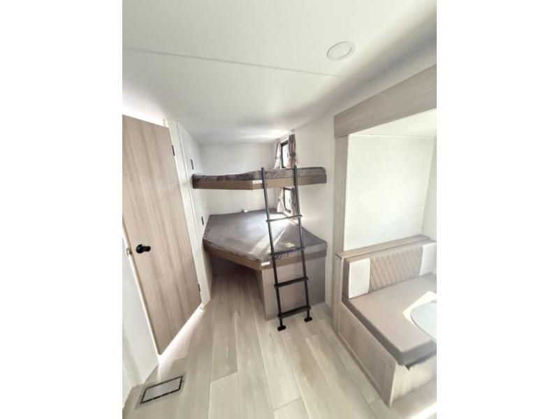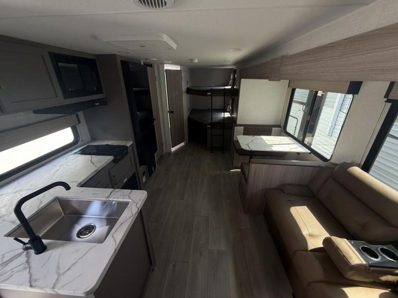 This bunkhouse model is perfect for your whole crew! Your guests or little ones will love the double-size bunks, while you take the queen bed in the front private bedroom. The large slide out will create an open living area, and here you'll find the 70" jackknife sofa and 41" booth dinette, both of which can also convert to extra sleeping space. The full bath has its own exterior entry door for convenience, and the second entry door opens up to the main living area. There is plenty of storage space in this model, including a wardrobe/pantry in the kitchen, dual wardrobes in the bedroom, an exterior pass-through storage, and even an exterior trunk door under the bunks to easily fit in all your gear!