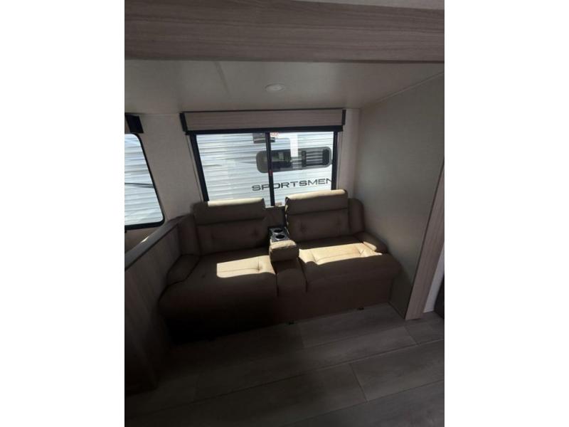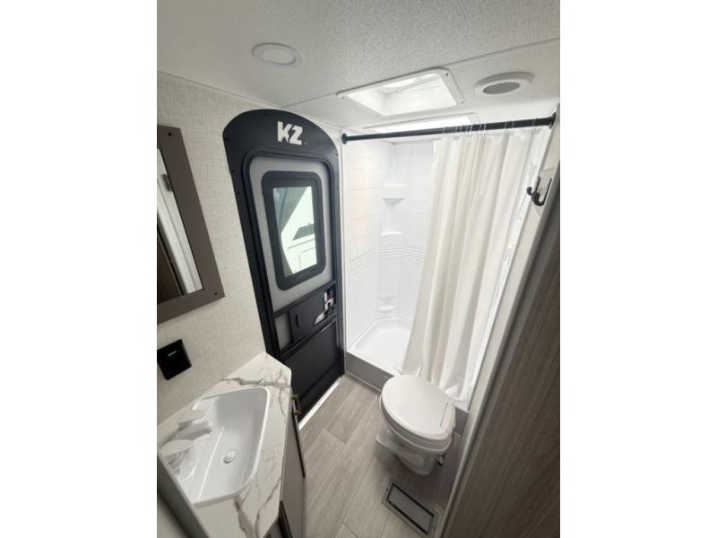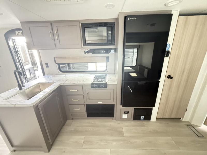 With any Sportsmen Select travel trailer by KZ, you will enjoy premium features at an affordable price, making them perfect for rookie RVers! Each model is constructed with an aerodynamic front profile with a smooth metal front for better fuel efficiency, and the nitrogen filled tires and power tongue jack will make towing easier than ever. There are is also a Key-Alike system for entry and baggage doors to keep your belongings secure, plus backup camera prep and solar roof prep means you can easily add these features to make camping that much smoother. An omnidirectional HDTV antenna with Wi-Fi prep will give you the option to stay connected as you camp, and a multi-media sound bar stereo with Bluetooth, HDMI and USB charge will ensure you'll never go bored on rainy days. The interior of these travel trailers include seamless countertops with a deep undermount stainless steel kitchen sink, a black residential kitchen faucet, wider pocket/passage doors, and residential grade linoleum.