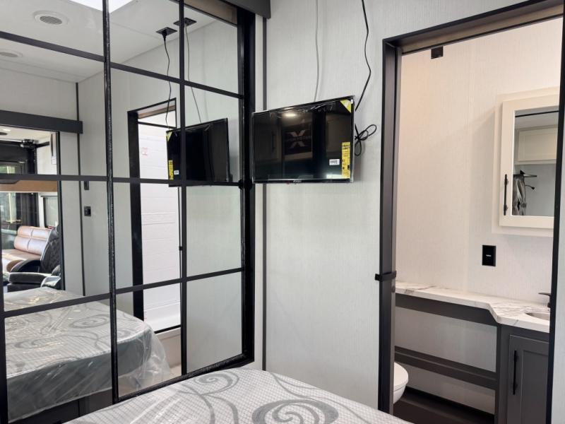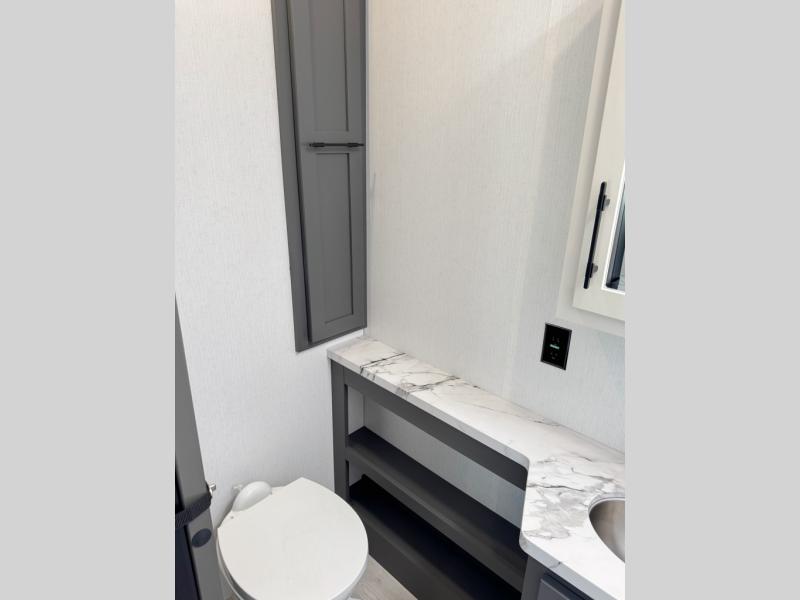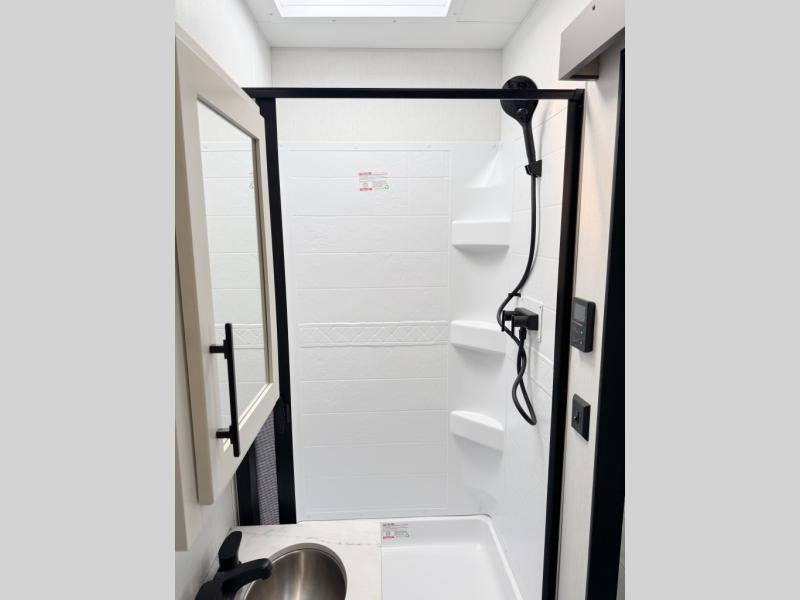 Retreat to the bedroom, where you'll find a plush queen bed, spacious wardrobe, and ample shelving for all your gear. The full bathroom features a generous 30” x 36” shower, perfect for washing away the dirt and grime of a day on the trails.