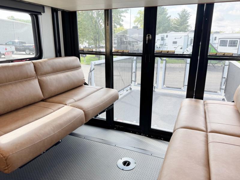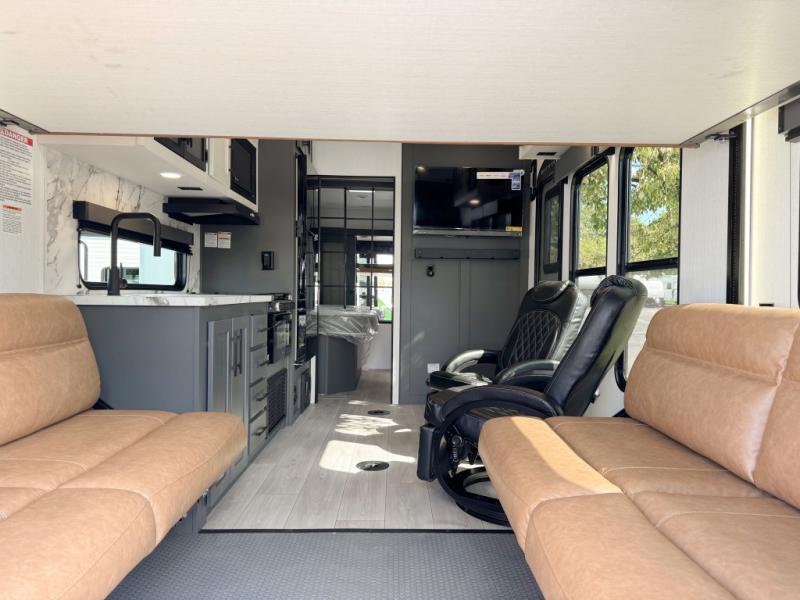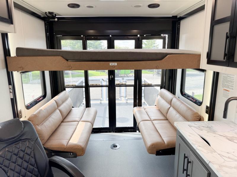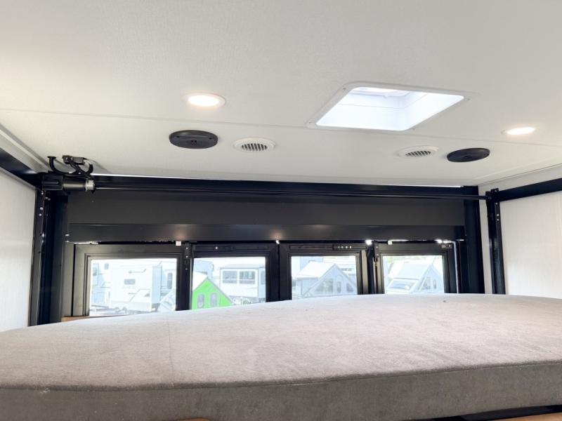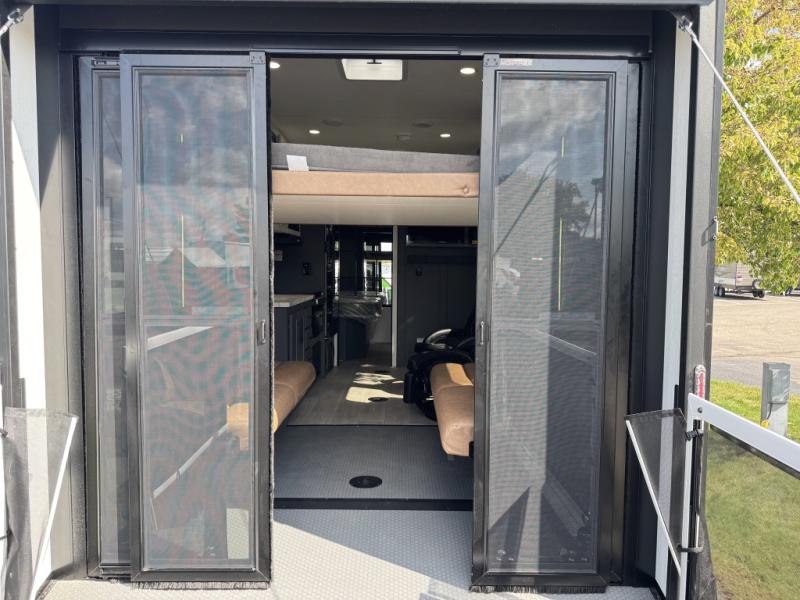 The kitchen/living room is the heart of the travel trailer toy hauler, equipped with a 12 cu refrigerator, microwave, and 32” TV for entertainment. The dual sofa provides comfortable seating for relaxing and socializing. But the real pièce de résistance is the power bed with seat, sleep, and laminated bed base. This innovative feature allows you to enjoy a comfortable bed for recharge energy after a long day. And when you're ready to take the party outside, simply open up the ramp door and enjoy the fresh air with the patio rail kit. Perfect for outdoor enthusiasts, this feature creates a seamless transition between indoors and outdoors.