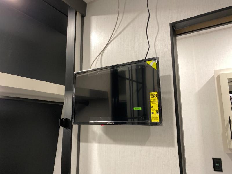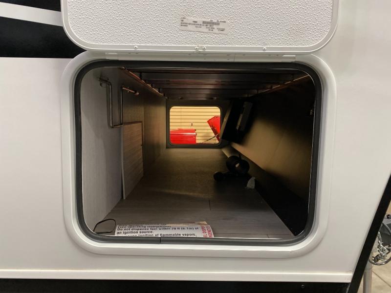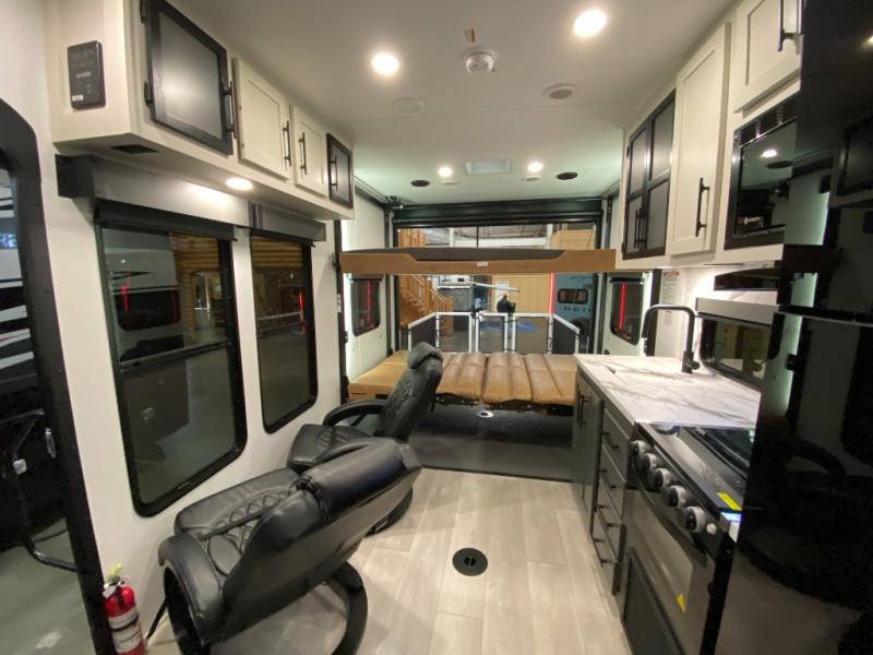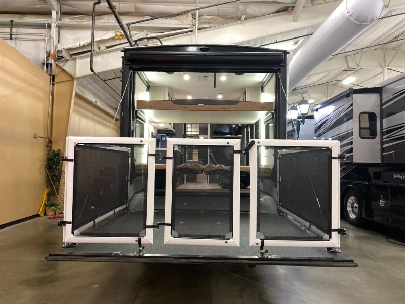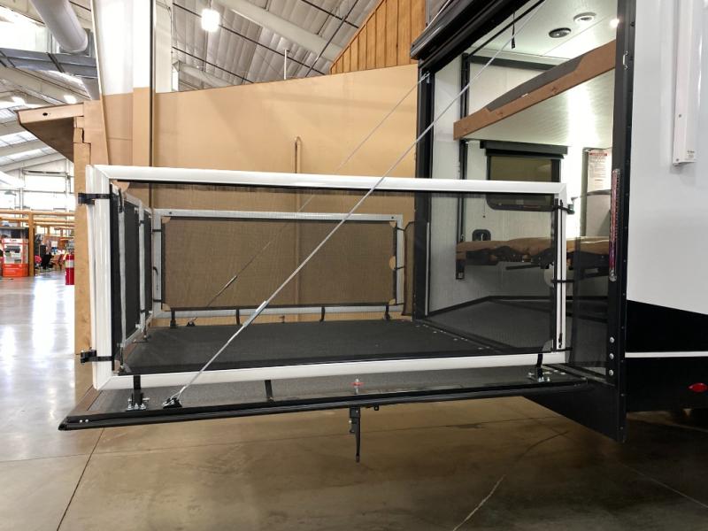 The kitchen/living room is the heart of the travel trailer toy hauler, equipped with a 12 cu refrigerator, microwave, and 32” TV for entertainment. The dual sofa provides comfortable seating for relaxing and socializing. But the real pièce de résistance is the power bed with seat, sleep, and laminated bed base. This innovative feature allows you to enjoy a comfortable bed for recharge energy after a long day. And when you're ready to take the party outside, simply open up the ramp door and enjoy the fresh air with the patio rail kit. Perfect for outdoor enthusiasts, this feature creates a seamless transition between indoors and outdoors.