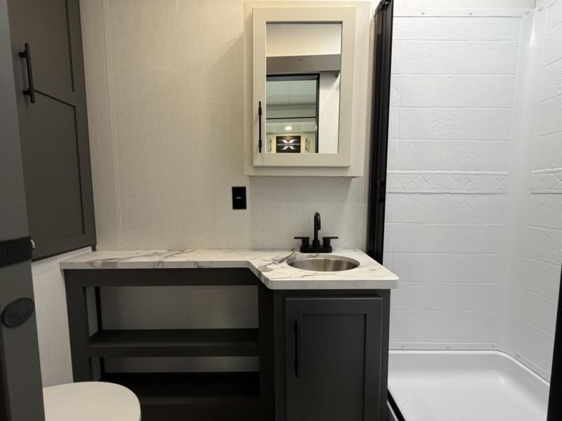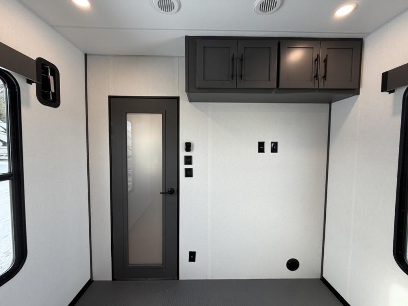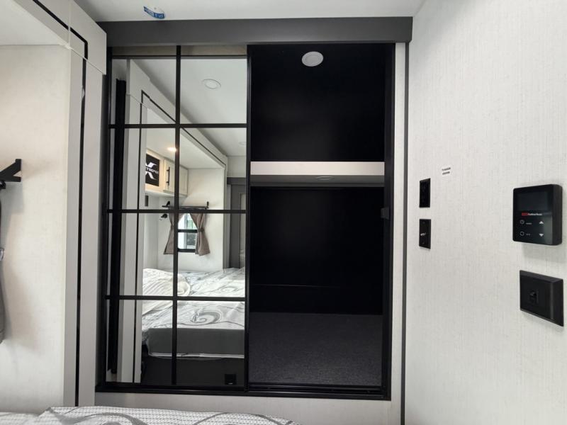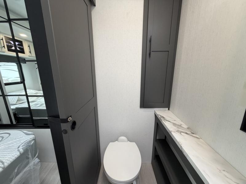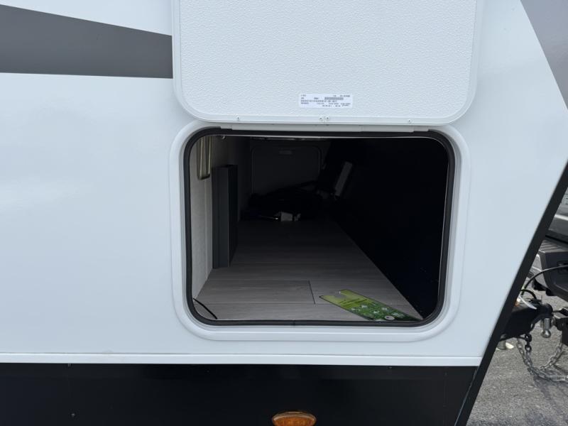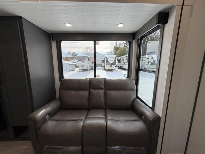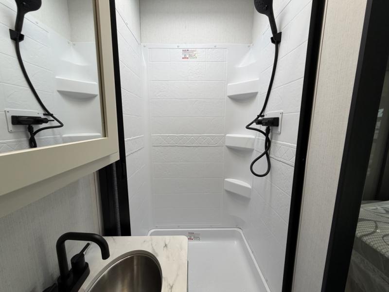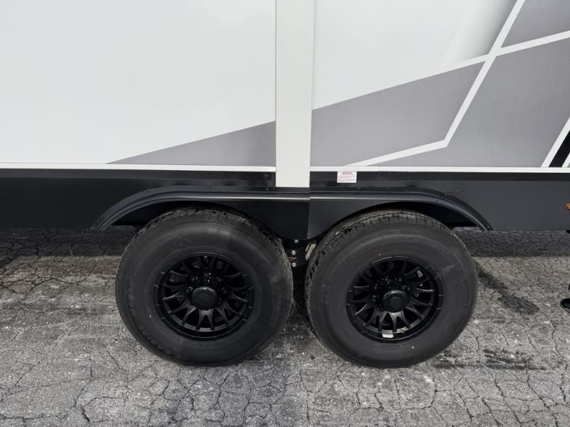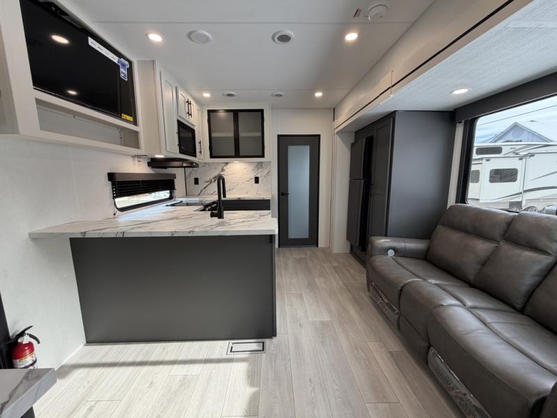Designed for thrill-seekers and families alike, this incredible RV offers the perfect blend of comfort, convenience, and fun. Retreat to the bedroom, where you'll find a queen bed, a spacious wardrobe, and ample shelving for all your gear. The full bathroom features a generous 30” x 36” shower, perfect for washing away the dirt and grime of a day on the trails. The kitchen/living room is the heart of the toy hauler, equipped with a 12 cu refrigerator, microwave, dual sofa, and pantry for all your favorite snacks. But the real excitement begins in the 13’ 6” garage, where you'll find a power bed with sit & sleep, and laminated bed base, perfect for converting the space into a spacious bedroom or play area. Plus, a TV mount for entertainment. When you're ready to take the party outside, simply open up the ramp door and enjoy the fresh air with our patio rail kit, or, fire up the outside kitchen and cook up a storm!