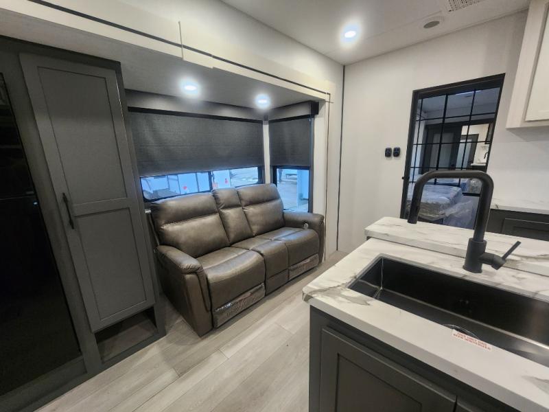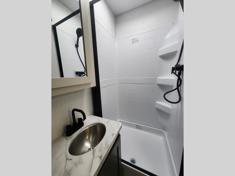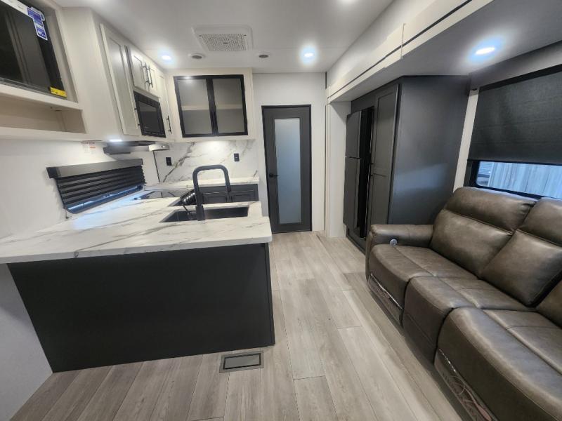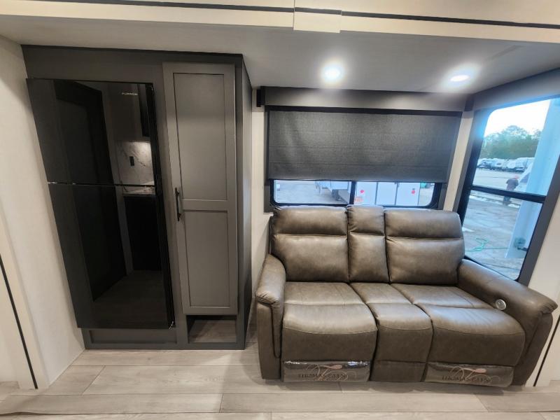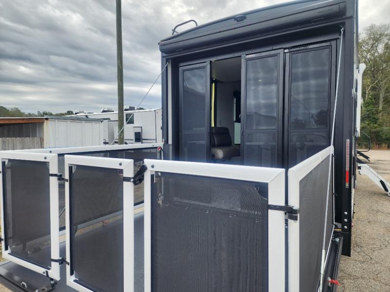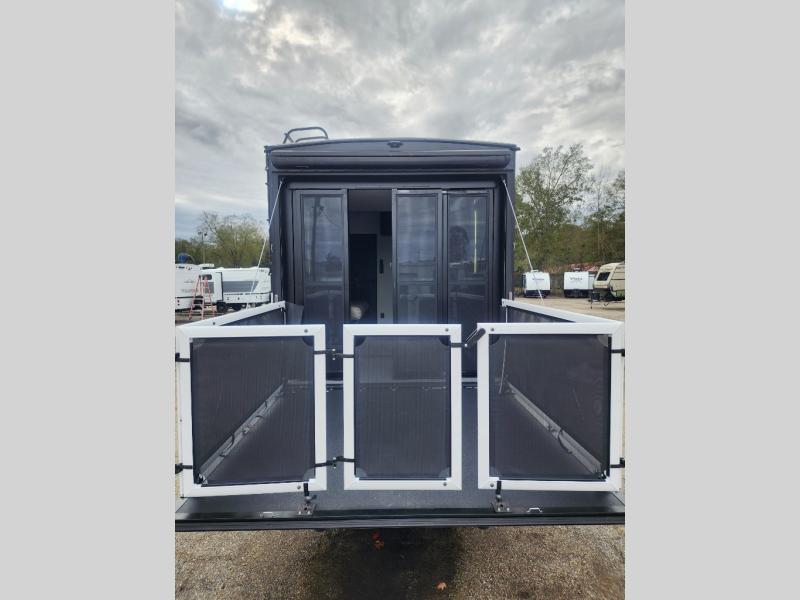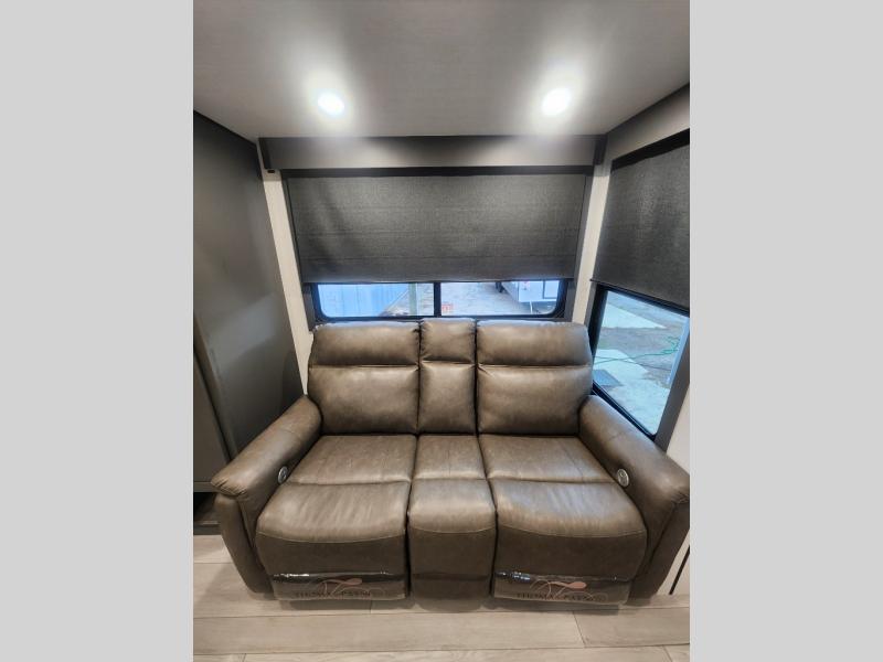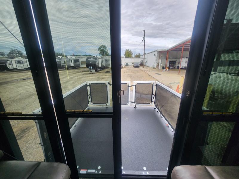 Designed for thrill-seekers and families alike, this incredible RV offers the perfect blend of comfort, convenience, and fun. Retreat to the bedroom, where you'll find a queen bed, a spacious wardrobe, and ample shelving for all your gear. The full bathroom features a generous 30” x 36” shower, perfect for washing away the dirt and grime of a day on the trails. The kitchen/living room is the heart of the toy hauler, equipped with a 12 cu refrigerator, microwave, dual sofa, and pantry for all your favorite snacks. But the real excitement begins in the 13’ 6” garage, where you'll find a power bed with sit & sleep, and laminated bed base, perfect for converting the space into a spacious bedroom or play area. Plus, a TV mount for entertainment. When you're ready to take the party outside, simply open up the ramp door and enjoy the fresh air with our patio rail kit, or, fire up the outside kitchen and cook up a storm!