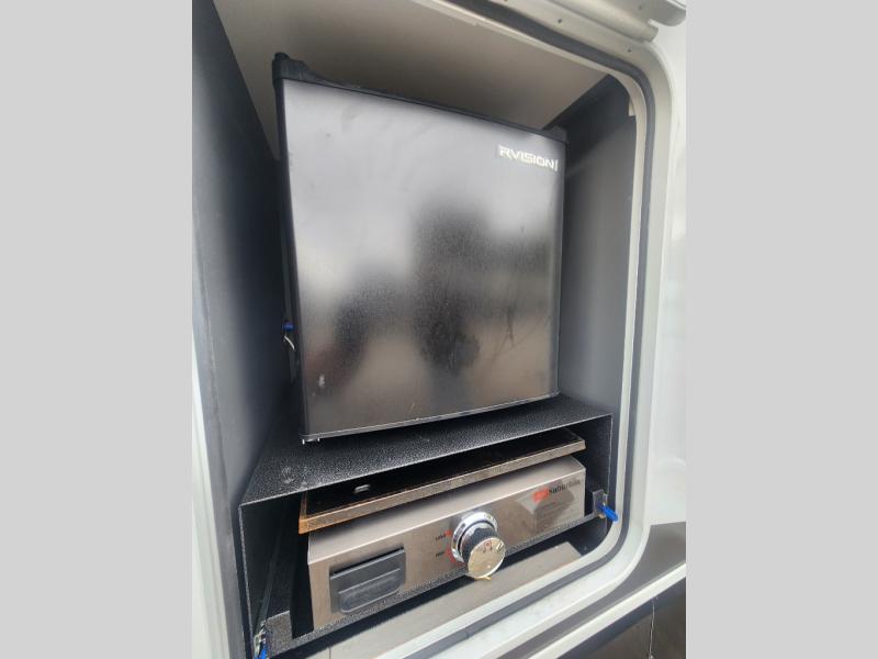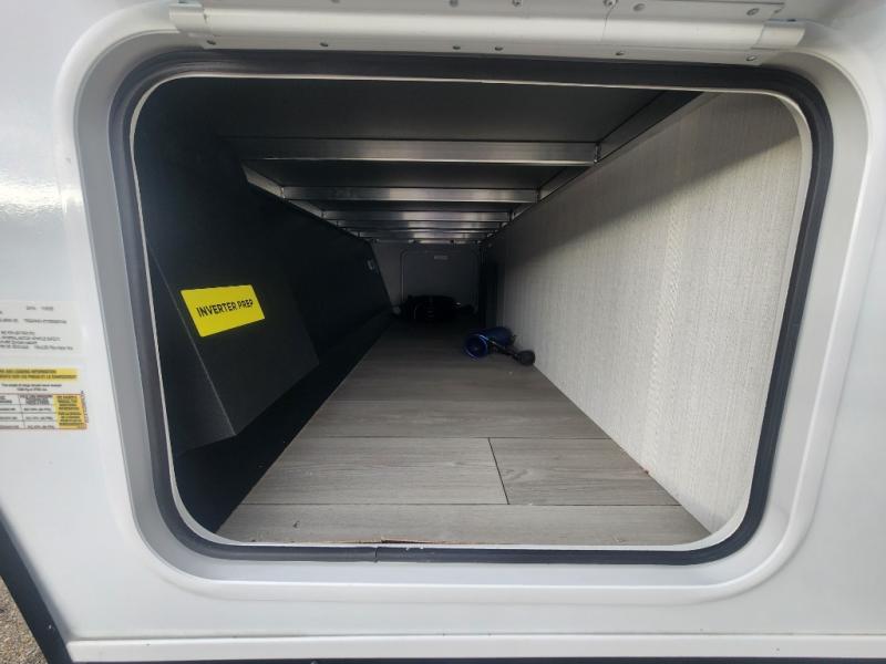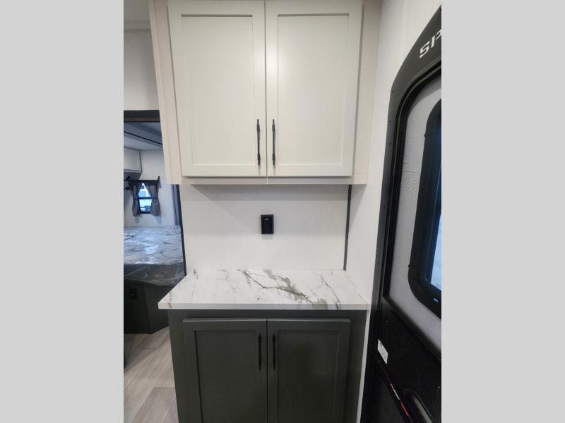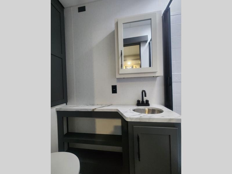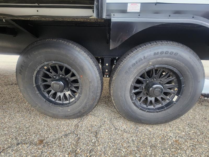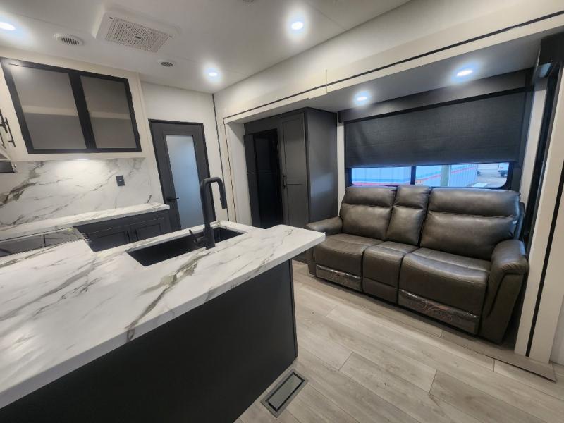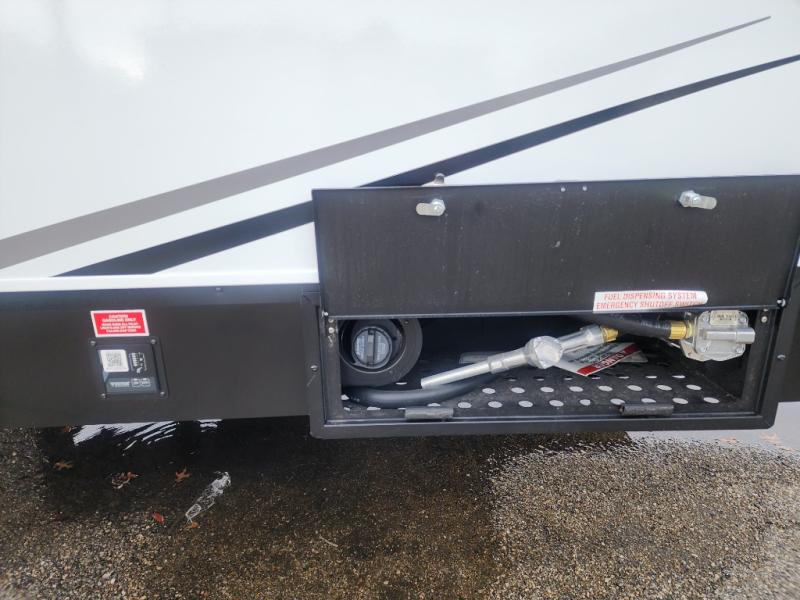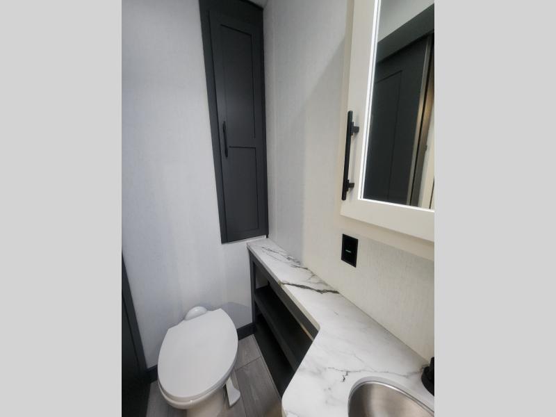 Designed for thrill-seekers and families alike, this incredible RV offers the perfect blend of comfort, convenience, and fun. Retreat to the bedroom, where you'll find a queen bed, a spacious wardrobe, and ample shelving for all your gear. The full bathroom features a generous 30” x 36” shower, perfect for washing away the dirt and grime of a day on the trails. The kitchen/living room is the heart of the toy hauler, equipped with a 12 cu refrigerator, microwave, dual sofa, and pantry for all your favorite snacks. But the real excitement begins in the 13’ 6” garage, where you'll find a power bed with sit & sleep, and laminated bed base, perfect for converting the space into a spacious bedroom or play area. Plus, a TV mount for entertainment. When you're ready to take the party outside, simply open up the ramp door and enjoy the fresh air with our patio rail kit, or, fire up the outside kitchen and cook up a storm!