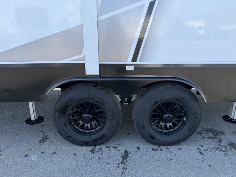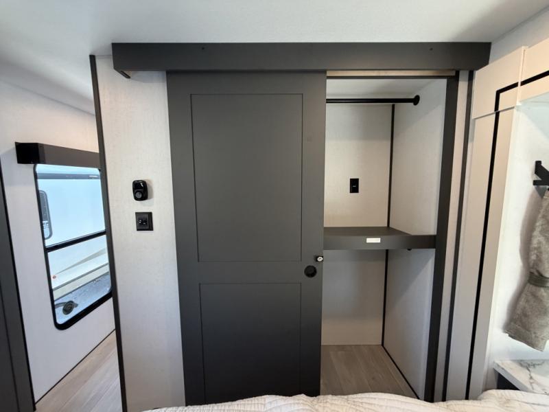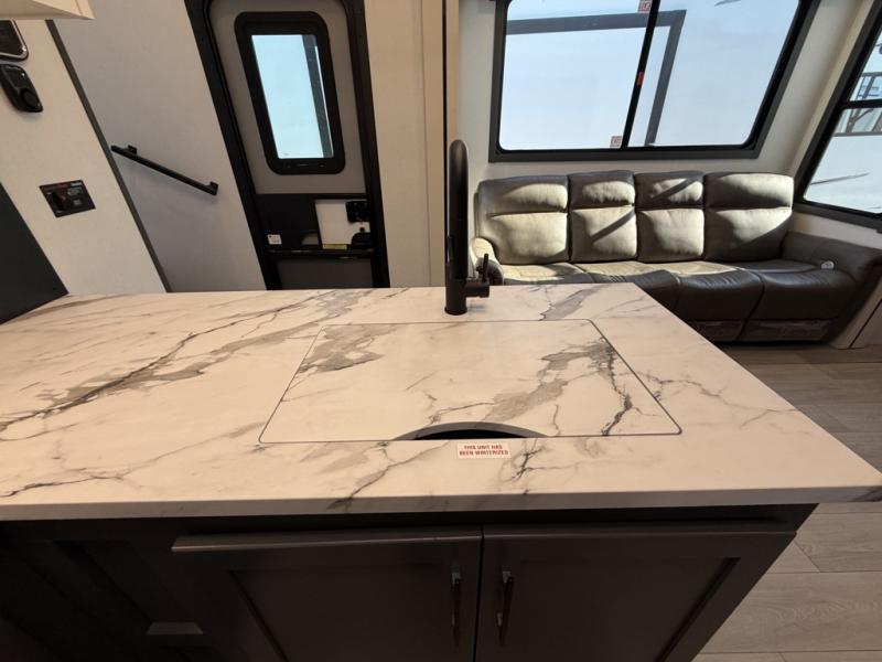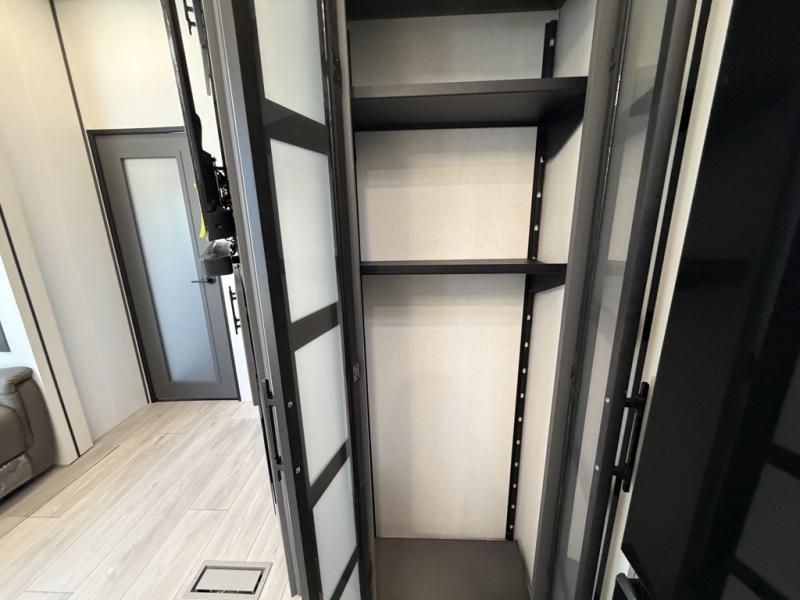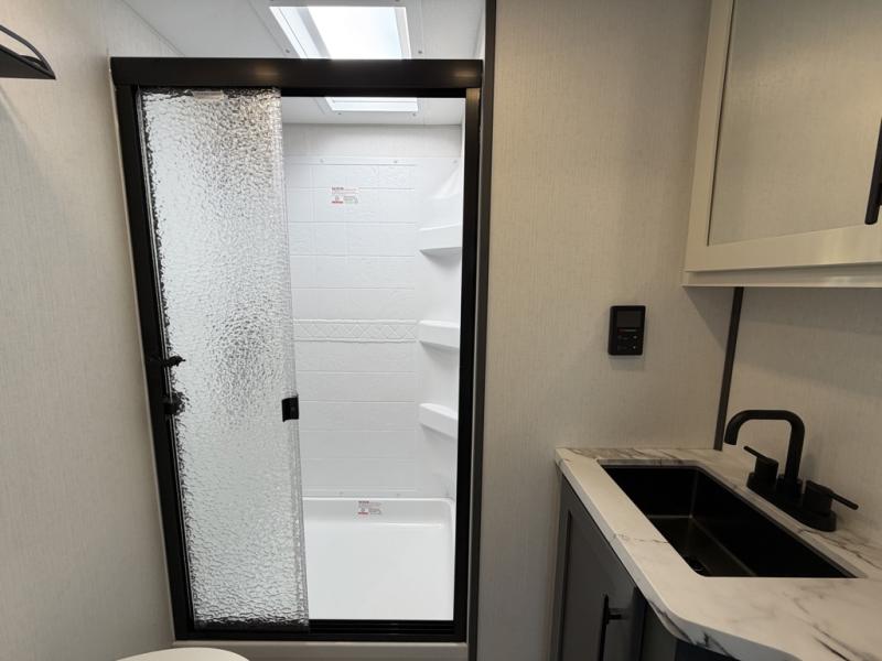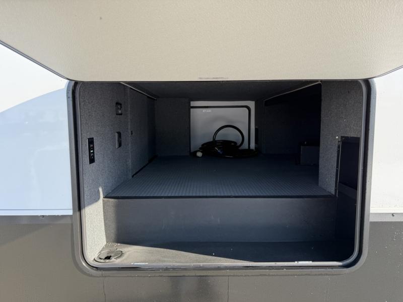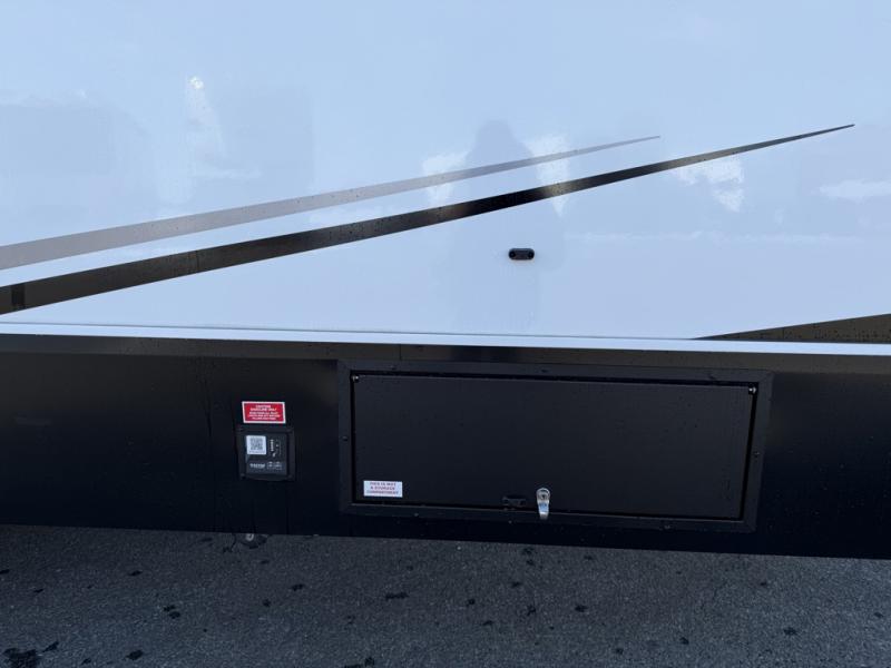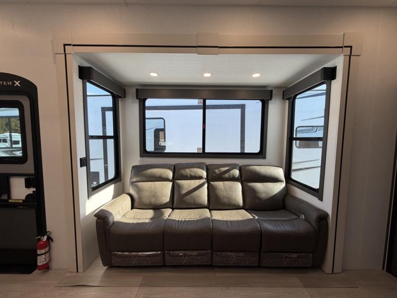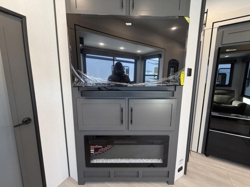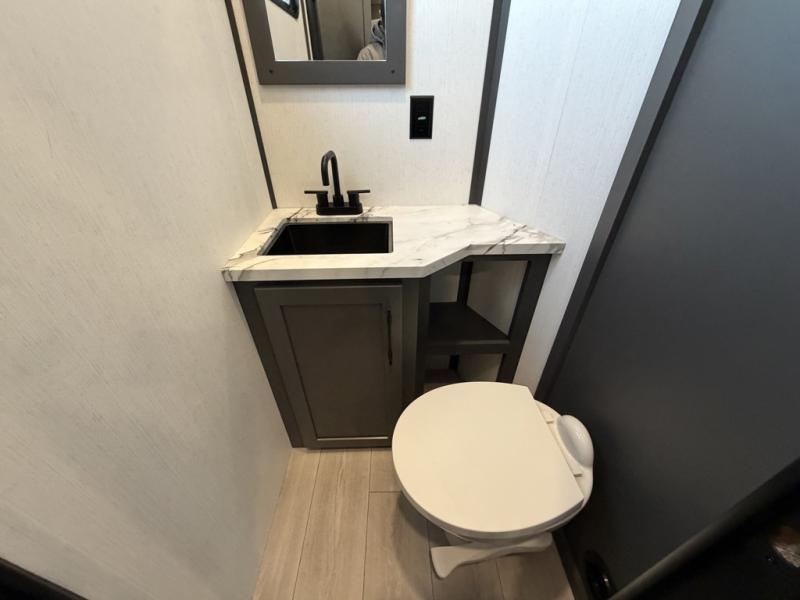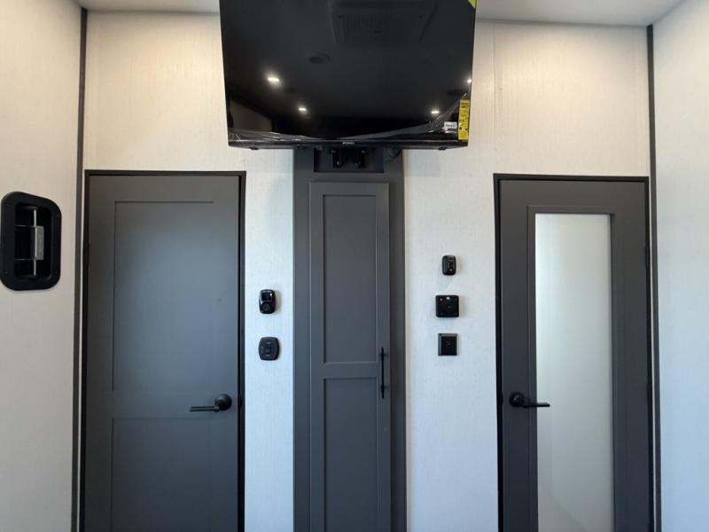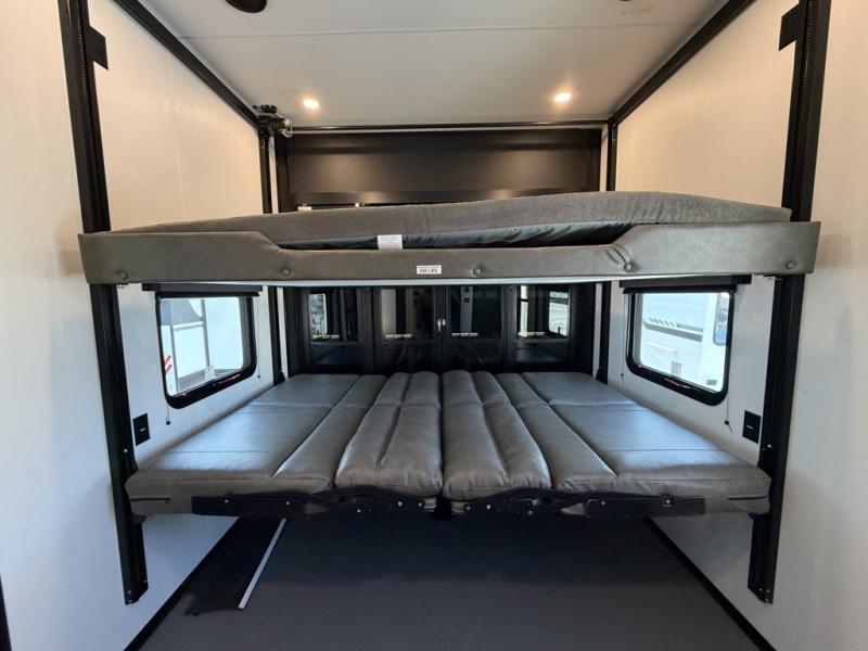 Designed with the ultimate adventurer in mind, this luxurious toy hauler fifth wheel offers the perfect blend of comfort, convenience, and fun. The front bedroom is a serene retreat, featuring a plush queen bed and a dresser with hidden storage for all your valuables. The full bathroom is a spacious oasis, complete with a generous 30” x 36” shower. The kitchen/living room is the heart of the fifth wheel toy hauler, equipped with a 16 cu refrigerator, microwave, super theater sofa, pantry, entertainment center, and a convenient half bathroom. Whether you're cooking up a storm or relaxing with family and friends, this space has everything you need. The 11’ garage is the ultimate playground, featuring a power bed, with laminated bed base, and a 32" x 96" loft bed. Finally, when you're ready to take the party outside, simply open up the ramp door and enjoy the fresh air with our patio rail kit. Relax in the shade with our massive 11’ & 15’ awnings, perfect for outdoor entertaining.