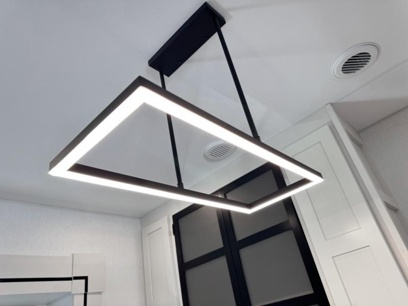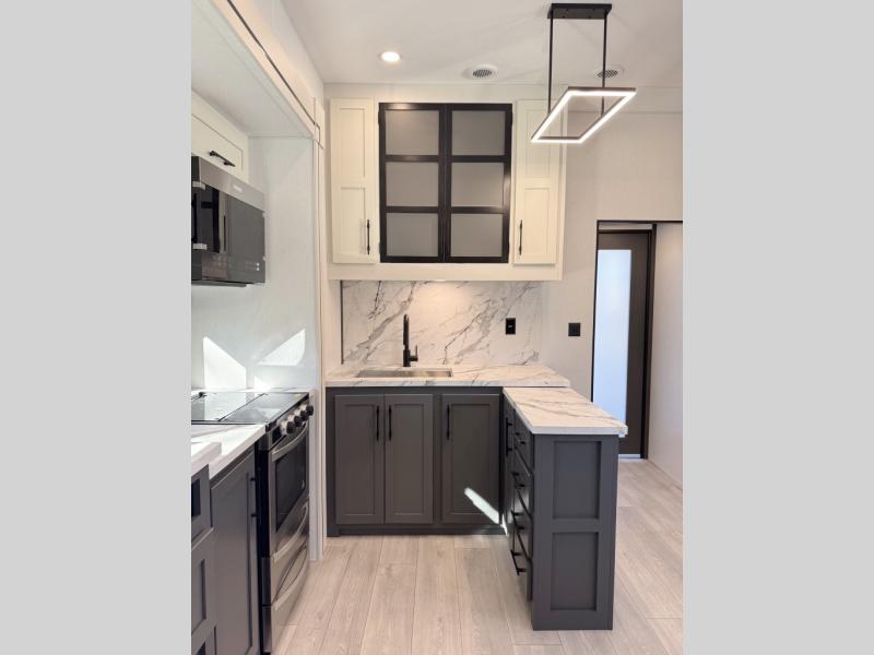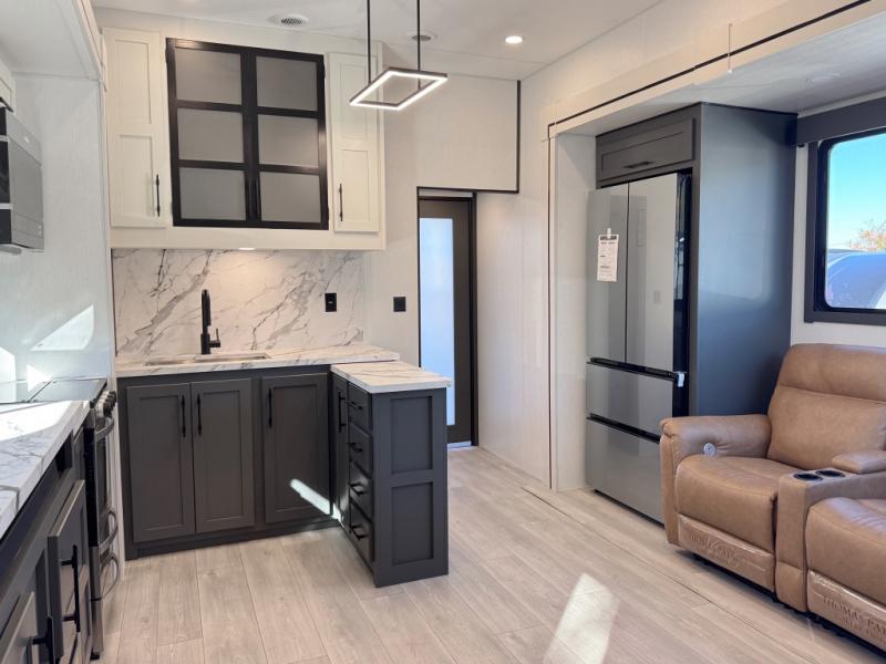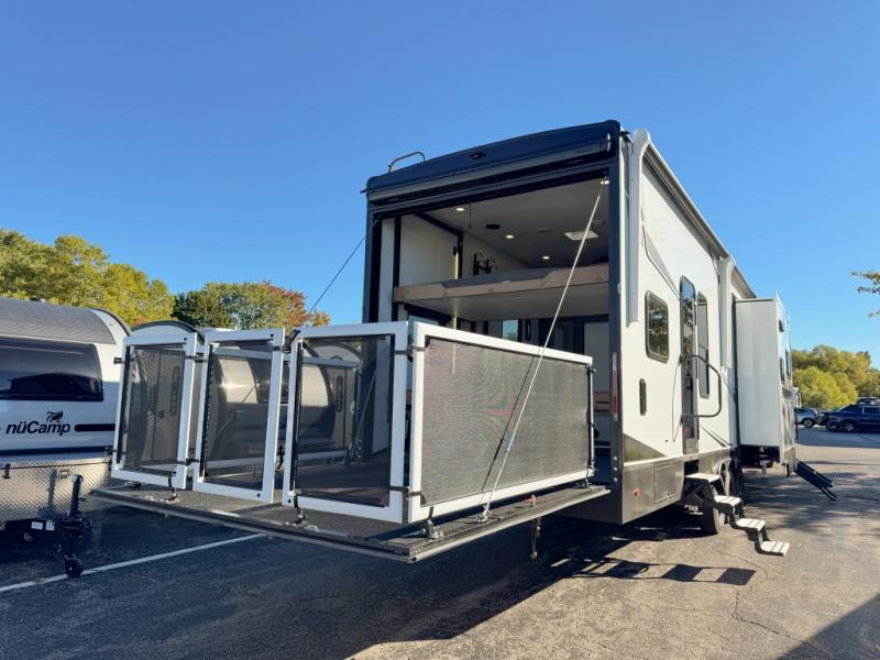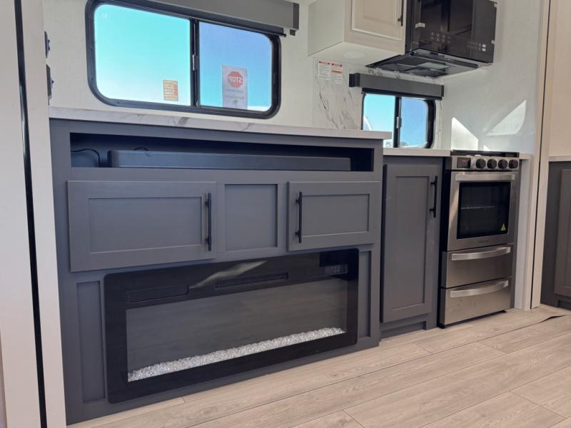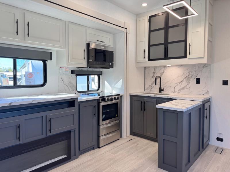 This fifth-wheel toy hauler is the perfect vehicle for unwinding on the road. The front bedroom boasts a plush queen bed, dresser with hidden storage, and washer and dryer prep for added convenience. The full bathroom is complete with a generous 30” x 36” shower. The kitchen is a culinary dream, equipped with a 16 cu refrigerator, microwave, 3-burner cooktop, and pantry for all your favorite snacks. The living room is the perfect place to relax and entertain featuring theater seating, a spacious 64” sofa, a cozy fireplace, and an LED TV for movie nights. The 13’ 6” garage is the ultimate playground, featuring a 60” x 84” power bed with seat & sleep, and a laminated bed base, perfect for converting the space into a spacious bedroom or play area. Plus, a 32” x 96” loft bed for added sleeping capacity. Step outside and enjoy the fresh air with our patio rail kit, perfect for outdoor entertaining, and enjoy nature in the shade with our massive 14’ & 20’ awnings, and get ready to take your adventures to new heights!