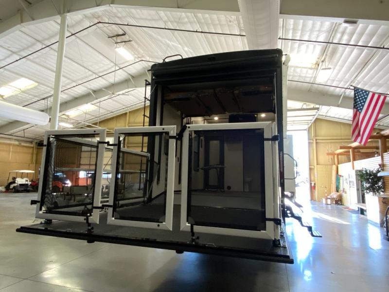 This fifth-wheel toy hauler is the perfect vehicle for unwinding on the road. The front bedroom boasts a plush queen bed, dresser with hidden storage, and washer and dryer prep for added convenience. The full bathroom is complete with a generous 30” x 36” shower. The kitchen is a culinary dream, equipped with a 16 cu refrigerator, microwave, 3-burner cooktop, and pantry for all your favorite snacks. The living room is the perfect place to relax and entertain featuring theater seating, a spacious 64” sofa, a cozy fireplace, and an LED TV for movie nights. The 13’ 6” garage is the ultimate playground, featuring a 60” x 84” power bed with seat & sleep, and a laminated bed base, perfect for converting the space into a spacious bedroom or play area. Plus, a 32” x 96” loft bed for added sleeping capacity. Step outside and enjoy the fresh air with our patio rail kit, perfect for outdoor entertaining, and enjoy nature in the shade with our massive 14’ & 20’ awnings, and get ready to take your adventures to new heights!