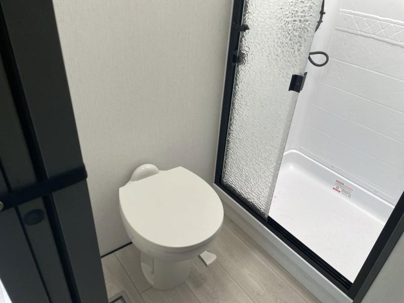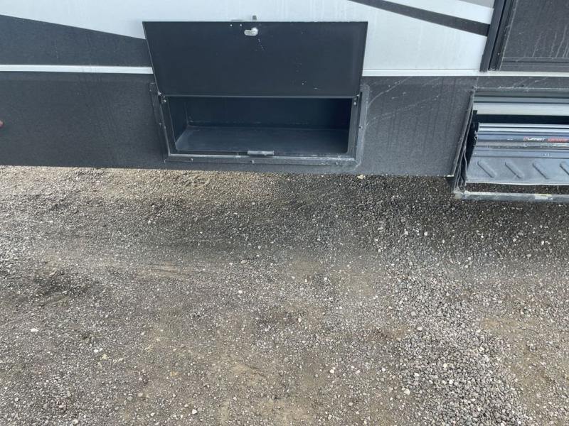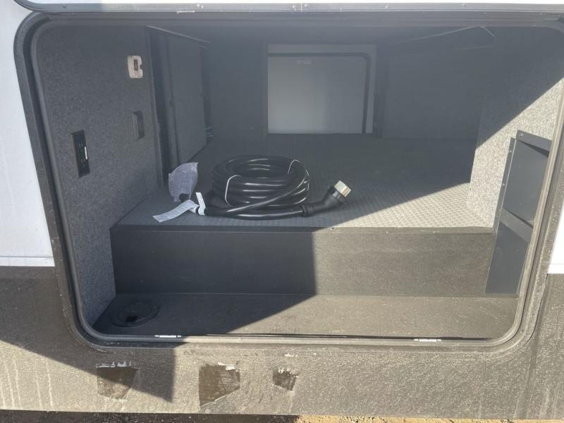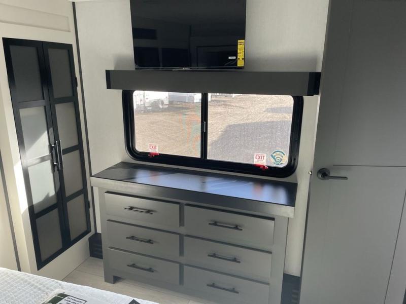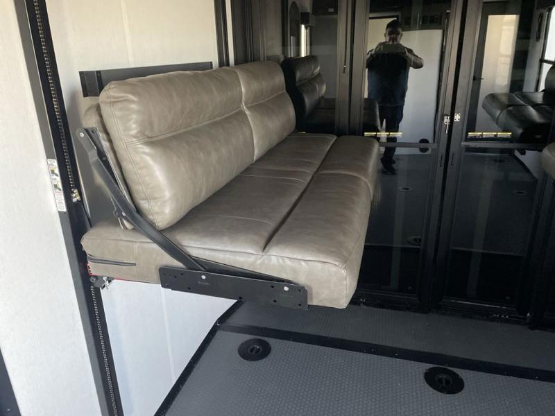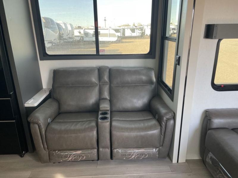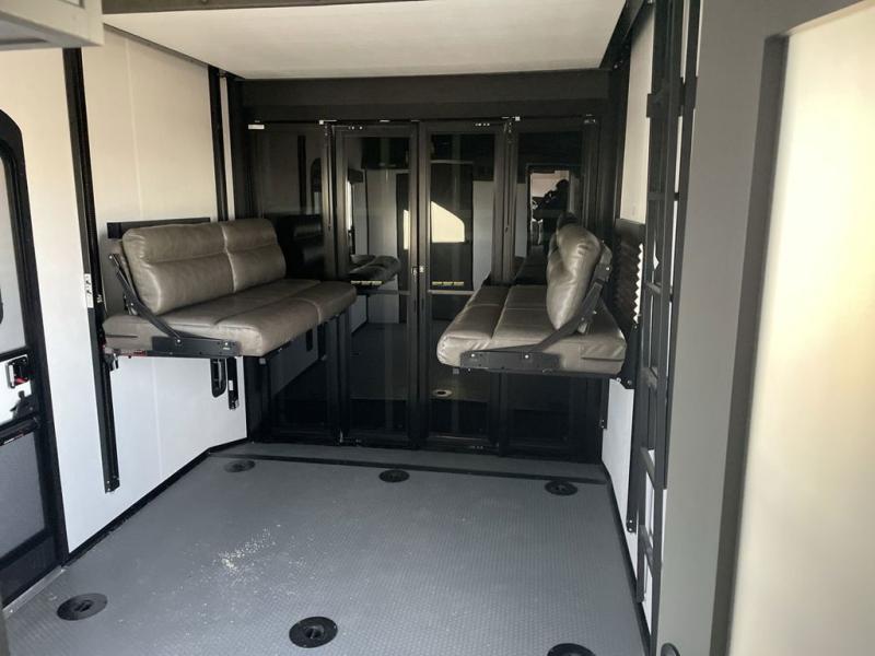 This fifth-wheel toy hauler is the perfect vehicle for unwinding on the road. The front bedroom boasts a plush queen bed, dresser with hidden storage, and washer and dryer prep for added convenience. The full bathroom is complete with a generous 30” x 36” shower. The kitchen is a culinary dream, equipped with a 16 cu refrigerator, microwave, 3-burner cooktop, and pantry for all your favorite snacks. The living room is the perfect place to relax and entertain featuring theater seating, a spacious 64” sofa, a cozy fireplace, and an LED TV for movie nights. The 13’ 6” garage is the ultimate playground, featuring a 60” x 84” power bed with seat & sleep, and a laminated bed base, perfect for converting the space into a spacious bedroom or play area. Plus, a 32” x 96” loft bed for added sleeping capacity. Step outside and enjoy the fresh air with our patio rail kit, perfect for outdoor entertaining, and enjoy nature in the shade with our massive 14’ & 20’ awnings, and get ready to take your adventures to new heights!